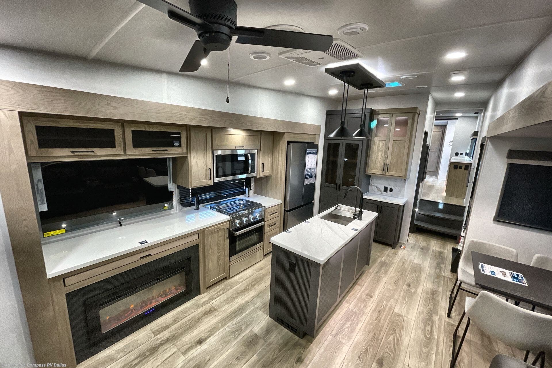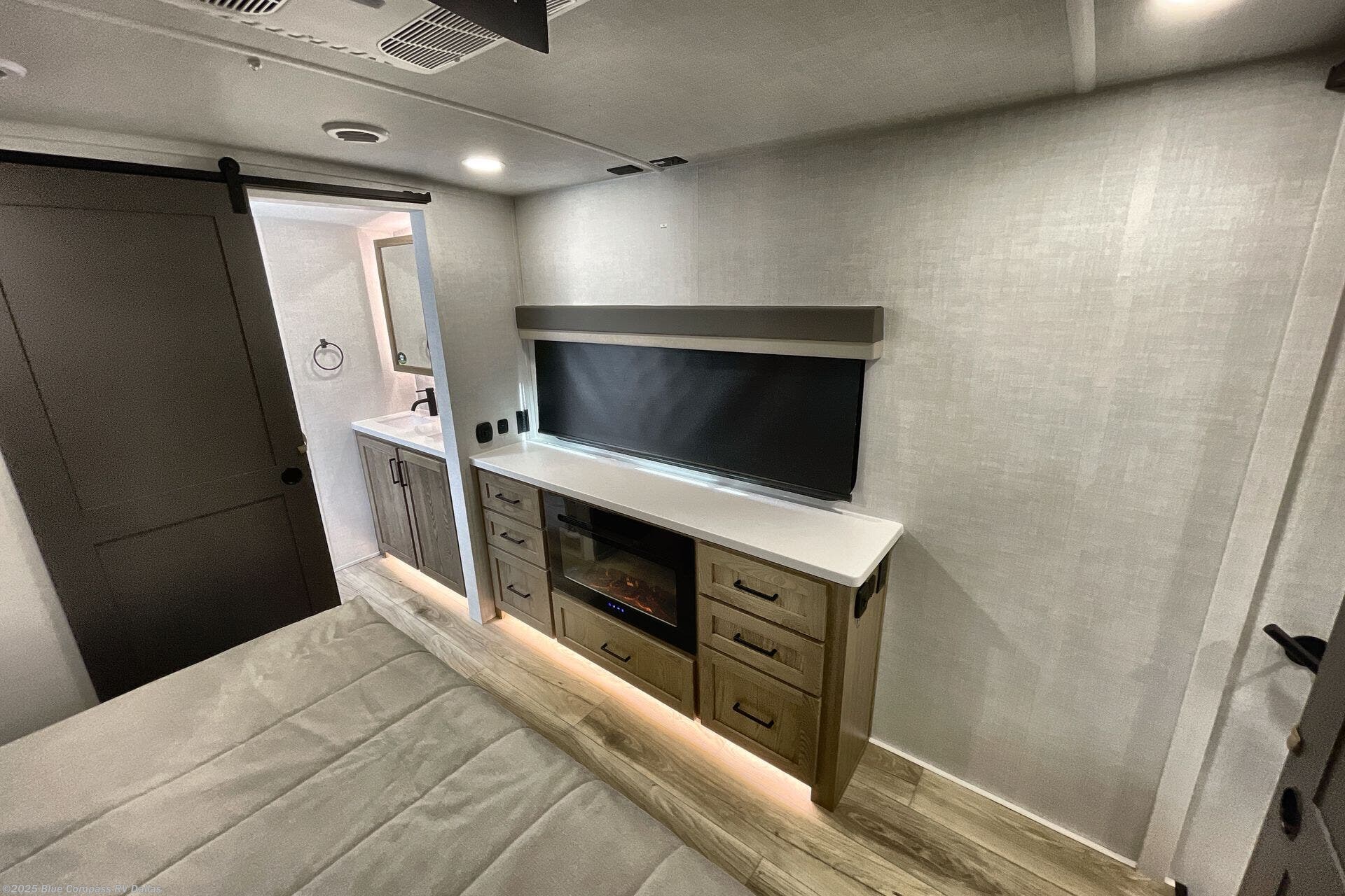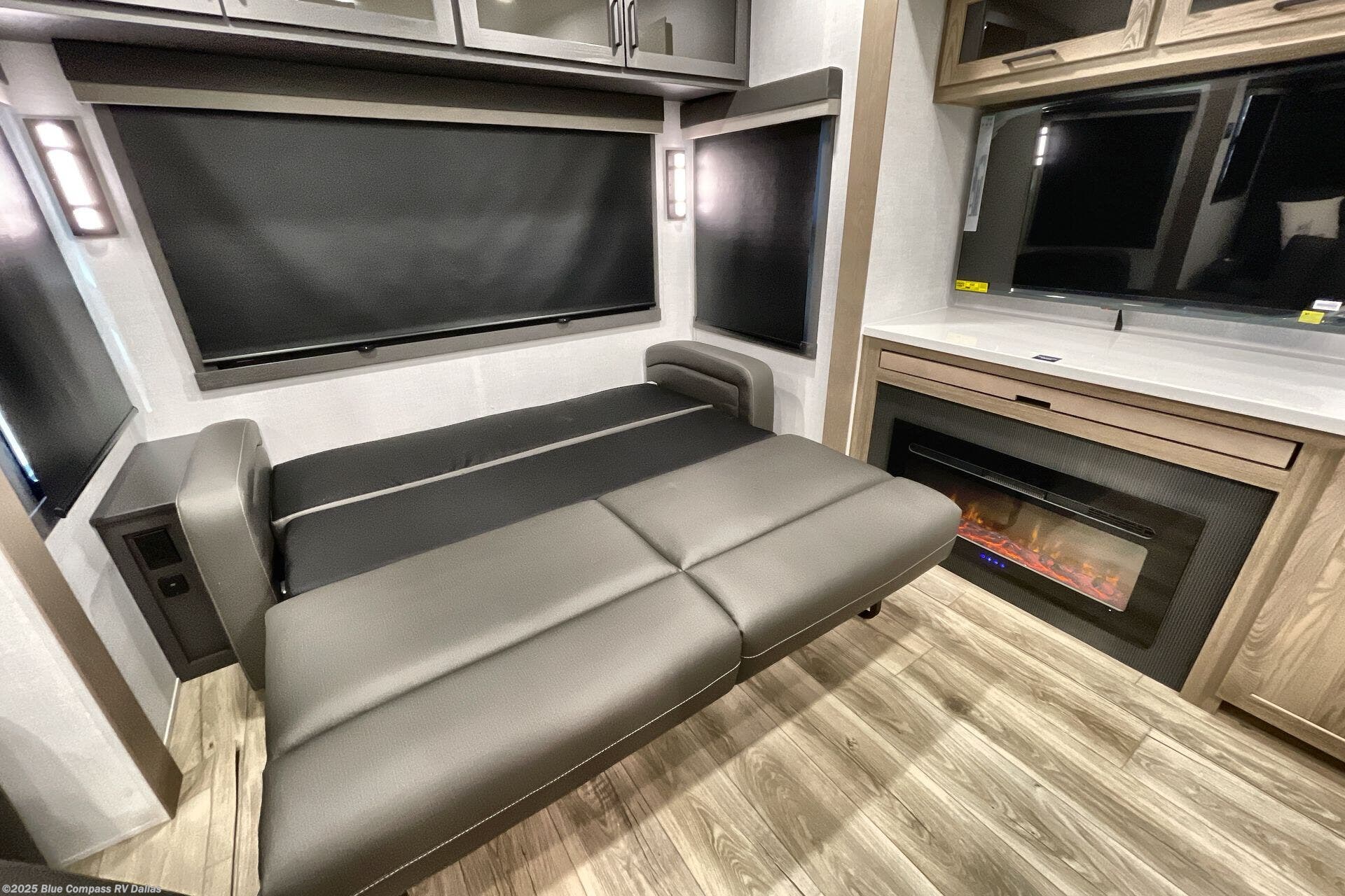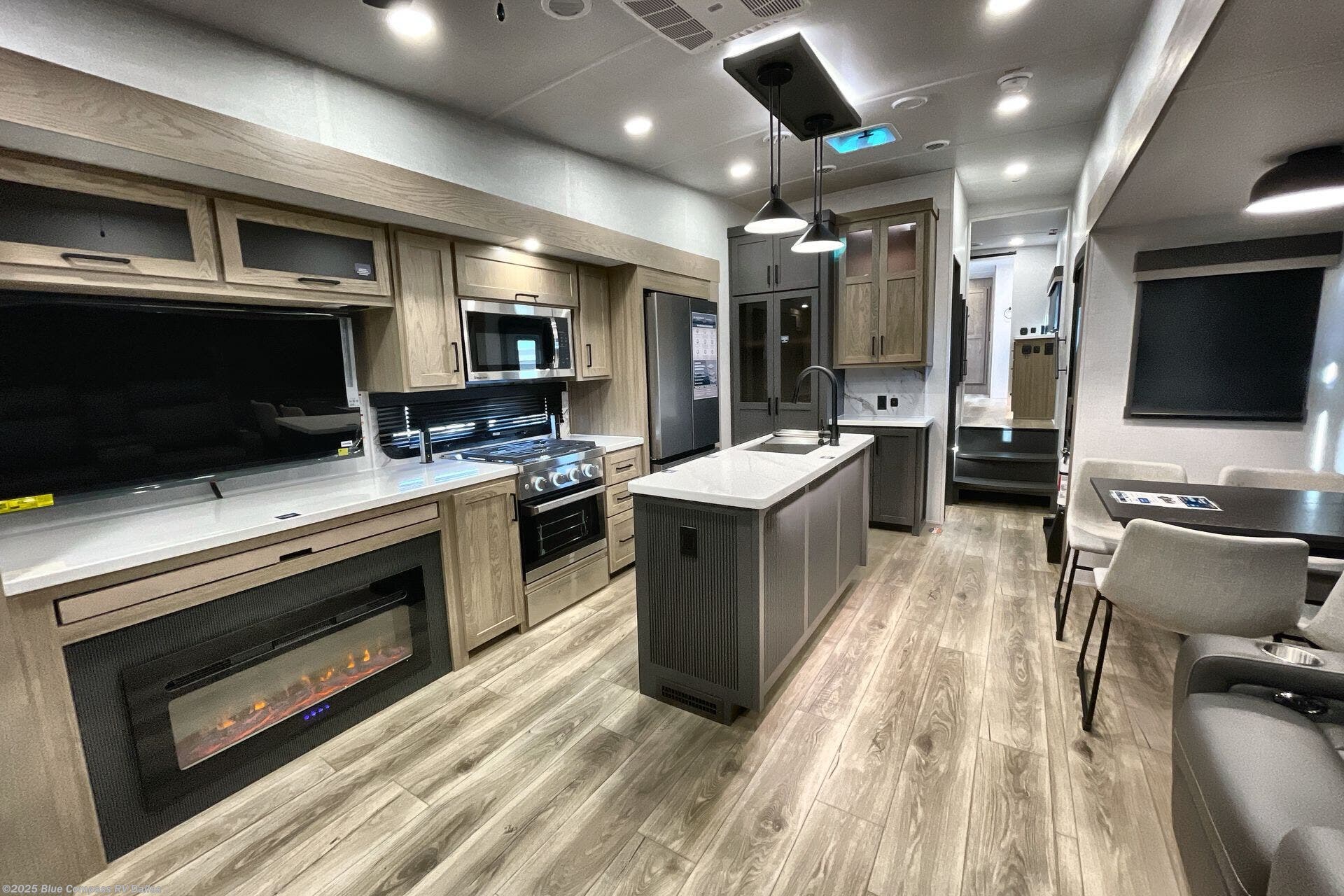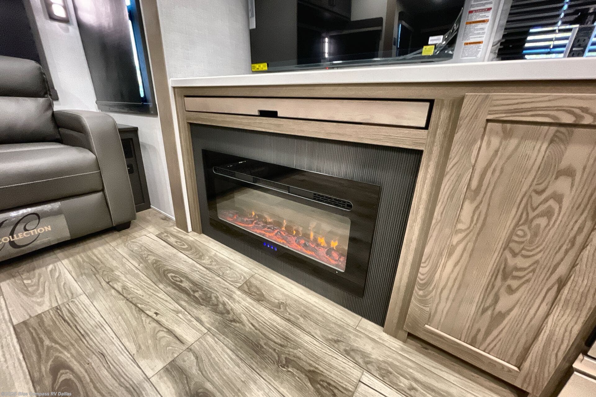 You can't go wrong when choosing this spacious fifth wheel! The master bedroom features a king bed slide out, wardrobe, and a dresser with a fireplace, and the full front bath is sure to bring comfort. There are dual bath sinks here, tons of storage, and even washer and dryer prep if you choose to add these appliances. The mid-coach half bath will come in handy if you have guests staying over on the rear hide-a-bed sofa. You'll also find a theater seat and a rotating table and chairs where you can dine and relax each day, plus there is a large kitchen island so the chef of your group has plenty of prep space. A Smart TV and fireplace will make your space feel more like home, and there is a pull-out desk here if you need to get some work done!