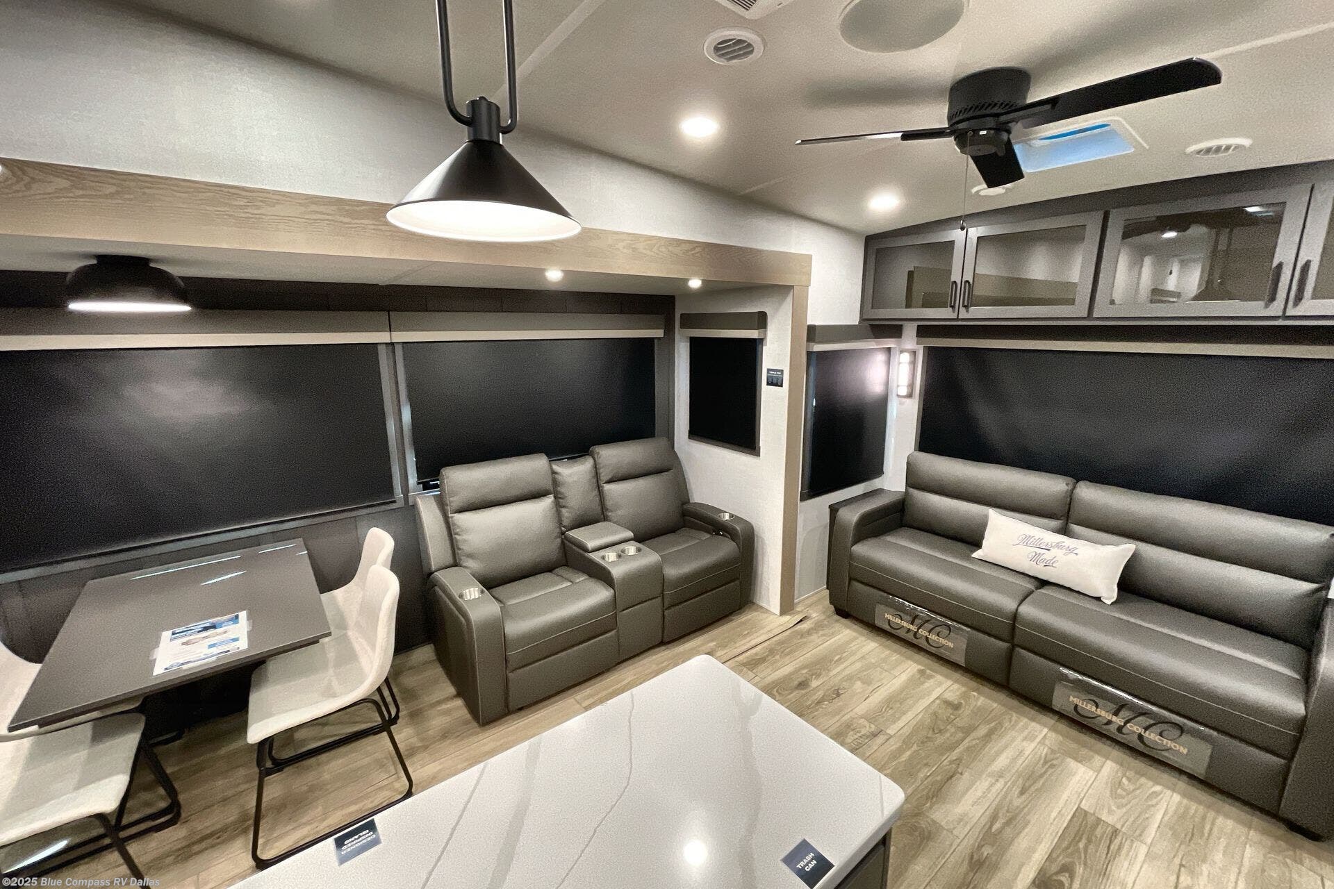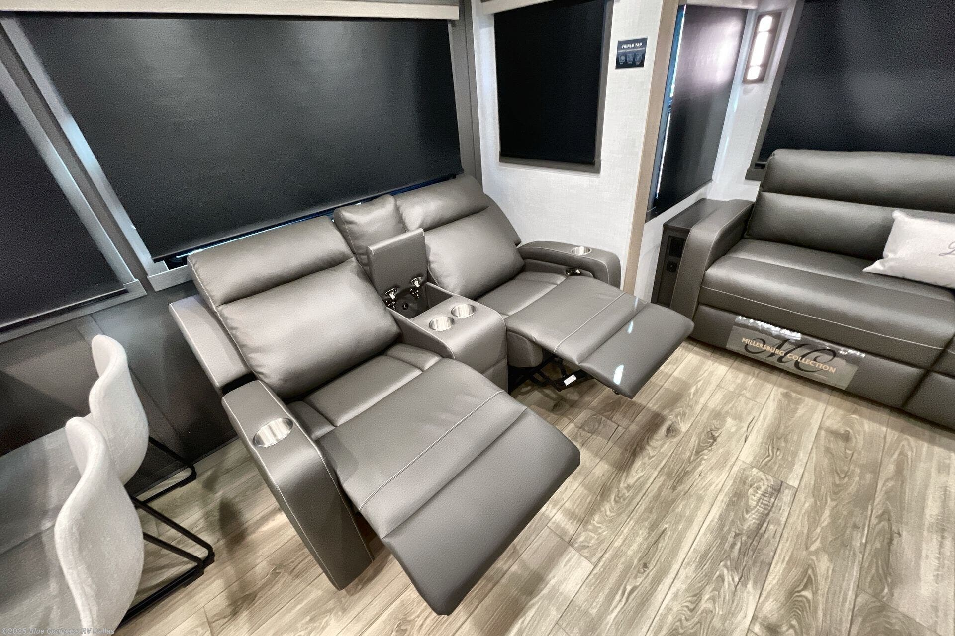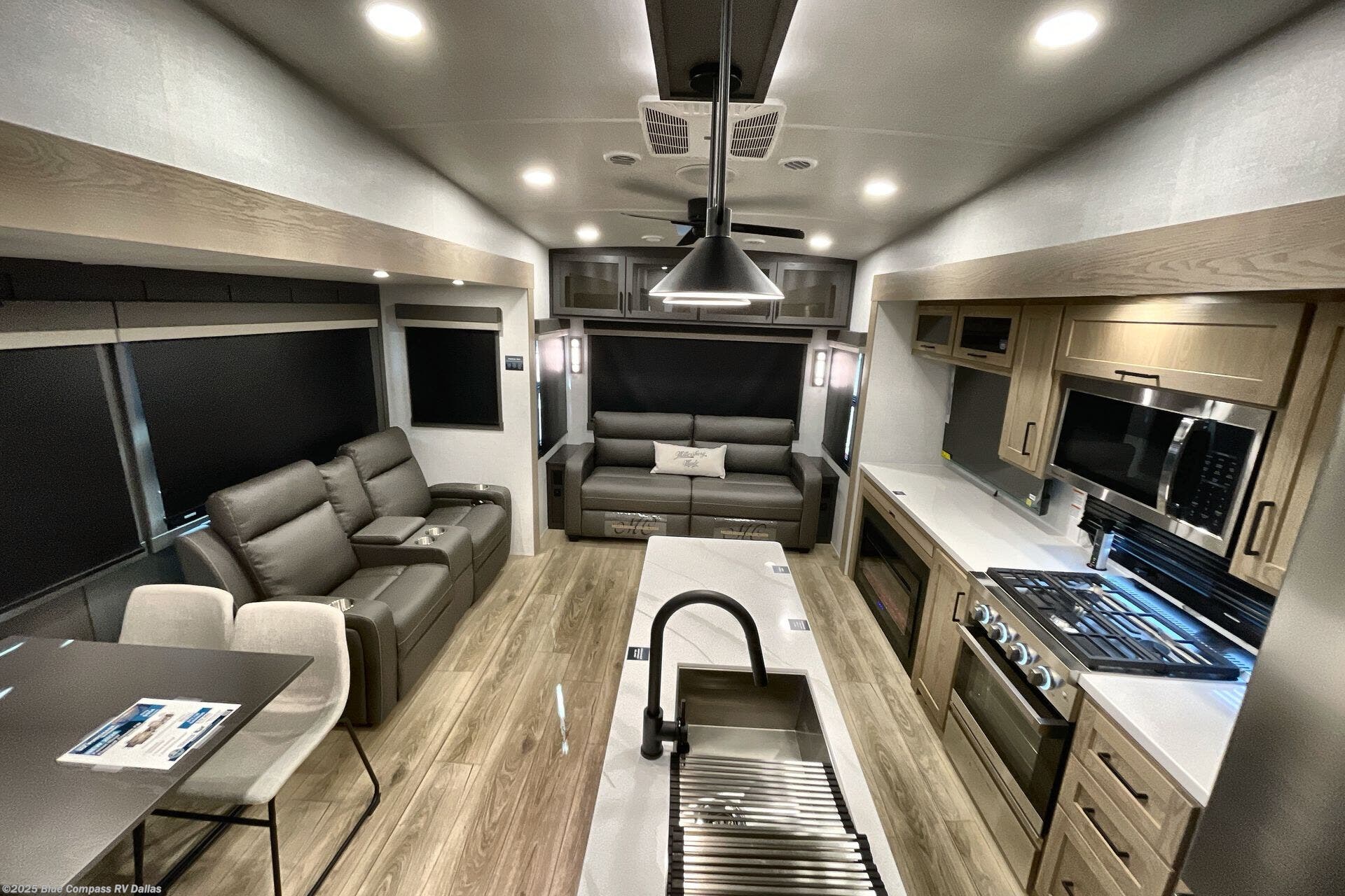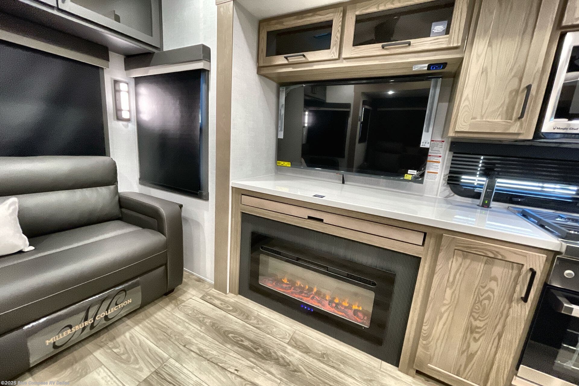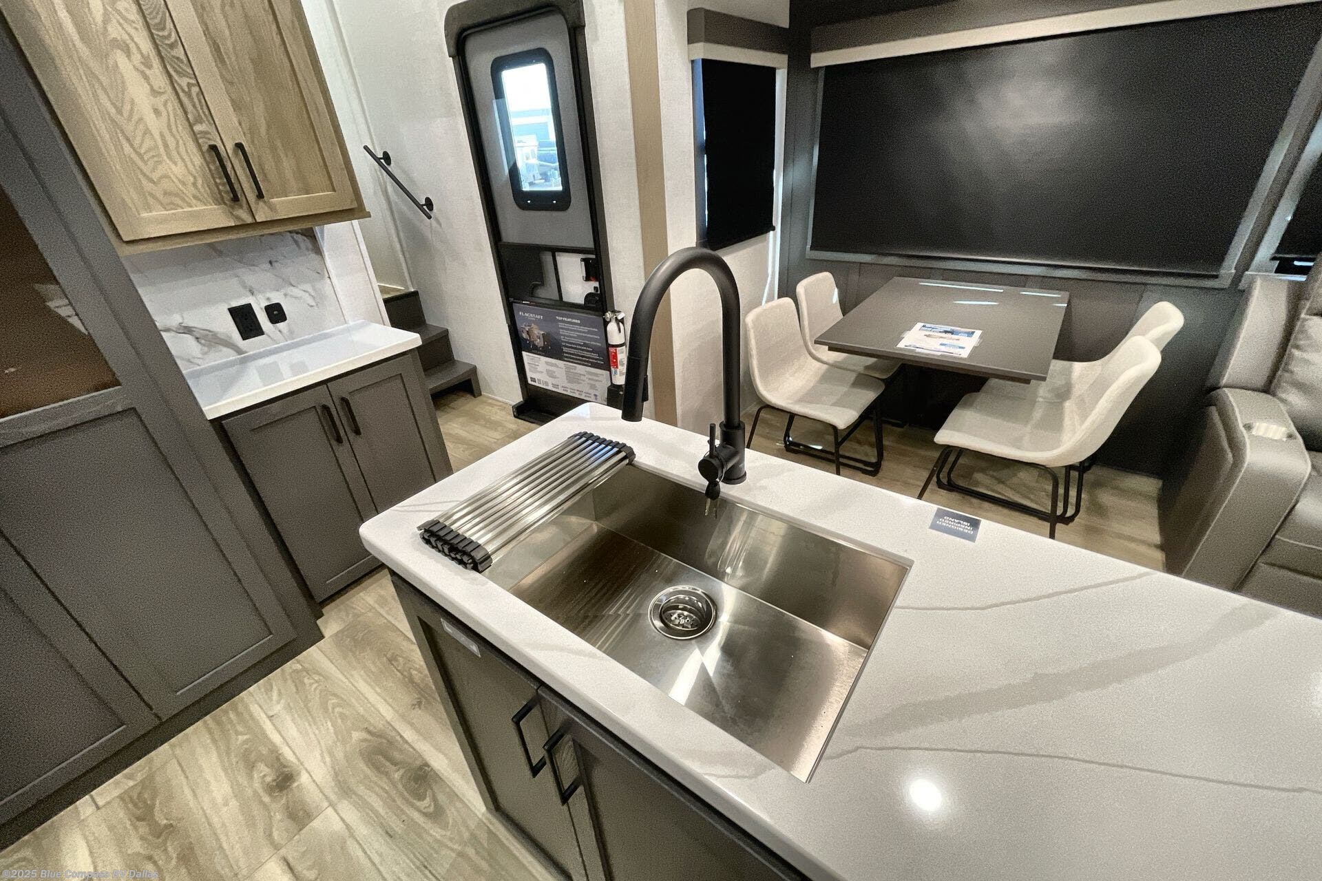 You can't go wrong when choosing this spacious fifth wheel! The master bedroom features a king bed slide out, wardrobe, and a dresser with a fireplace, and the full front bath is sure to bring comfort. There are dual bath sinks here, tons of storage, and even washer and dryer prep if you choose to add these appliances. The mid-coach half bath will come in handy if you have guests staying over on the rear hide-a-bed sofa. You'll also find a theater seat and a rotating table and chairs where you can dine and relax each day, plus there is a large kitchen island so the chef of your group has plenty of prep space. A Smart TV and fireplace will make your space feel more like home, and there is a pull-out desk here if you need to get some work done!
