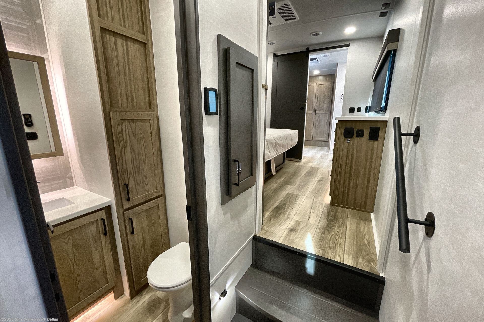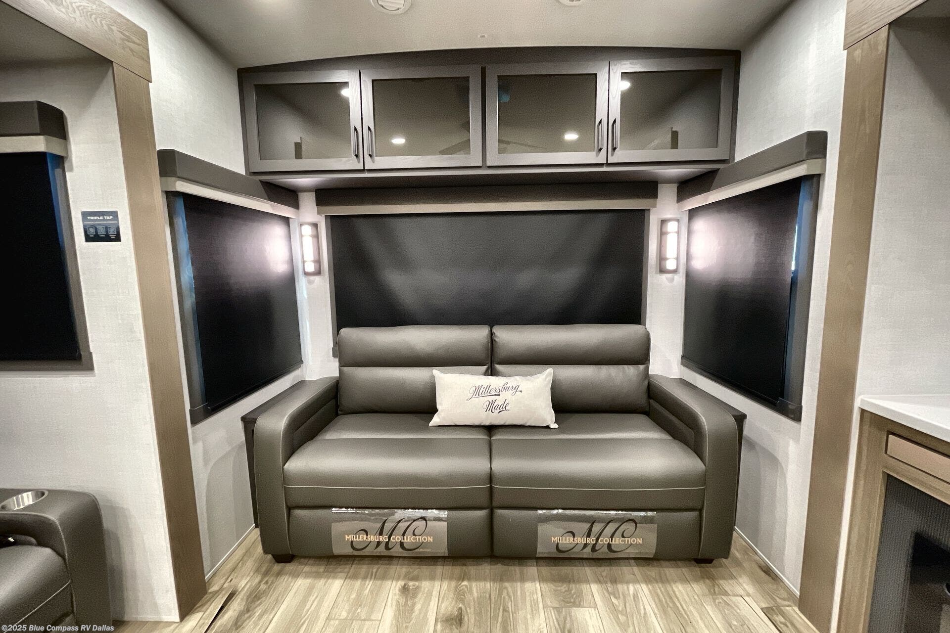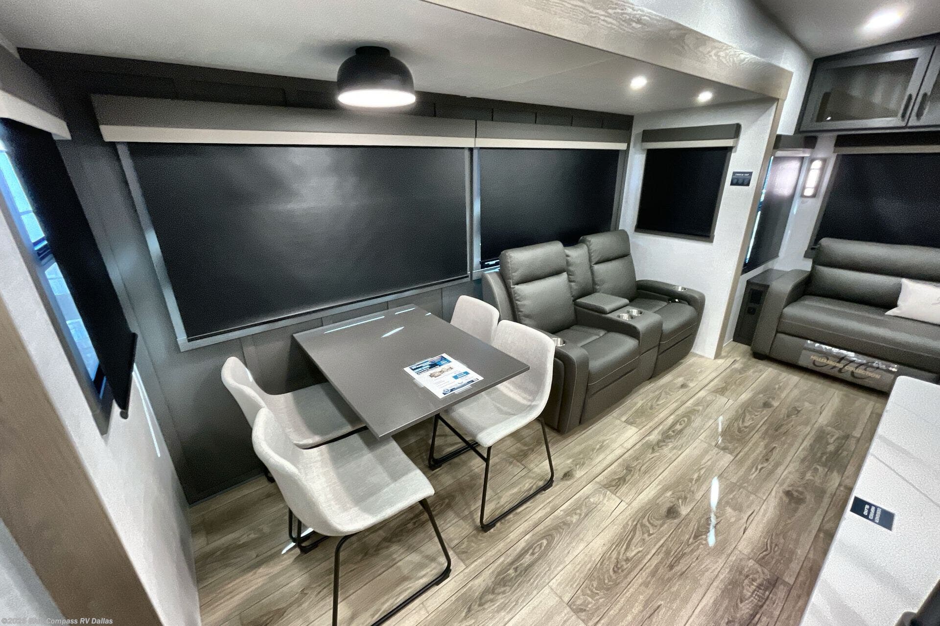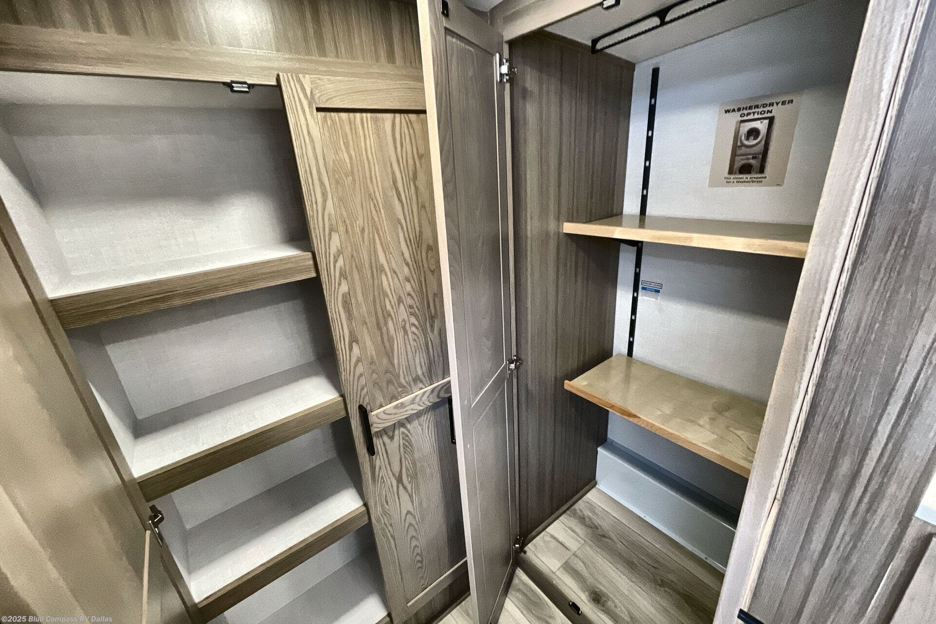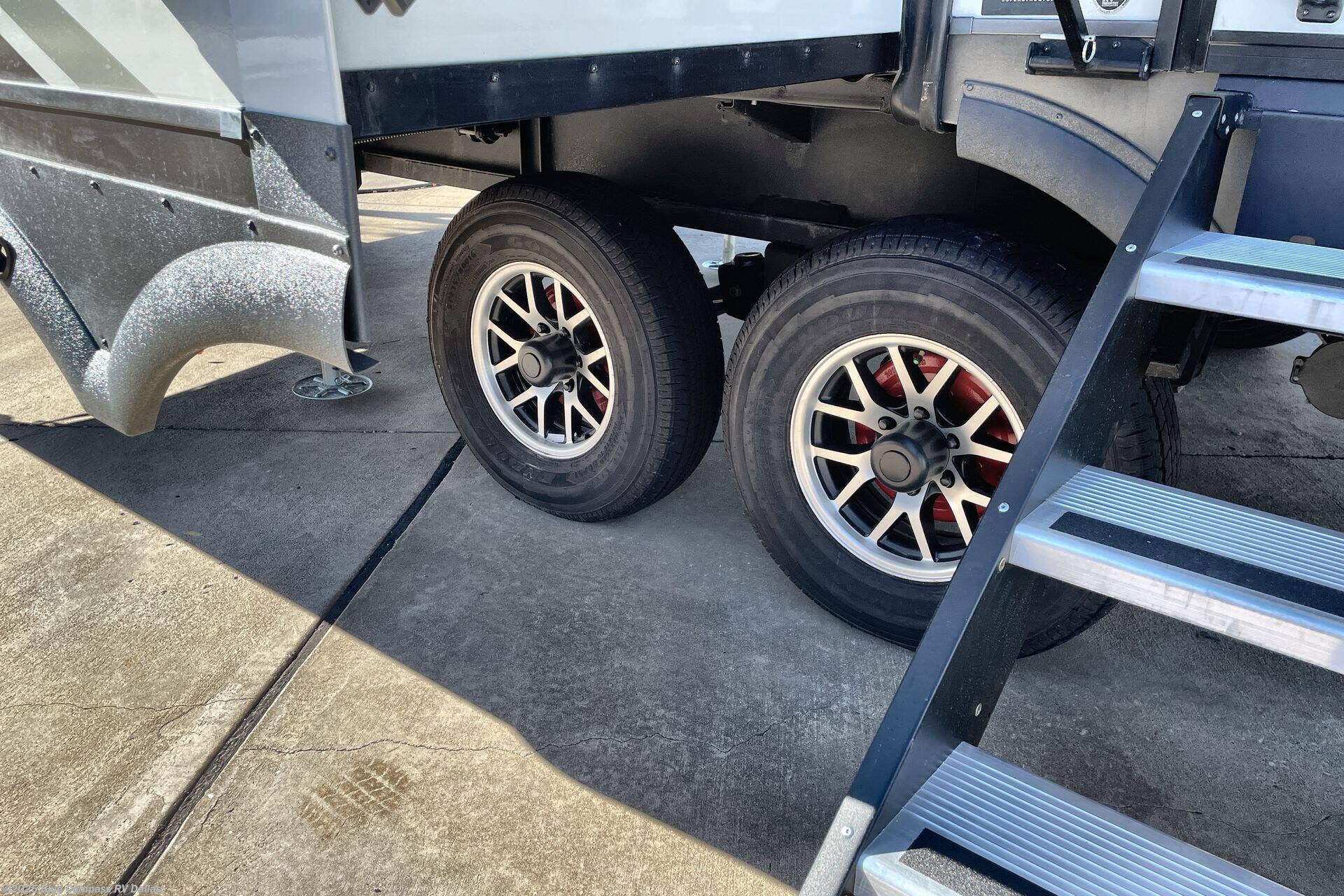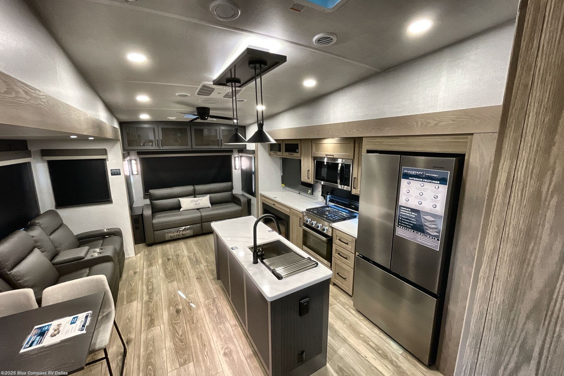 You can't go wrong when choosing this spacious fifth wheel! The master bedroom features a king bed slide out, wardrobe, and a dresser with a fireplace, and the full front bath is sure to bring comfort. There are dual bath sinks here, tons of storage, and even washer and dryer prep if you choose to add these appliances. The mid-coach half bath will come in handy if you have guests staying over on the rear hide-a-bed sofa. You'll also find a theater seat and a rotating table and chairs where you can dine and relax each day, plus there is a large kitchen island so the chef of your group has plenty of prep space. A Smart TV and fireplace will make your space feel more like home, and there is a pull-out desk here if you need to get some work done!