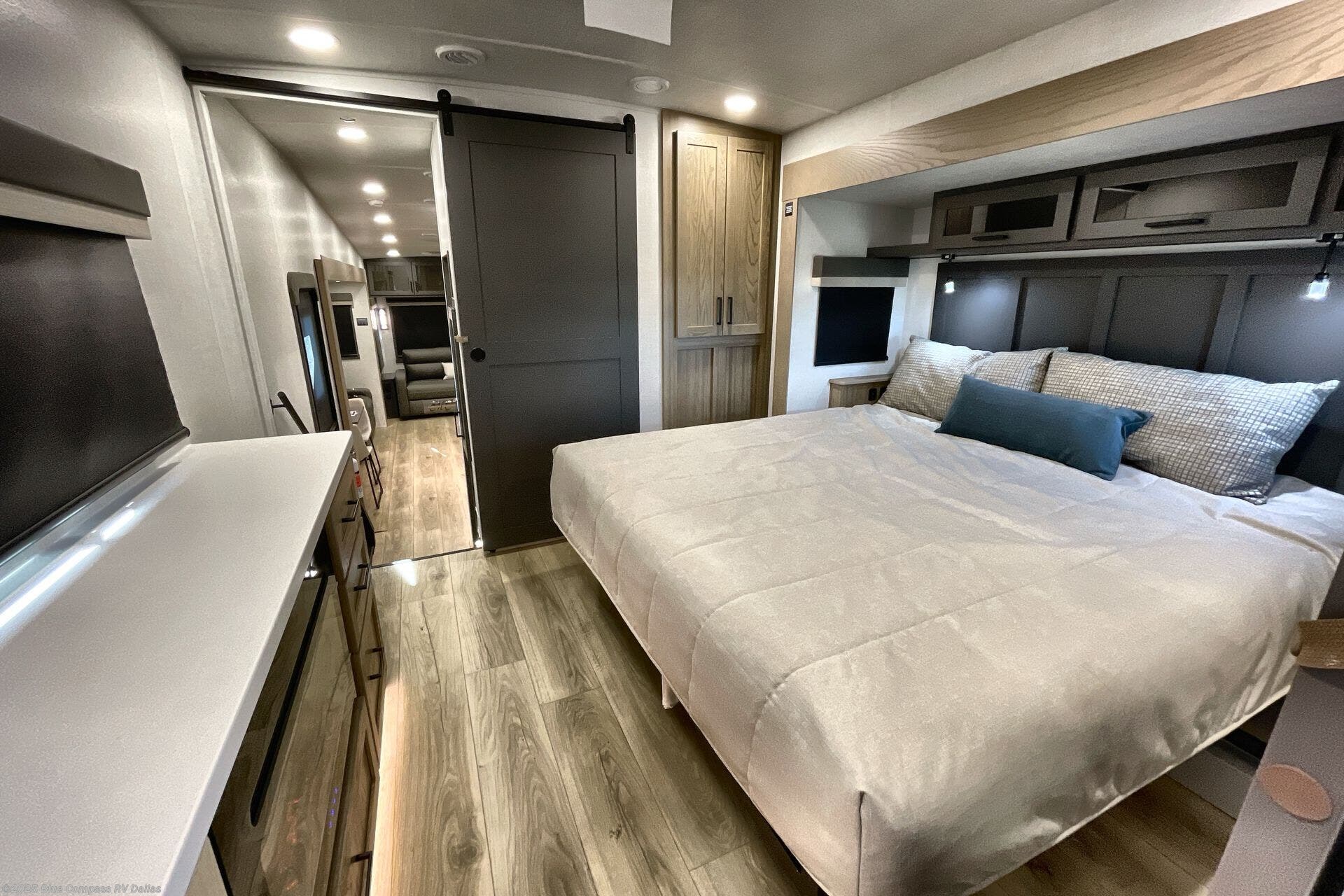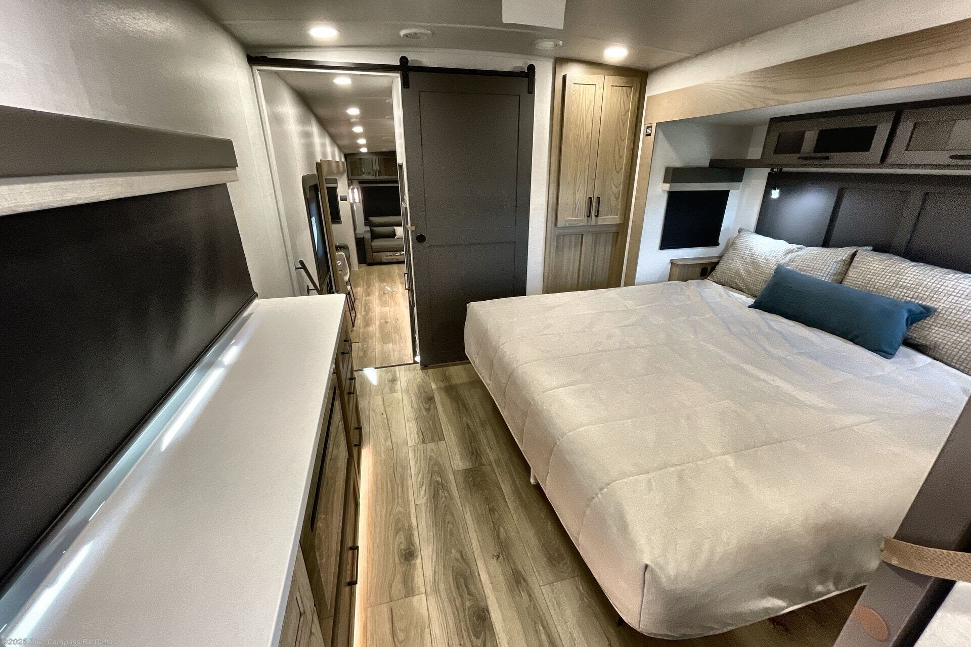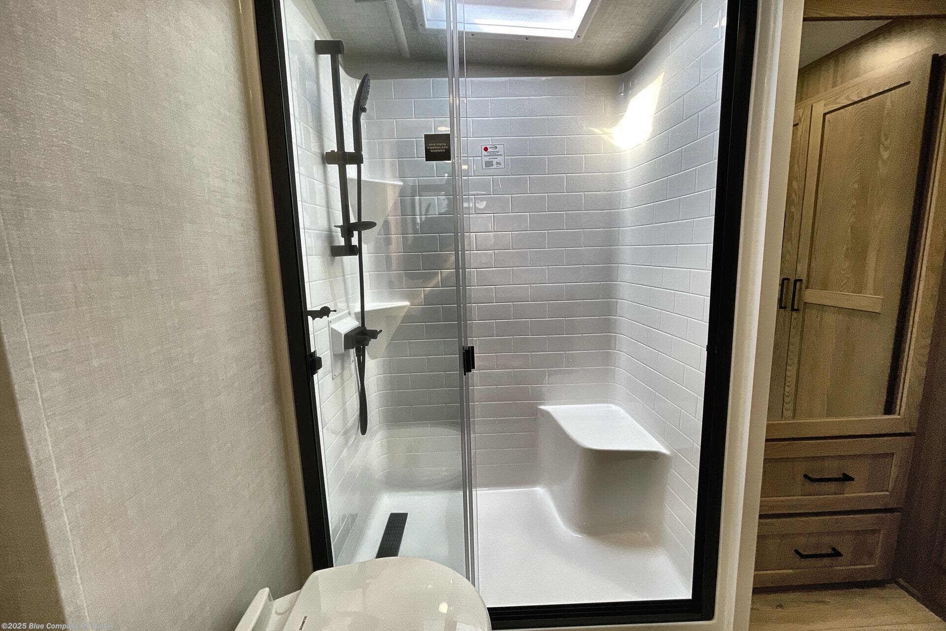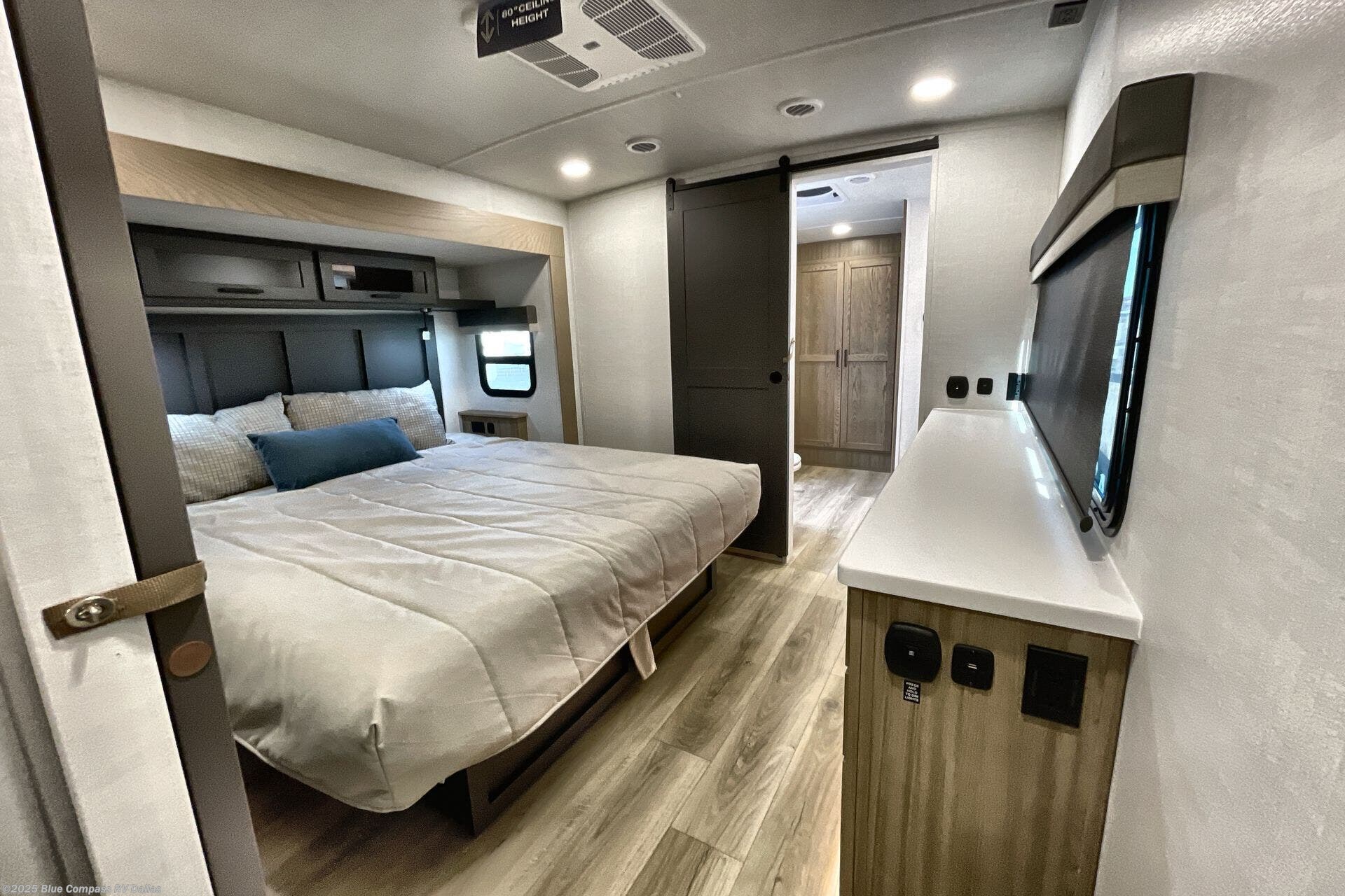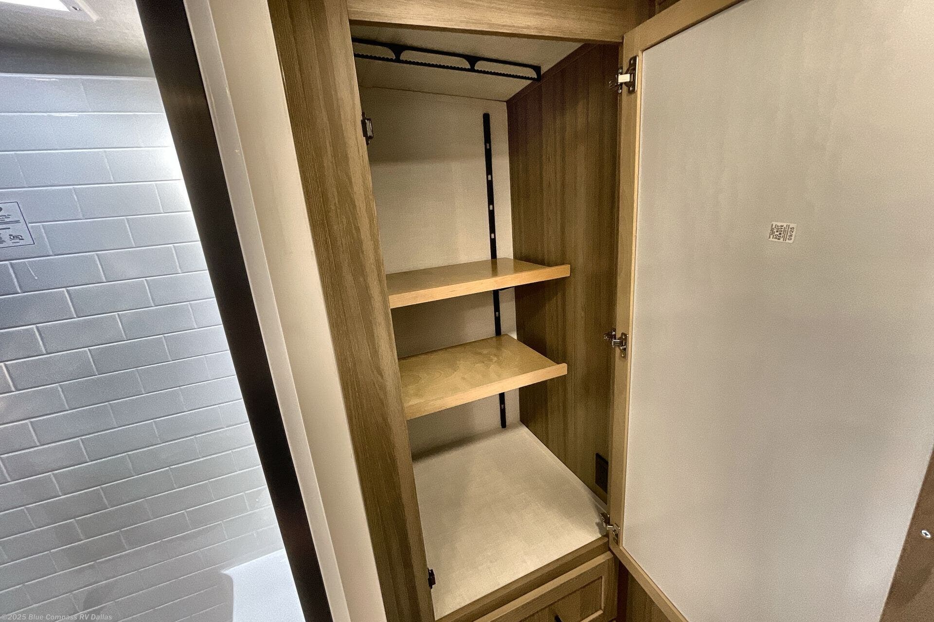 You can't go wrong when choosing this spacious fifth wheel! The master bedroom features a king bed slide out, wardrobe, and a dresser with a fireplace, and the full front bath is sure to bring comfort. There are dual bath sinks here, tons of storage, and even washer and dryer prep if you choose to add these appliances. The mid-coach half bath will come in handy if you have guests staying over on the rear hide-a-bed sofa. You'll also find a theater seat and a rotating table and chairs where you can dine and relax each day, plus there is a large kitchen island so the chef of your group has plenty of prep space. A Smart TV and fireplace will make your space feel more like home, and there is a pull-out desk here if you need to get some work done!