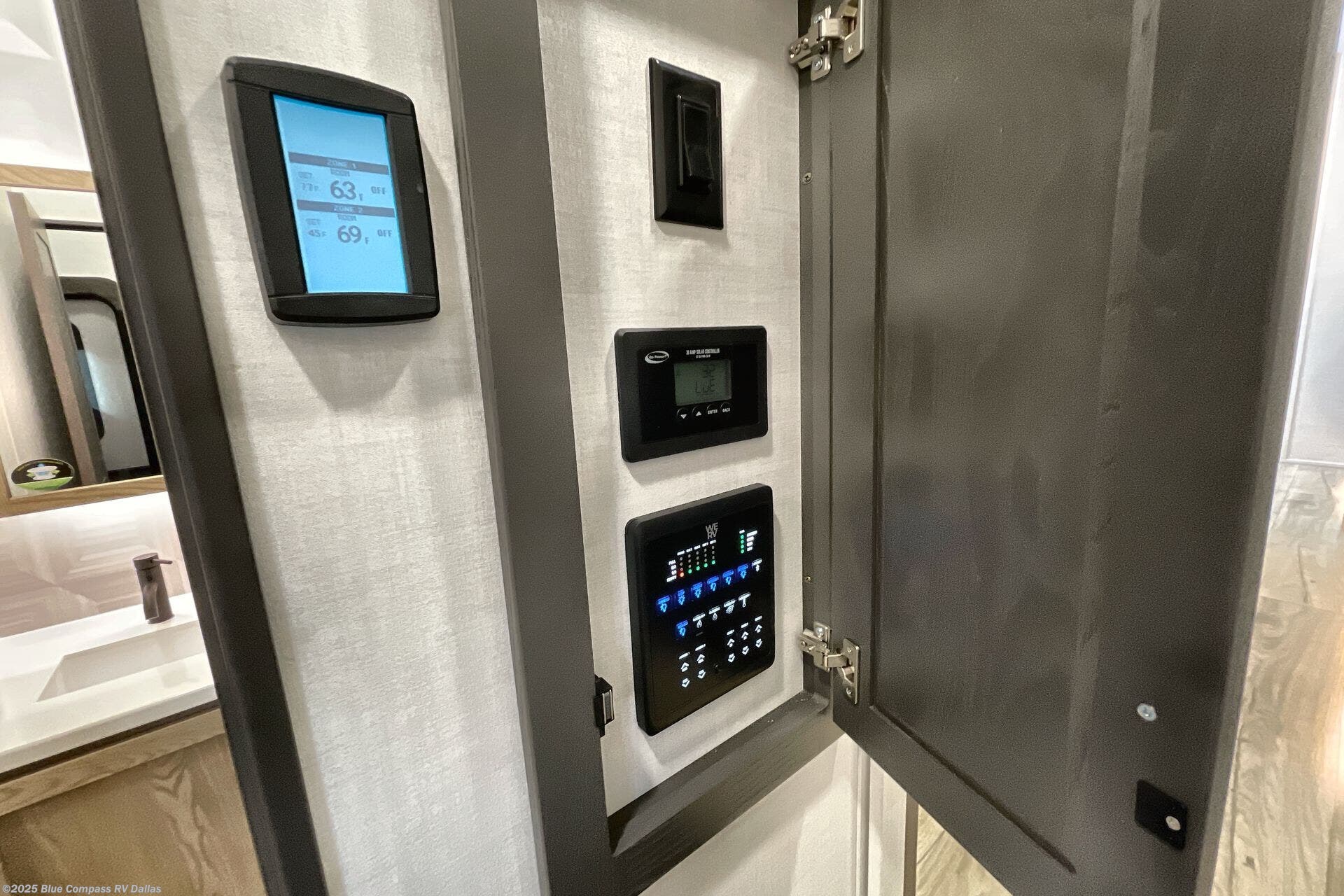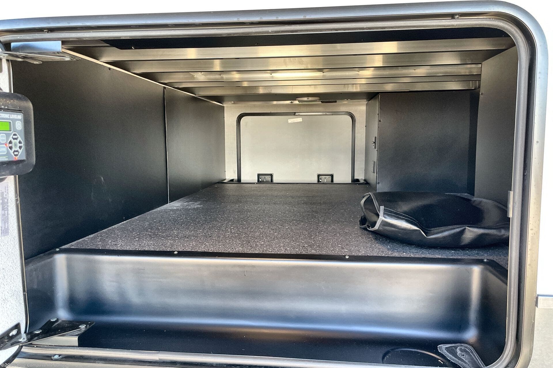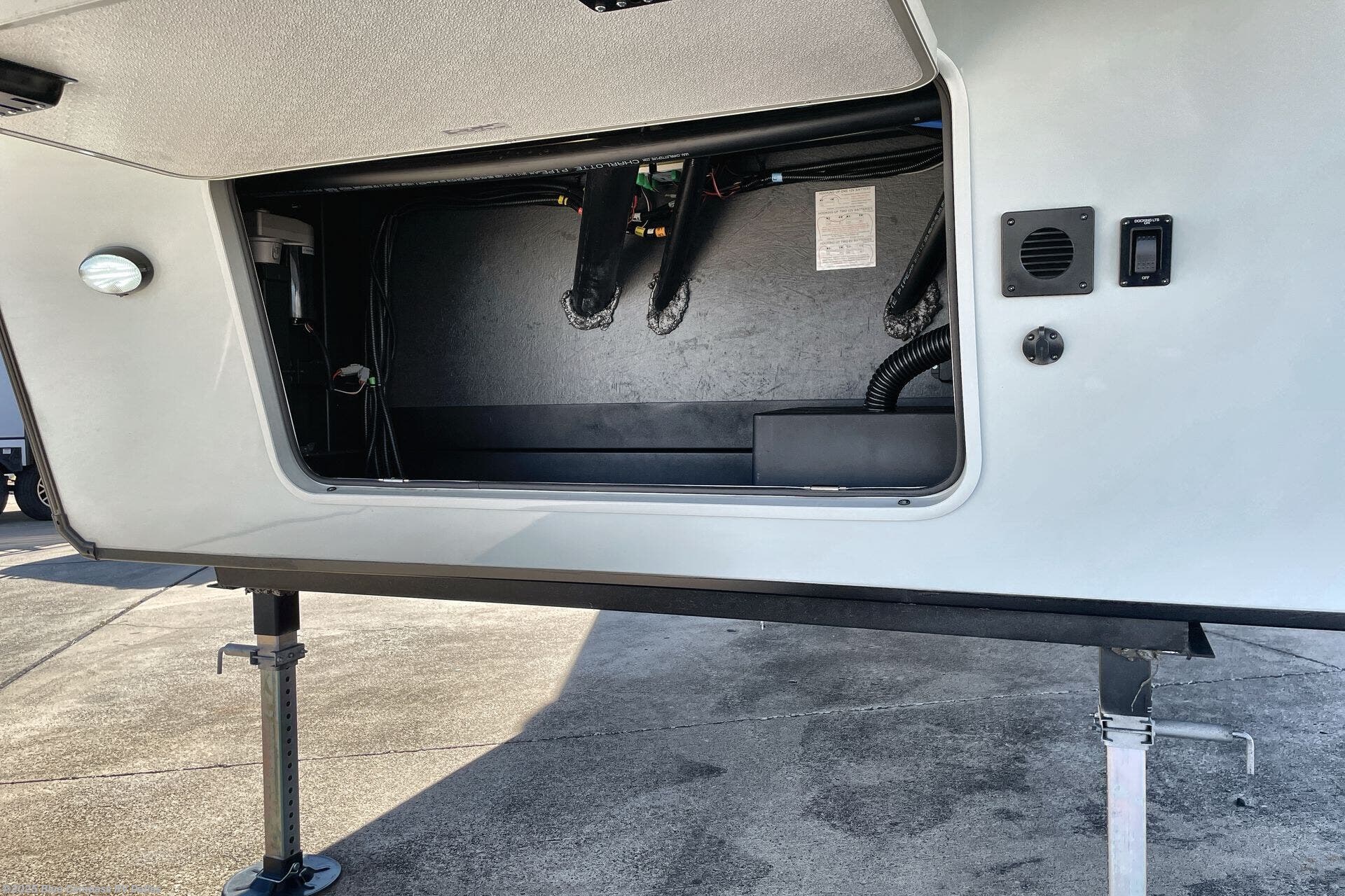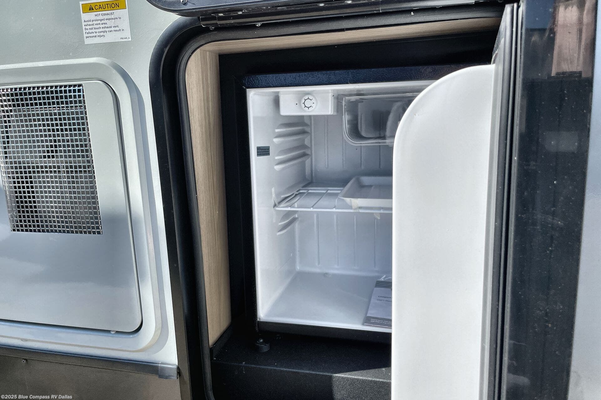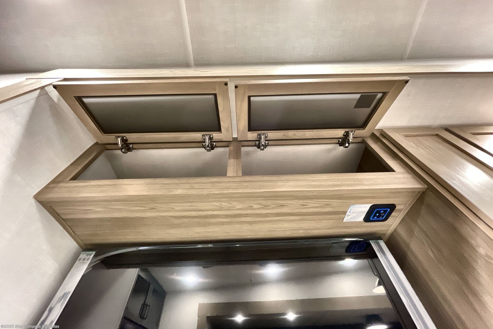 You can't go wrong when choosing this spacious fifth wheel! The master bedroom features a king bed slide out, wardrobe, and a dresser with a fireplace, and the full front bath is sure to bring comfort. There are dual bath sinks here, tons of storage, and even washer and dryer prep if you choose to add these appliances. The mid-coach half bath will come in handy if you have guests staying over on the rear hide-a-bed sofa. You'll also find a theater seat and a rotating table and chairs where you can dine and relax each day, plus there is a large kitchen island so the chef of your group has plenty of prep space. A Smart TV and fireplace will make your space feel more like home, and there is a pull-out desk here if you need to get some work done!