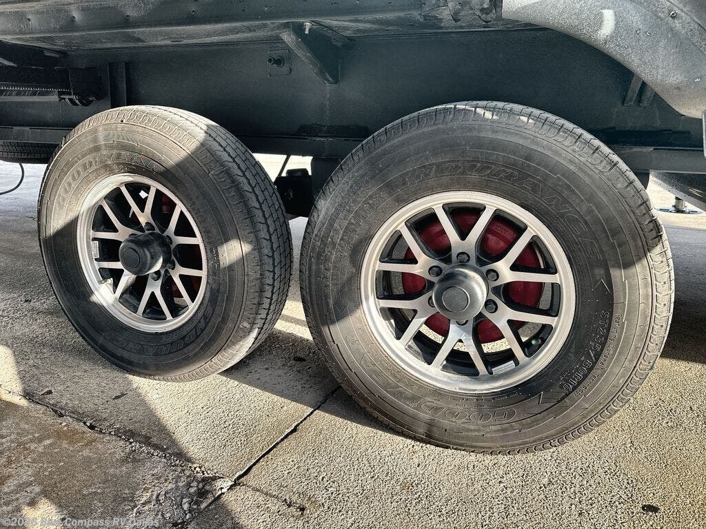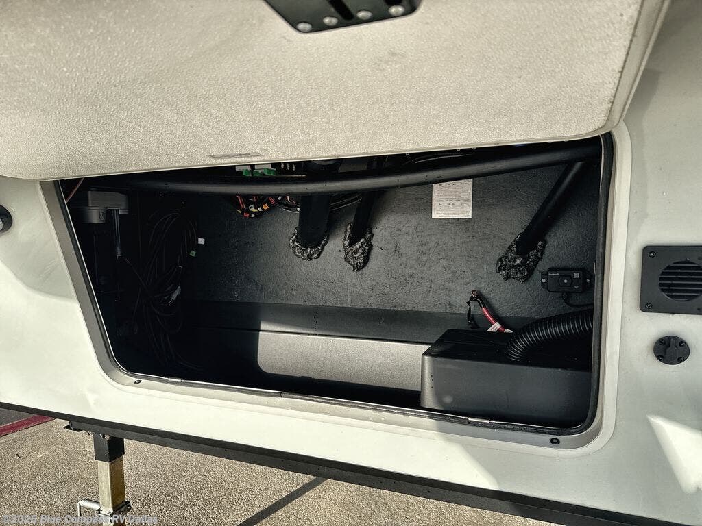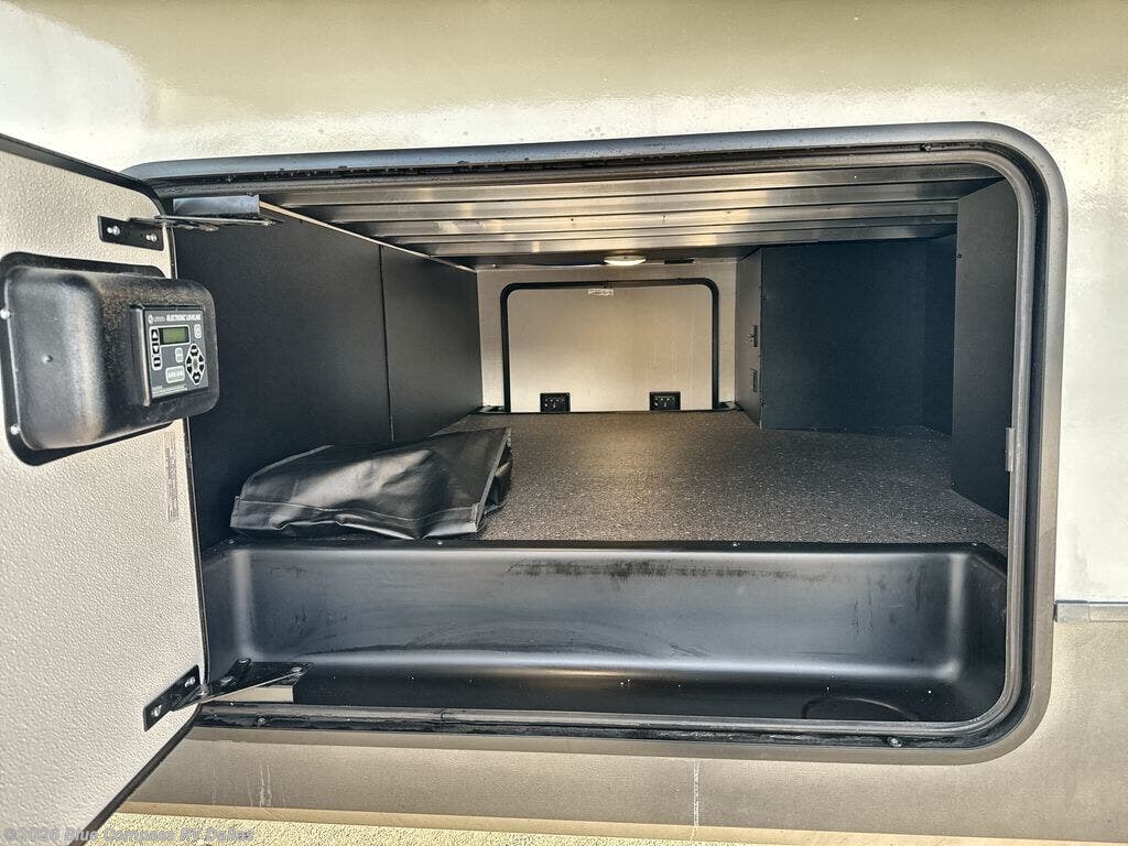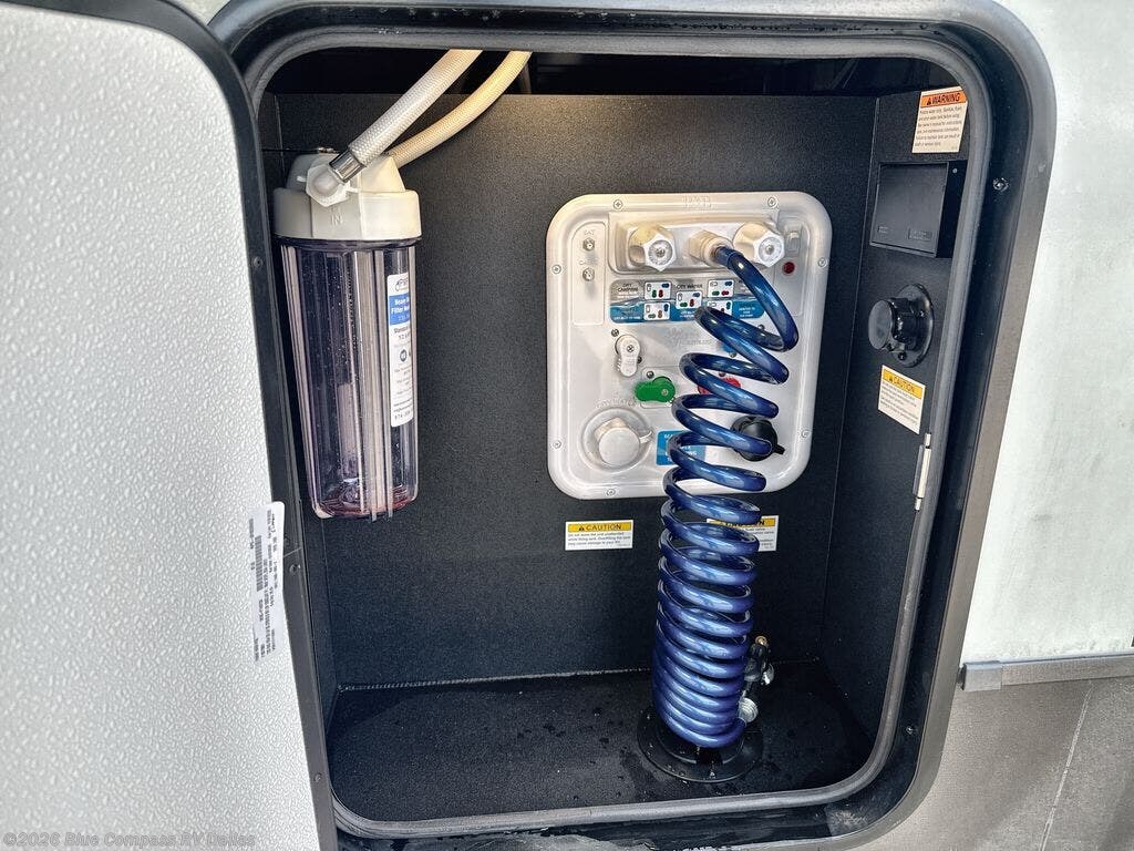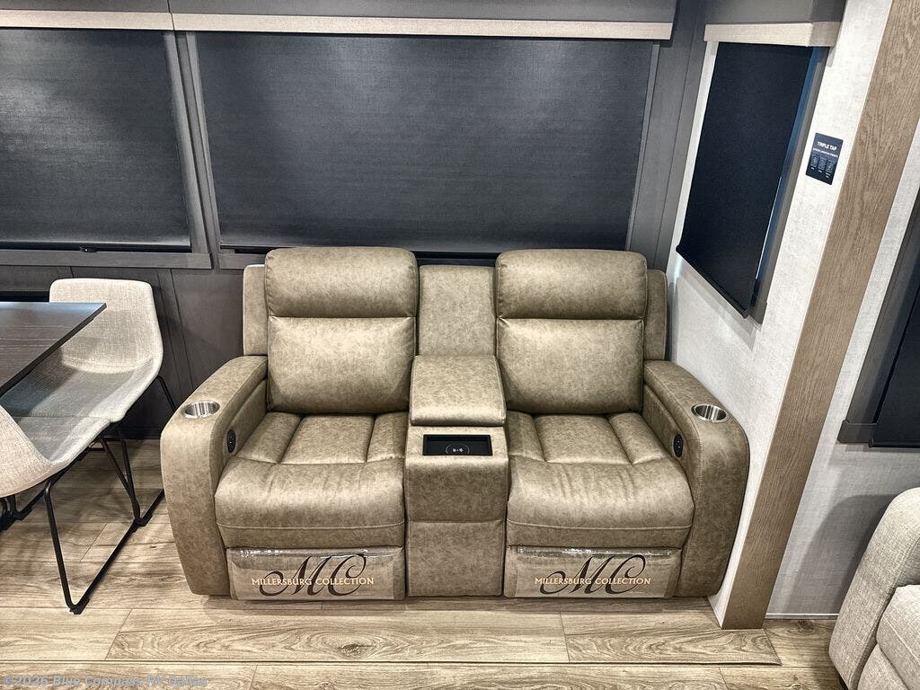 You can't go wrong when choosing this spacious fifth wheel! The master bedroom features a king bed slide out, wardrobe, and a dresser with a fireplace, and the full front bath is sure to bring comfort. There are dual bath sinks here, tons of storage, and even washer and dryer prep if you choose to add these appliances. The mid-coach half bath will come in handy if you have guests staying over on the rear hide-a-bed sofa. You'll also find a theater seat and a rotating table and chairs where you can dine and relax each day, plus there is a large kitchen island so the chef of your group has plenty of prep space. A Smart TV and fireplace will make your space feel more like home, and there is a pull-out desk here if you need to get some work done!