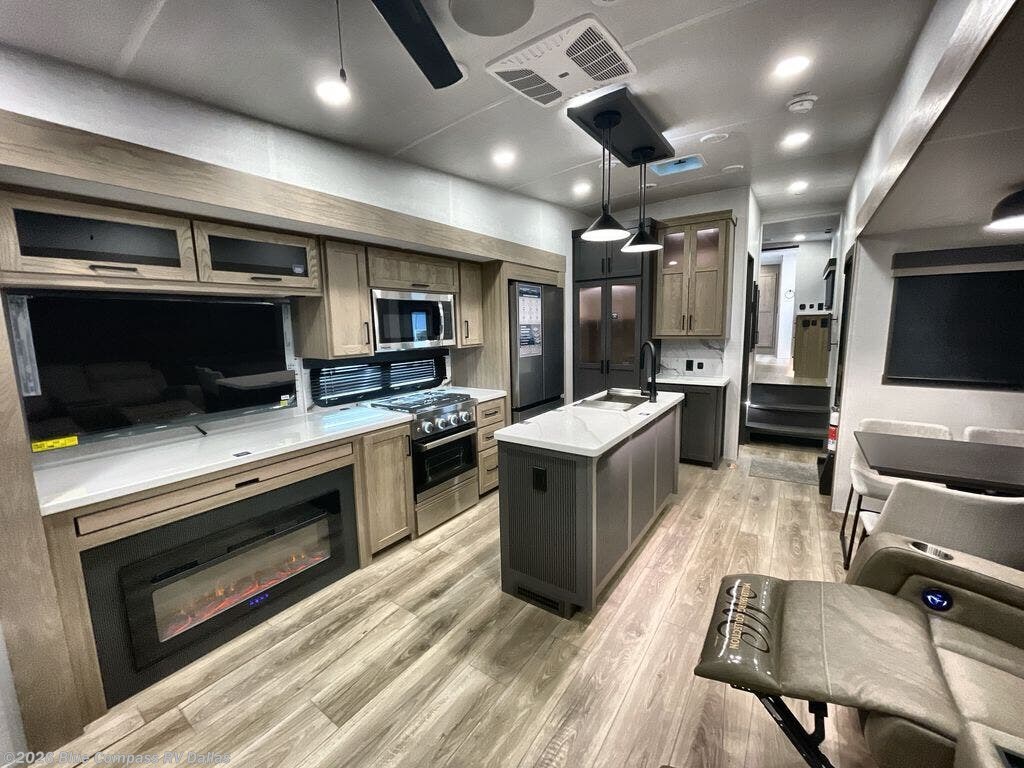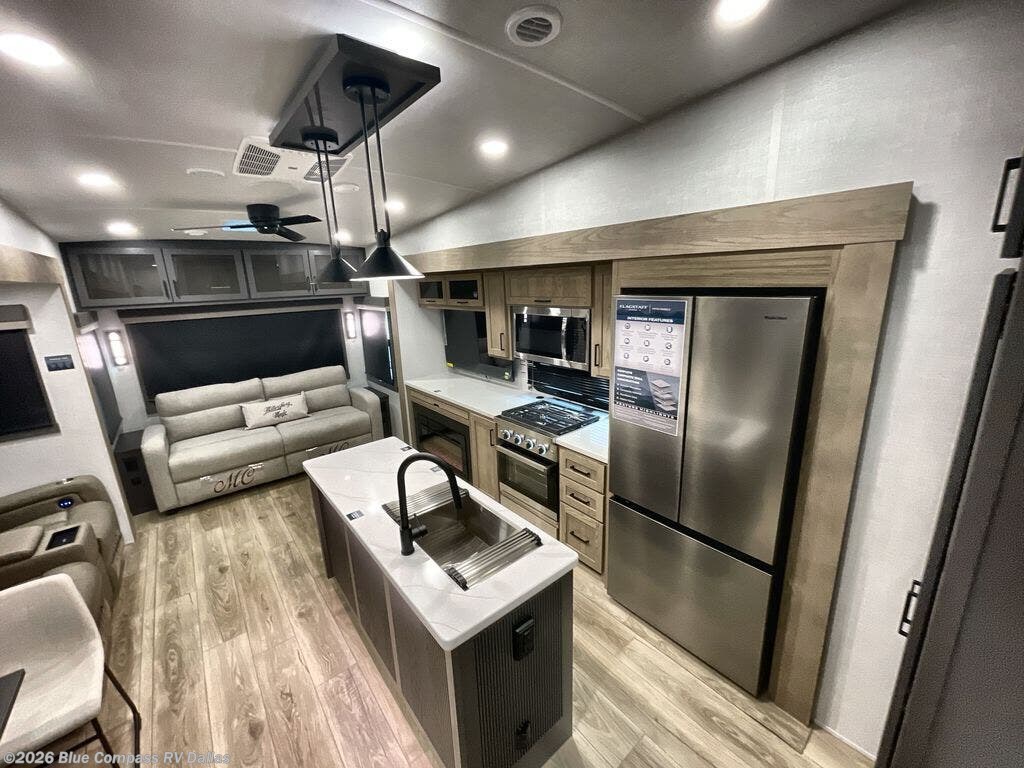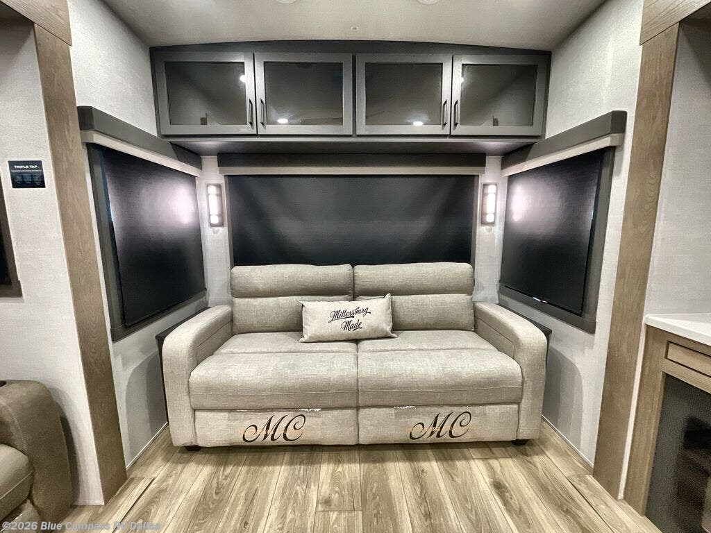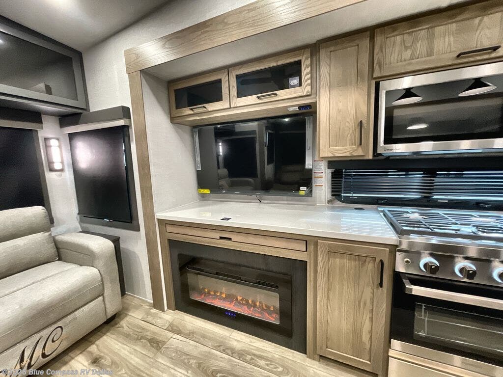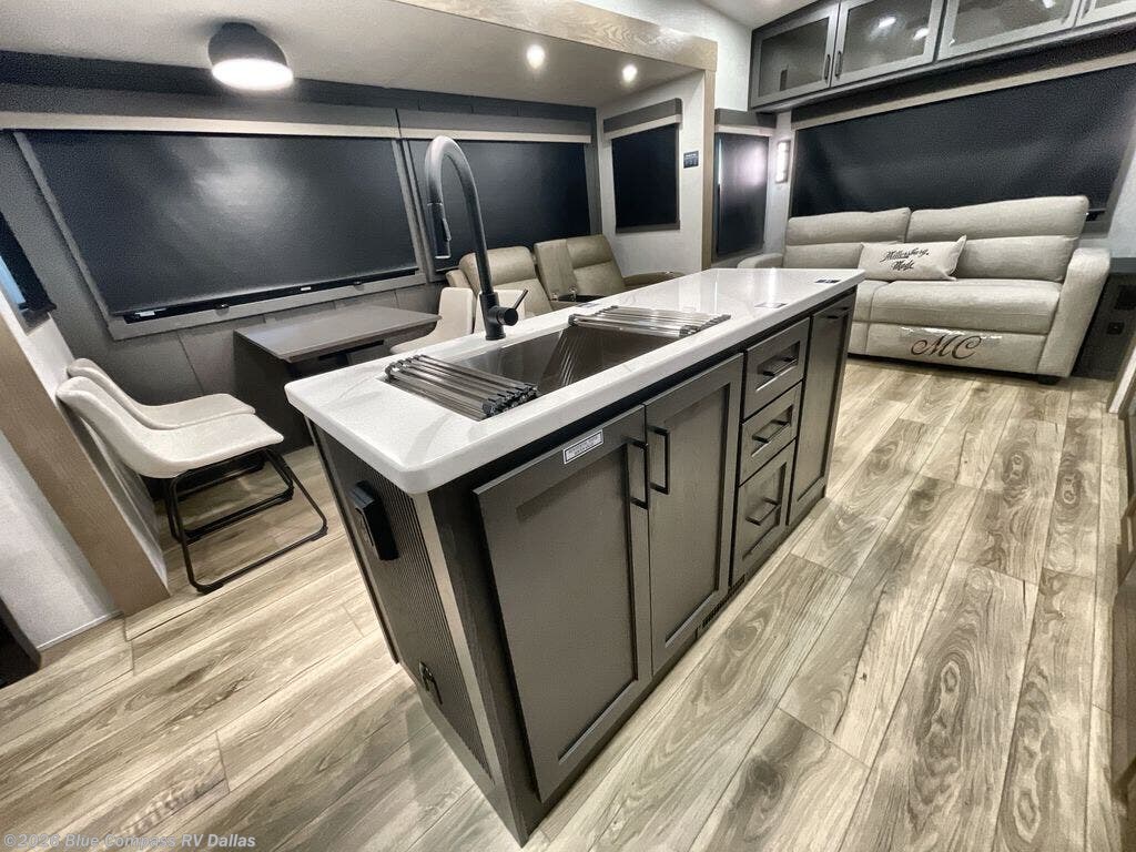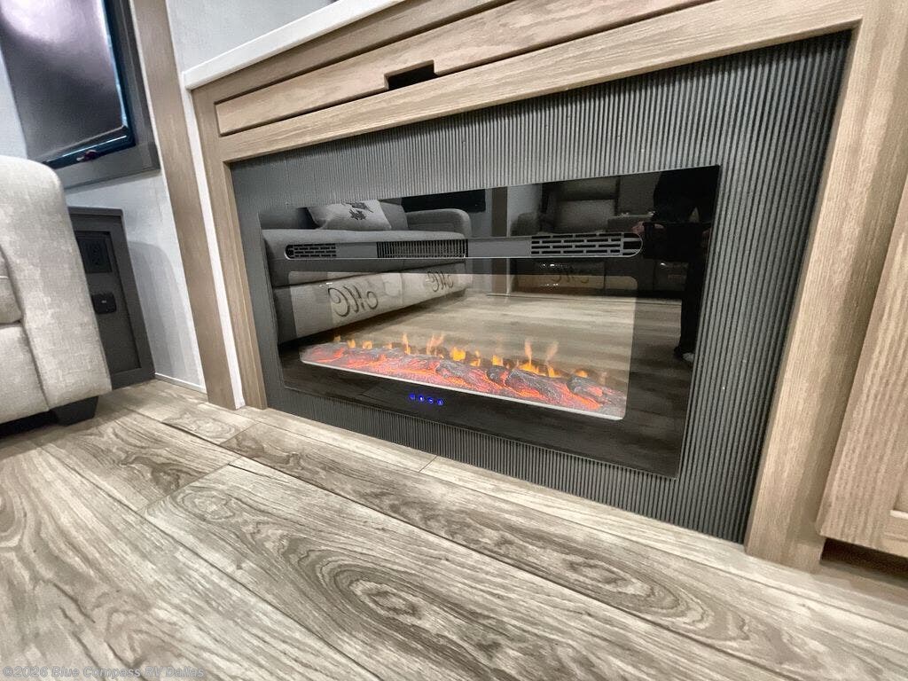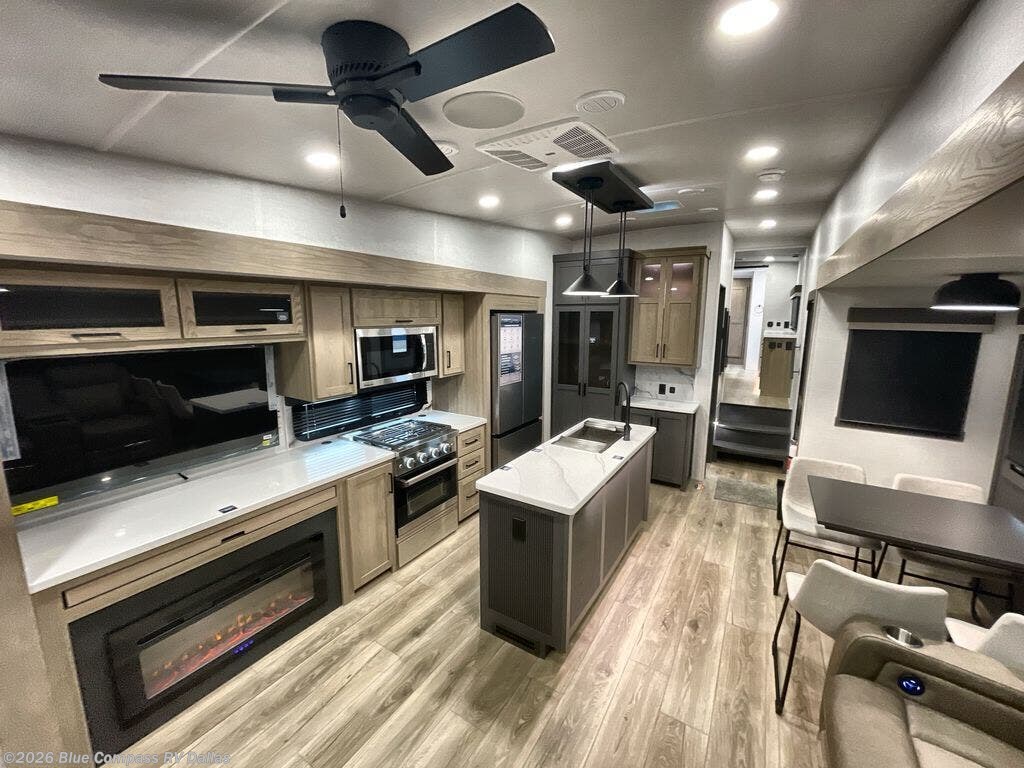 You can't go wrong when choosing this spacious fifth wheel! The master bedroom features a king bed slide out, wardrobe, and a dresser with a fireplace, and the full front bath is sure to bring comfort. There are dual bath sinks here, tons of storage, and even washer and dryer prep if you choose to add these appliances. The mid-coach half bath will come in handy if you have guests staying over on the rear hide-a-bed sofa. You'll also find a theater seat and a rotating table and chairs where you can dine and relax each day, plus there is a large kitchen island so the chef of your group has plenty of prep space. A Smart TV and fireplace will make your space feel more like home, and there is a pull-out desk here if you need to get some work done!