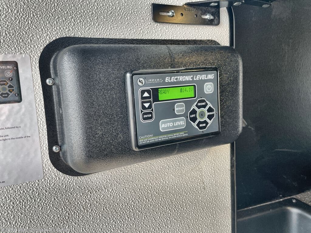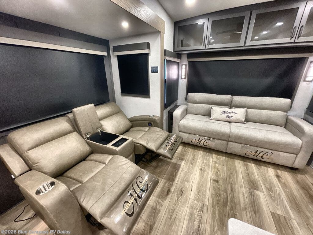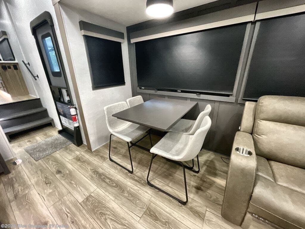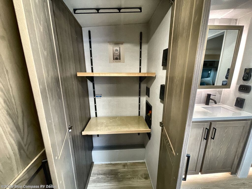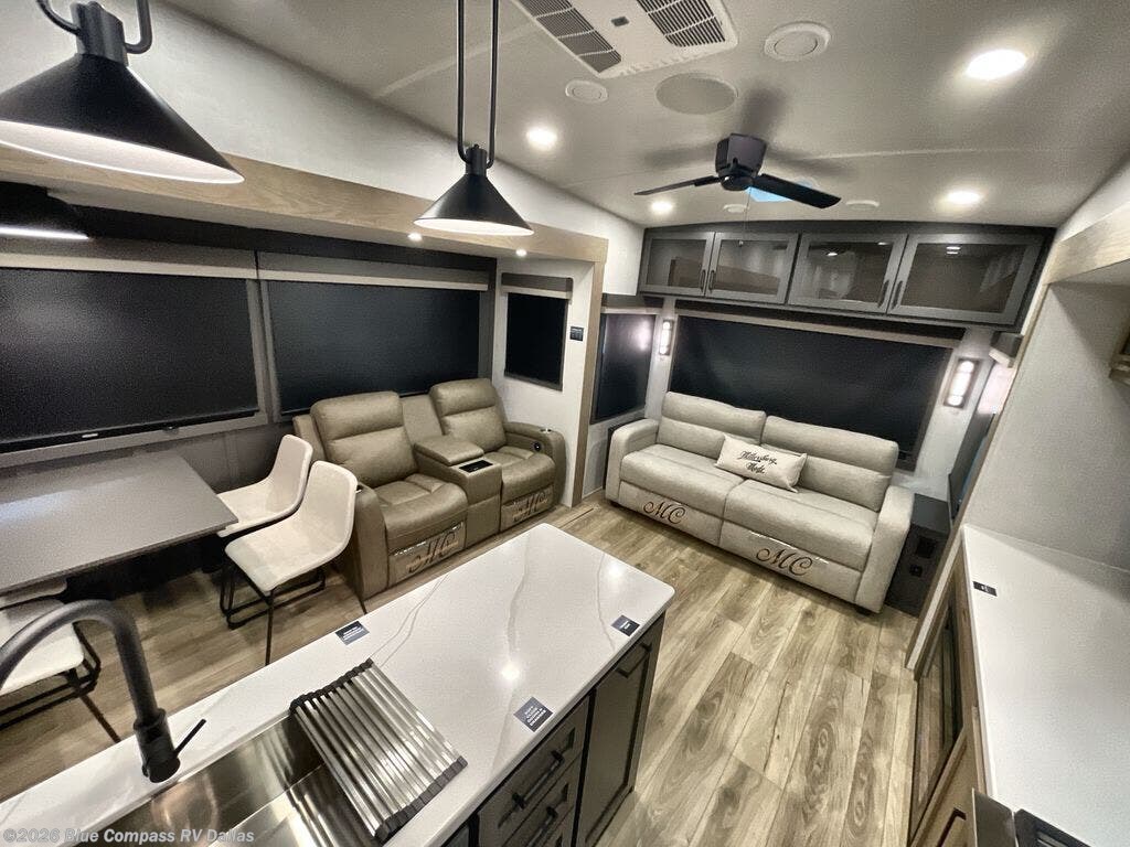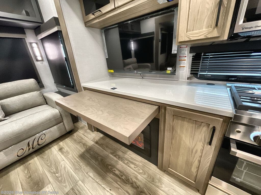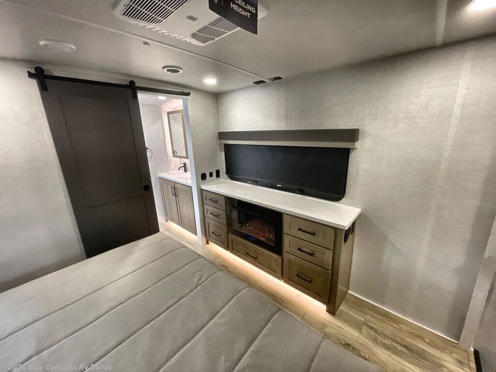 You can't go wrong when choosing this spacious fifth wheel! The master bedroom features a king bed slide out, wardrobe, and a dresser with a fireplace, and the full front bath is sure to bring comfort. There are dual bath sinks here, tons of storage, and even washer and dryer prep if you choose to add these appliances. The mid-coach half bath will come in handy if you have guests staying over on the rear hide-a-bed sofa. You'll also find a theater seat and a rotating table and chairs where you can dine and relax each day, plus there is a large kitchen island so the chef of your group has plenty of prep space. A Smart TV and fireplace will make your space feel more like home, and there is a pull-out desk here if you need to get some work done!