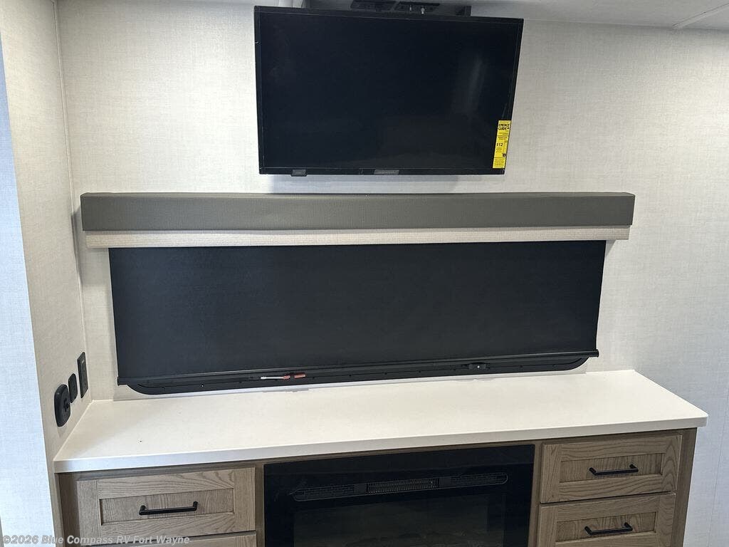 You can't go wrong when choosing this spacious fifth wheel! The master bedroom features a king bed slide out, wardrobe, and a dresser with a fireplace, and the full front bath is sure to bring comfort. There are dual bath sinks here, tons of storage, and even washer and dryer prep if you choose to add these appliances. The mid-coach half bath will come in handy if you have guests staying over on the rear hide-a-bed sofa. You'll also find a theater seat and a rotating table and chairs where you can dine and relax each day, plus there is a large kitchen island so the chef of your group has plenty of prep space. A Smart TV and fireplace will make your space feel more like home, and there is a pull-out desk here if you need to get some work done!