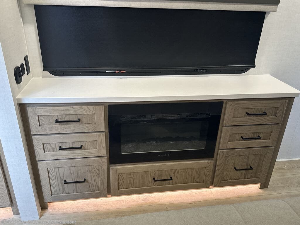 You can't go wrong when choosing this spacious fifth wheel! The master bedroom features a king bed slide out, wardrobe, and a dresser with a fireplace, and the full front bath is sure to bring comfort. There are dual bath sinks here, tons of storage, and even washer and dryer prep if you choose to add these appliances. The mid-coach half bath will come in handy if you have guests staying over on the rear hide-a-bed sofa. You'll also find a theater seat and a rotating table and chairs where you can dine and relax each day, plus there is a large kitchen island so the chef of your group has plenty of prep space. A Smart TV and fireplace will make your space feel more like home, and there is a pull-out desk here if you need to get some work done!