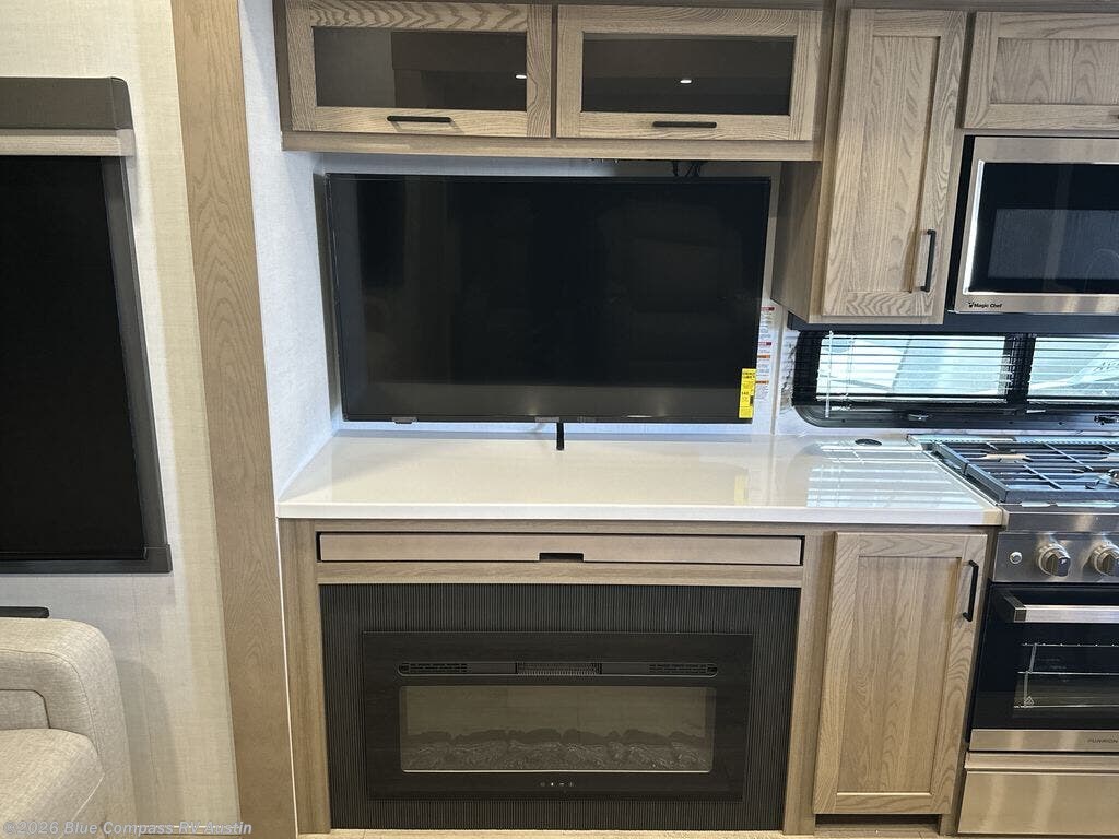 You can't go wrong when choosing this spacious fifth wheel! The master bedroom features a king bed slide out, wardrobe, and a dresser with a fireplace, and the full front bath is sure to bring comfort. There are dual bath sinks here, tons of storage, and even washer and dryer prep if you choose to add these appliances. The mid-coach half bath will come in handy if you have guests staying over on the rear hide-a-bed sofa. You'll also find a theater seat and a rotating table and chairs where you can dine and relax each day, plus there is a large kitchen island so the chef of your group has plenty of prep space. A Smart TV and fireplace will make your space feel more like home, and there is a pull-out desk here if you need to get some work done!