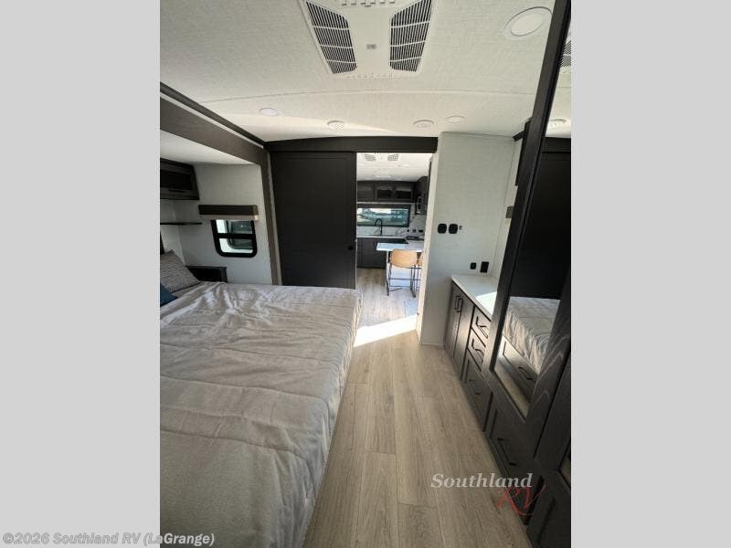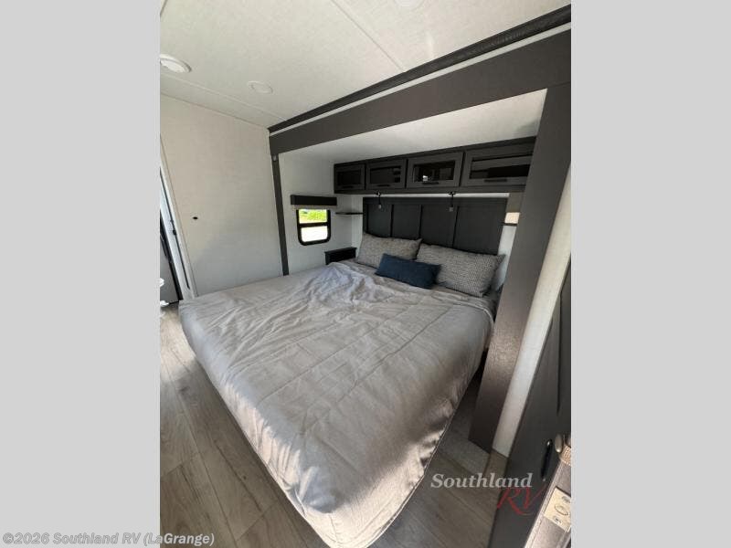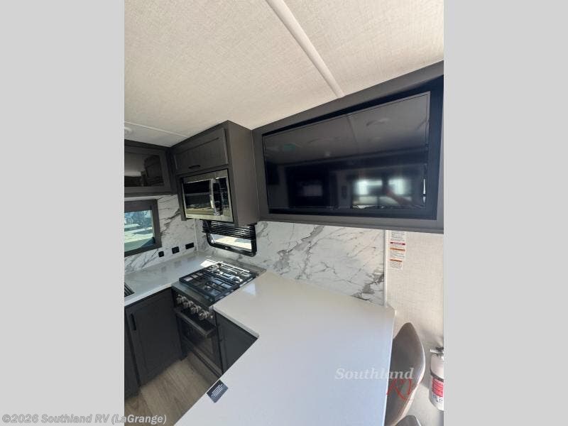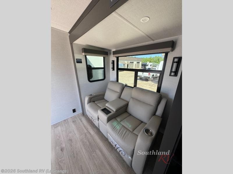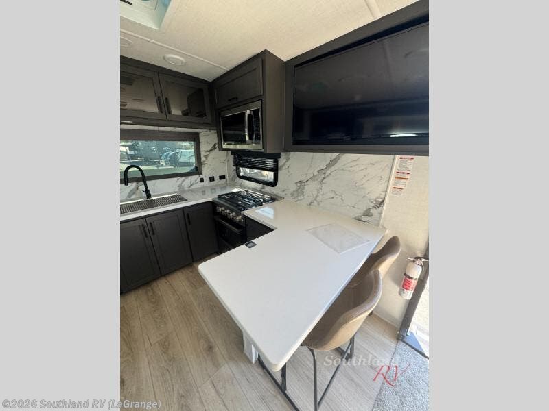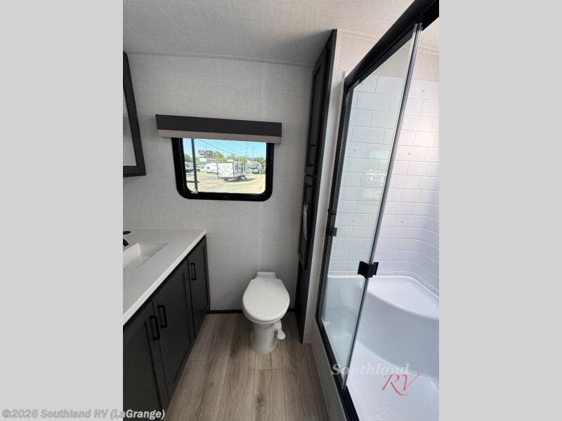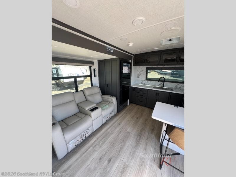 You will love how open this travel trailer will feel with the large front window that you can look out from the two-person bar top seating! The front kitchen has plenty of countertop space for you to prepare your best meals. Your nights will be spent in true relaxation with a 67" theater seating and king bed slide in the bedroom for a great night's rest. The full rear bathroom has a shower with a seat to take a nice, hot shower before bed, and a dual-sink vanity for two to get ready at once in the mornings!