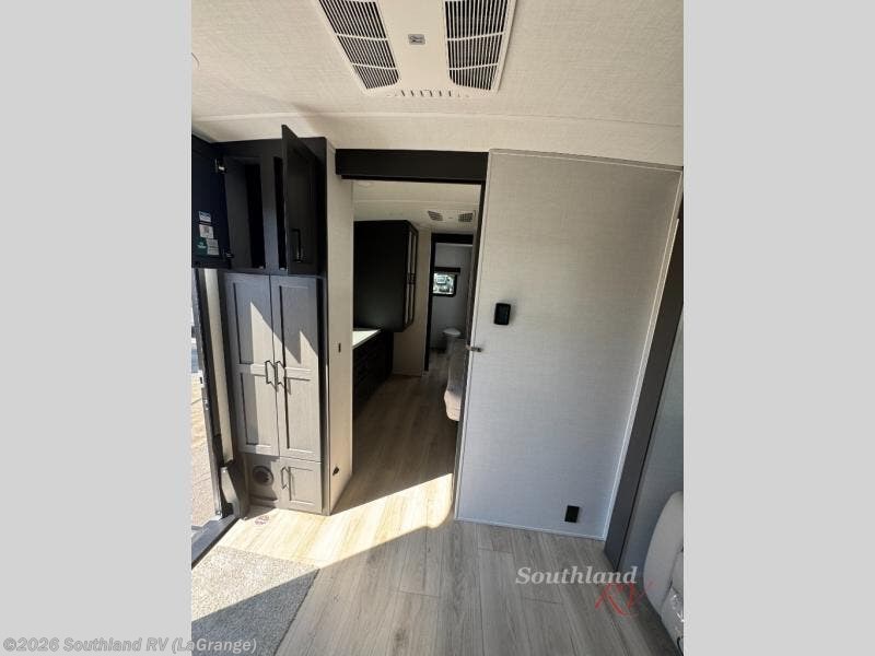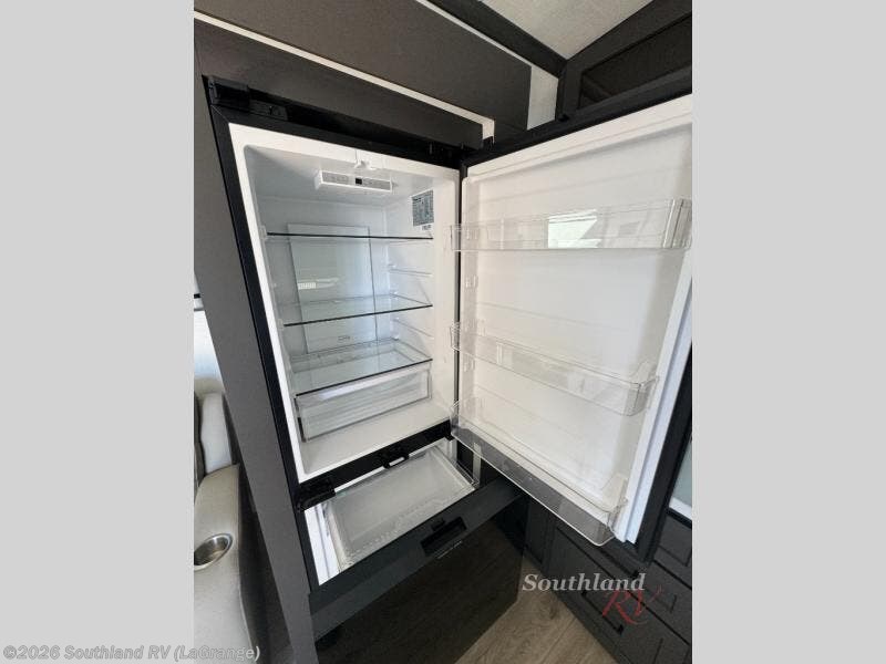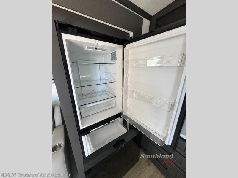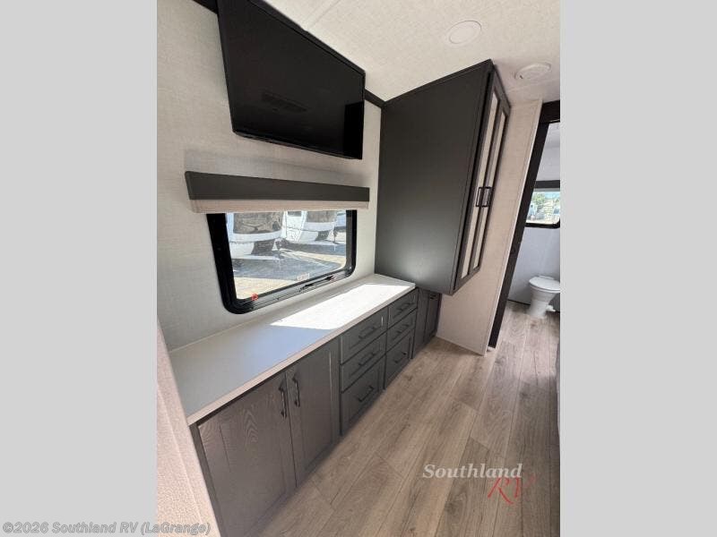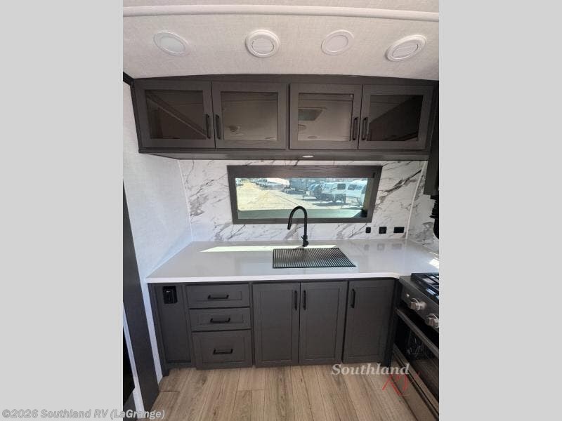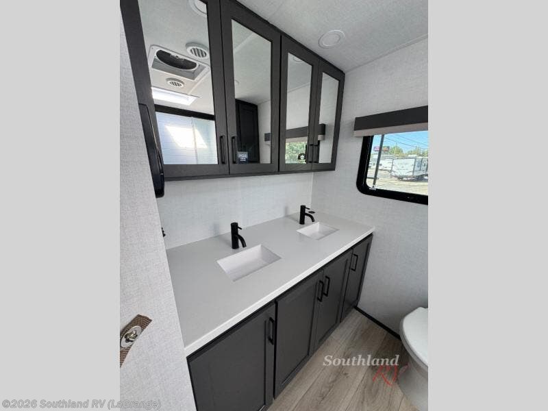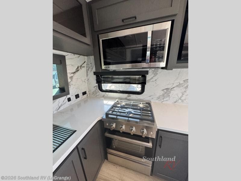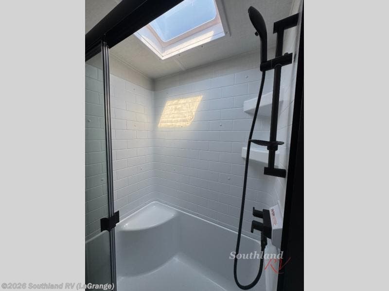 You will love how open this travel trailer will feel with the large front window that you can look out from the two-person bar top seating! The front kitchen has plenty of countertop space for you to prepare your best meals. Your nights will be spent in true relaxation with a 67" theater seating and king bed slide in the bedroom for a great night's rest. The full rear bathroom has a shower with a seat to take a nice, hot shower before bed, and a dual-sink vanity for two to get ready at once in the mornings!