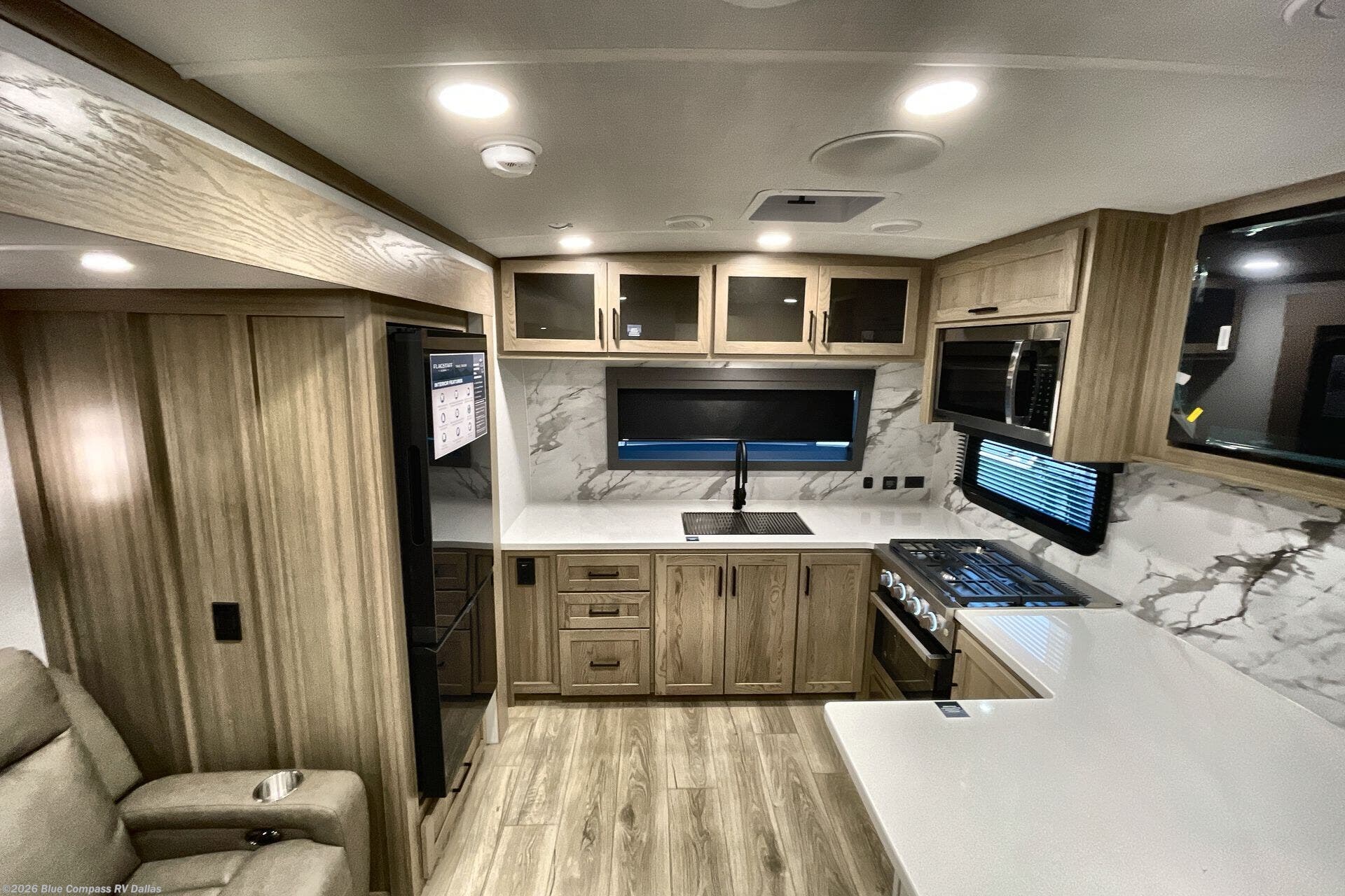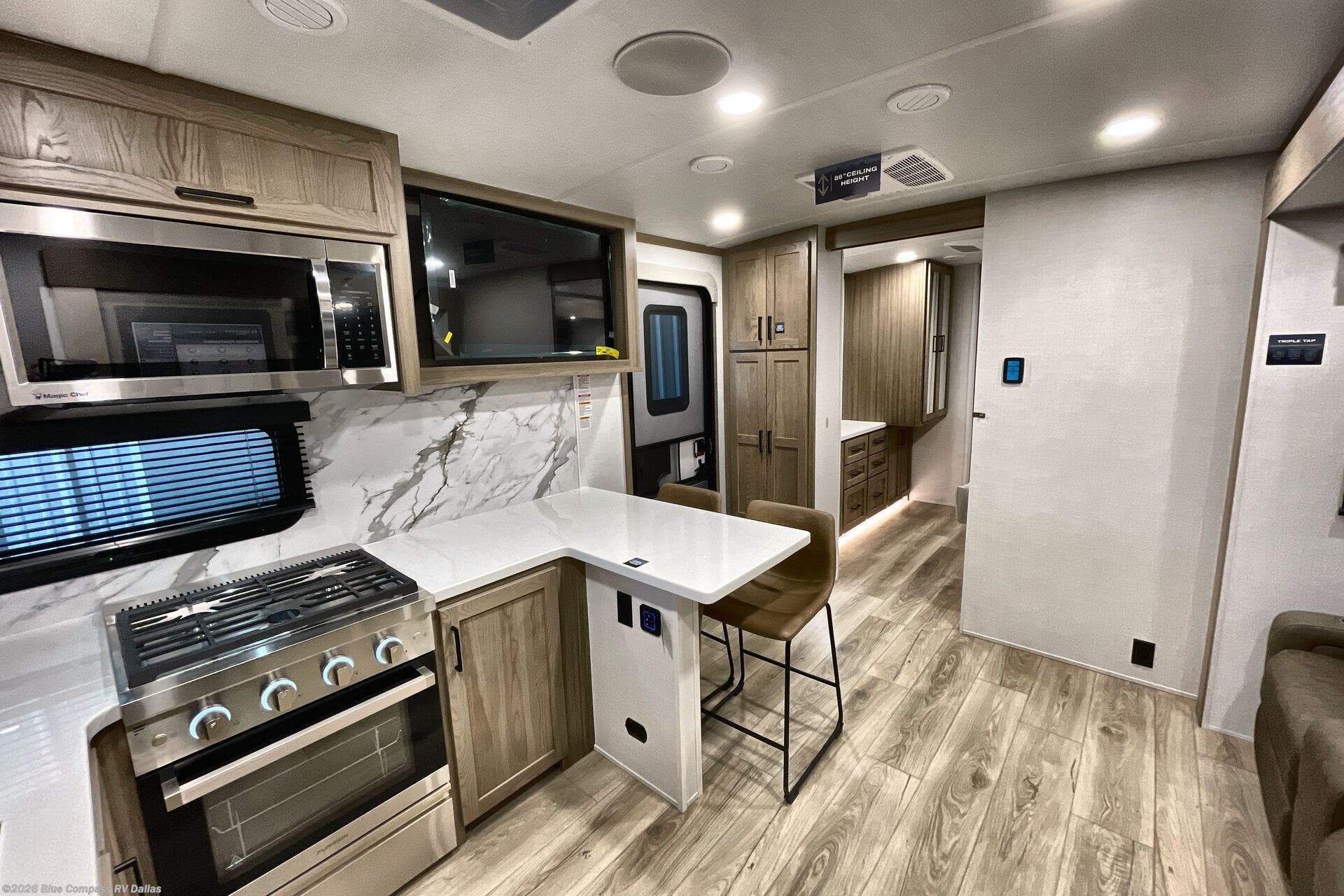 You will love how open this travel trailer will feel with the large front window that you can look out from the two-person bar top seating! The front kitchen has plenty of countertop space for you to prepare your best meals. Your nights will be spent in true relaxation with a 67" theater seating and king bed slide in the bedroom for a great night's rest. The full rear bathroom has a shower with a seat to take a nice, hot shower before bed, and a dual-sink vanity for two to get ready at once in the mornings!