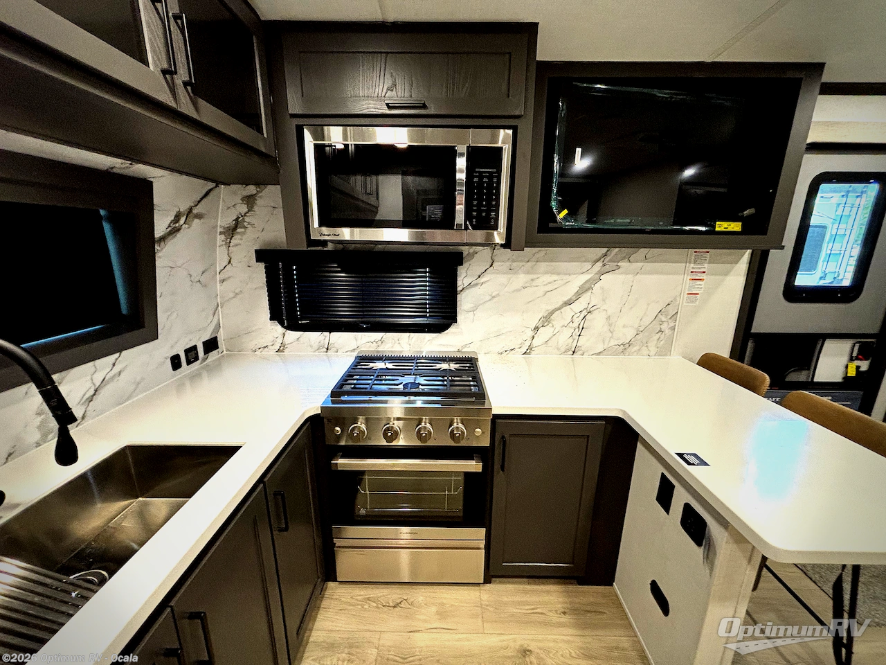 You will love how open this travel trailer will feel with the large front window that you can look out from the two-person bar top seating! The front kitchen has plenty of countertop space for you to prepare your best meals. Your nights will be spent in true relaxation with a 67" theater seating and king bed slide in the bedroom for a great night's rest. The full rear bathroom has a shower with a seat to take a nice, hot shower before bed, and a dual-sink vanity for two to get ready at once in the mornings!