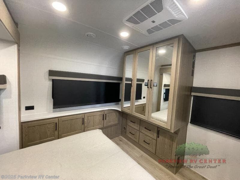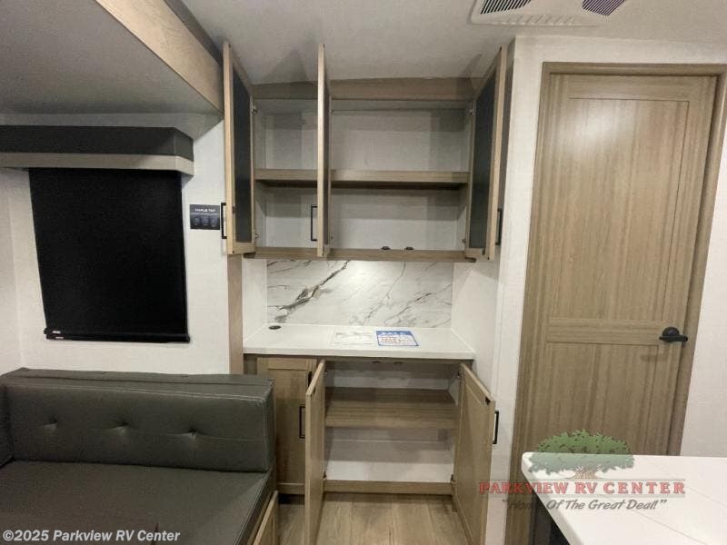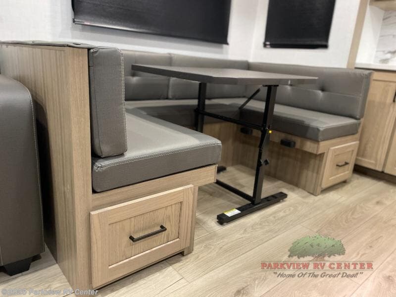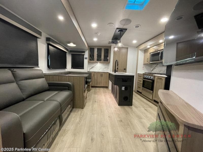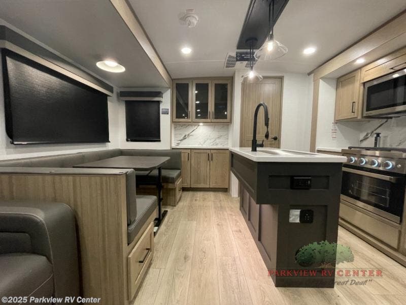 The whole family will love camping in this travel trailer! The kids have their own privacy within the rear bunkhouse that features a 42" x 72" upper bunk with a TV option below it along the curbside, and a flip-up bunk with a 68" pull-out sofa below it along the roadside. After you have prepared a delicious home-cooked meal with the three-burner cooktop and kitchen island, you can head to the 44" x 81" U-shaped dinette where everyone can gather around. You could even prepare dinner at the outside kitchen, set up a table and chairs, and eat underneath one of the two power awnings. The 60" hide-a-bed sofa is the perfect place to sit while enjoying the fireplace or watching your favorite movie on the Smart TV. A dual-entry bathroom makes it easy for everyone to access especially those staying in the front private bedroom!