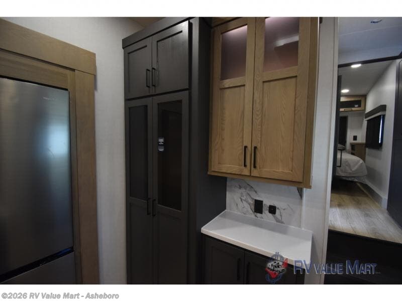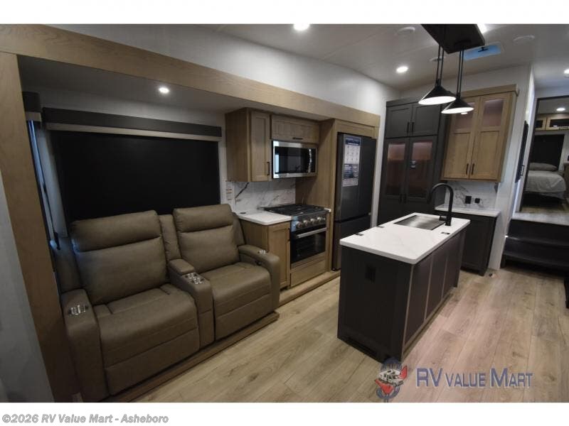 This fifth wheel will feel just like home wherever you decide to roam! The rear living area includes a hide-a-bed sofa with optional recliners, a 60" theater seat across from the TV and fireplace, plus a table and chairs. There is also a pull-out desk if you need to get some work done in the morning. The spacious full bath will let you freshen up each day, and the front private bedroom with a queen bed will provide a great escape each night.
