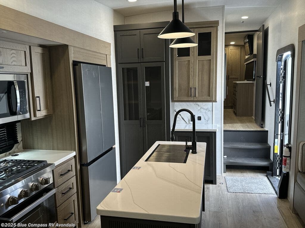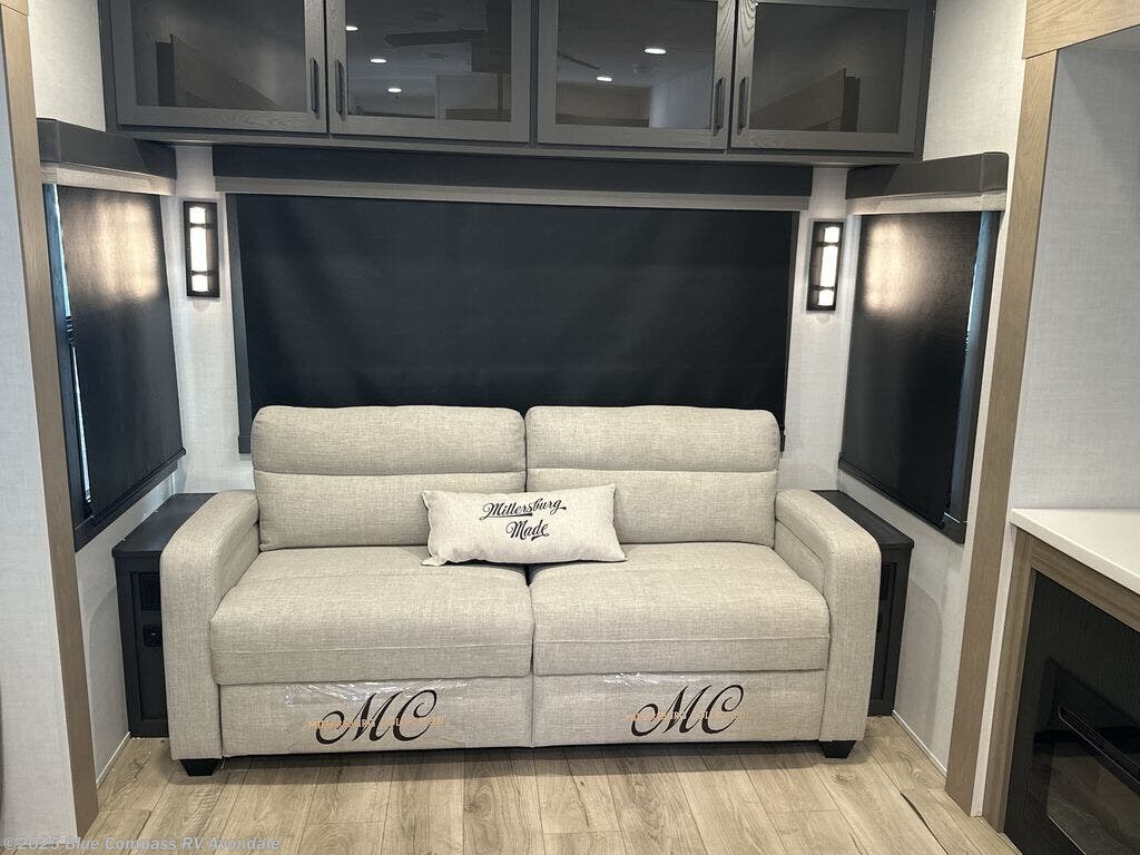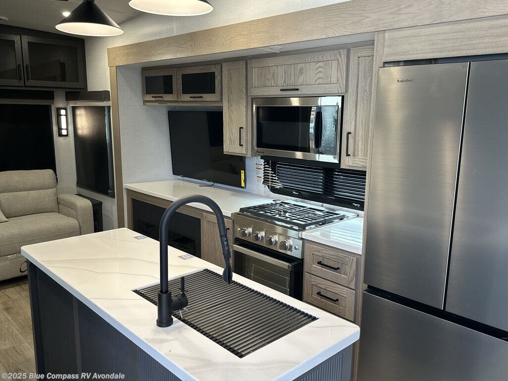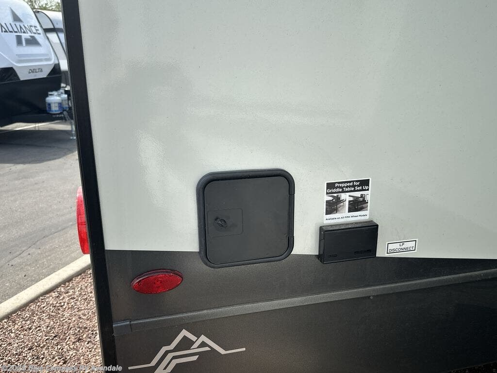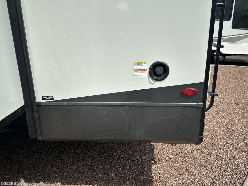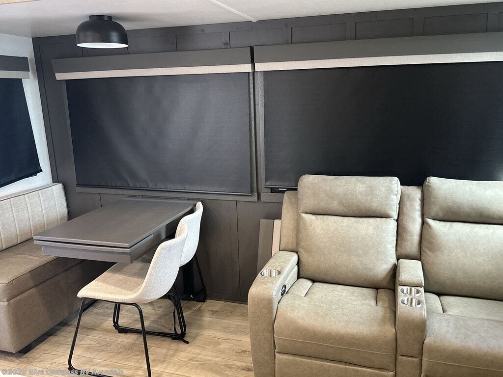 Get ready to enjoy the outdoors while inside with the large windows in both the rear and the door side slide of this fifth wheel. The spacious main living area offers dual opposing slides giving you a great place to invite other RVers over to visit, eat, and even play cards. There is seating for nine from the booth dinette, the theater seats, and the rear hide-a-bed sofa. The cook will have a 12V refrigerator to store lots of drinks and cold food, plus a pantry, and the center island offers extra counter space plus seating. After everyone has left, retire to the front bedroom with a king bed slide, dresser, wardrobe, plus washer and dryer prep if you plan to go full-time!