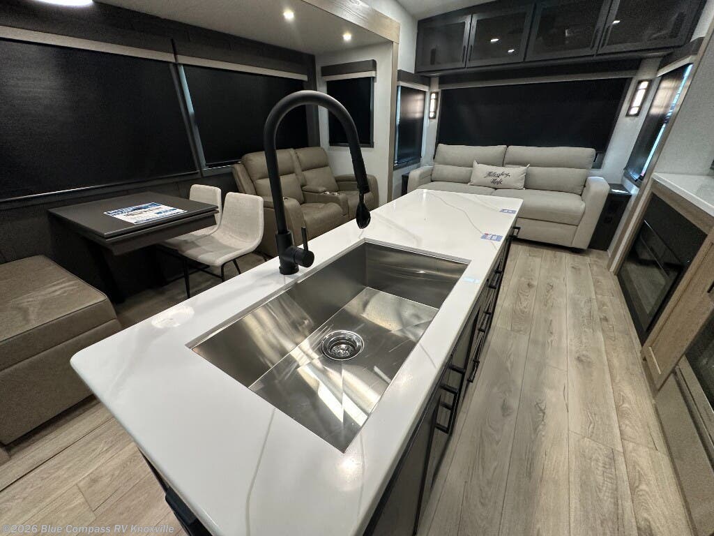 Get ready to enjoy the outdoors while inside with the spacious windows in both the rear and the door side slide of this fifth wheel. The main living area offers dual opposing slides giving you a great place to invite other RVers over to visit, eat, and even play cards. There is seating for nine from the table and chairs with a bench, the theater seats, and the rear hide-a-bed sofa. The cook will have a 12V refrigerator to store lots of drinks and cold food, plus a pantry, and the center island offers extra counter space plus seating. After everyone has left, retire to the front bedroom with a king bed slide, dresser, wardrobe, plus washer and dryer prep if you plan to go full-time!