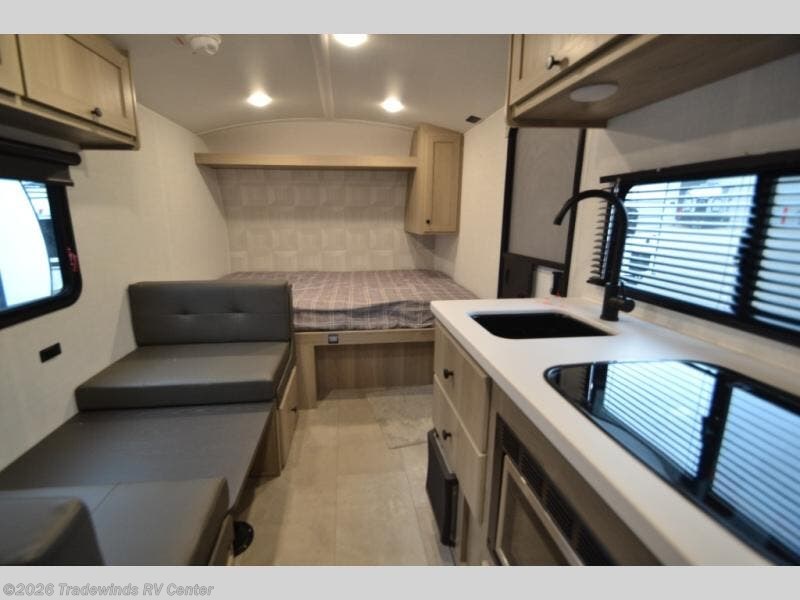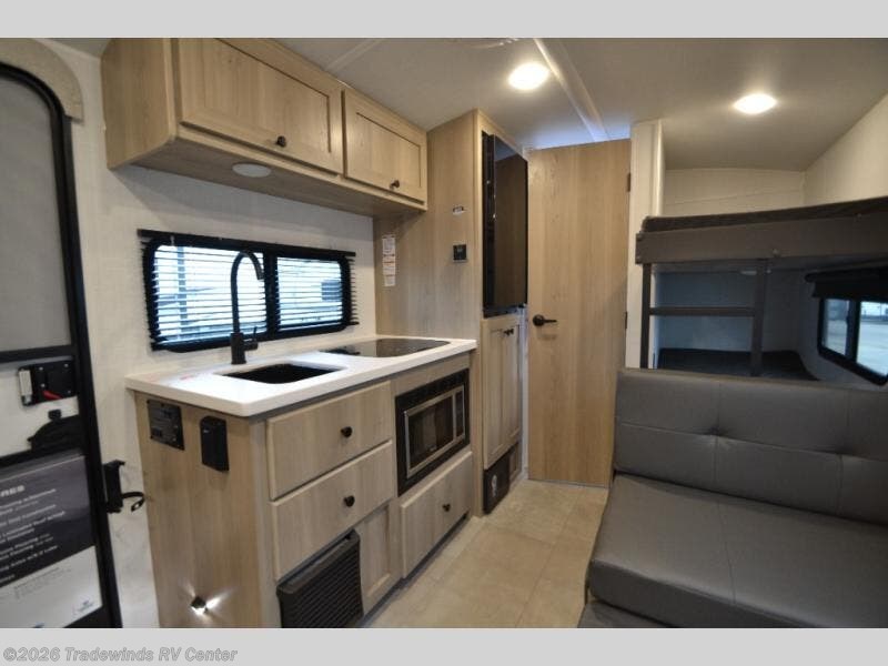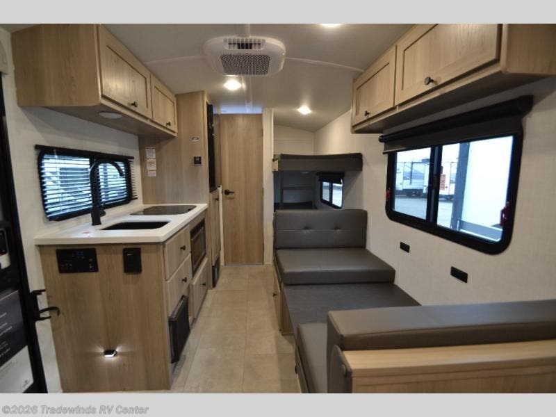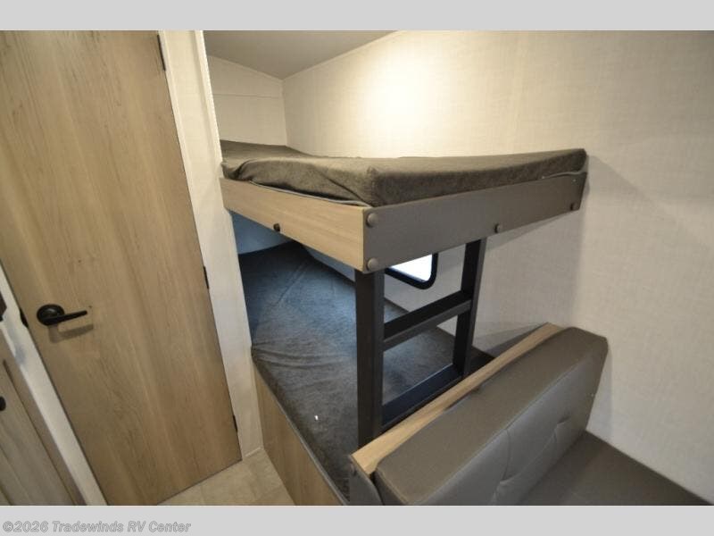 This charming travel trailer is perfect for families or small groups. The front bedroom features a full bed, perfect for a restful night's sleep. Ample storage space ensures you stay organized and clutter-free. The booth dinette is a cozy spot for meals and conversation, while the kitchen area is equipped with a microwave, fridge, and overhead cabinets. Prepare delicious meals and snacks with ease. The bunk beds provide a fun and practical sleeping solution for kids or additional guests. Perfect for sleepovers or family gatherings! The full bathroom is a convenient and refreshing space, with all the essentials for a comfortable stay.