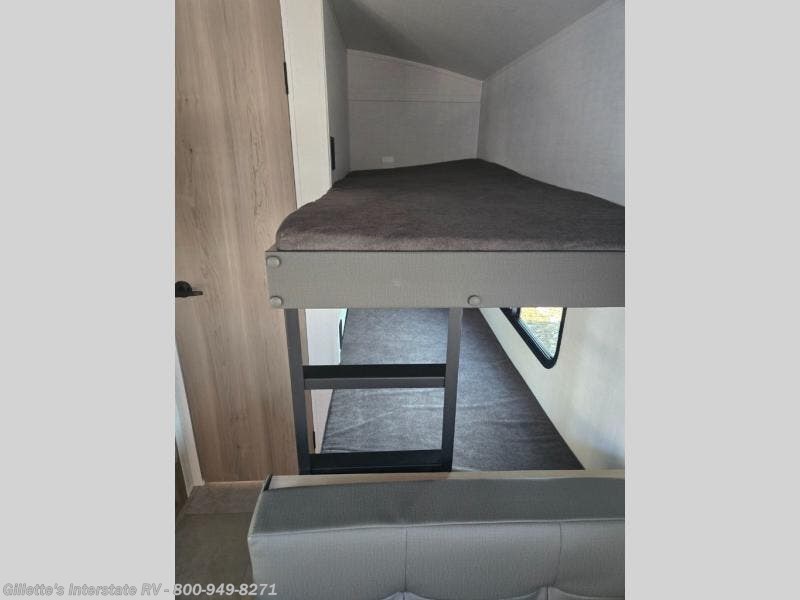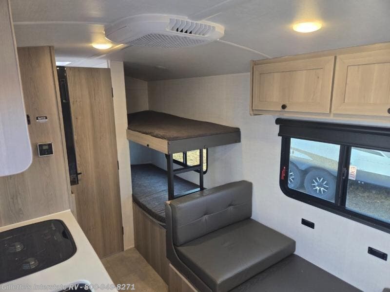 This charming travel trailer is perfect for families or small groups. The front bedroom features a full bed, perfect for a restful night's sleep. Ample storage space ensures you stay organized and clutter-free. The booth dinette is a cozy spot for meals and conversation, while the kitchen area is equipped with a microwave, fridge, and overhead cabinets. Prepare delicious meals and snacks with ease. The bunk beds provide a fun and practical sleeping solution for kids or additional guests. Perfect for sleepovers or family gatherings! The full bathroom is a convenient and refreshing space, with all the essentials for a comfortable stay.