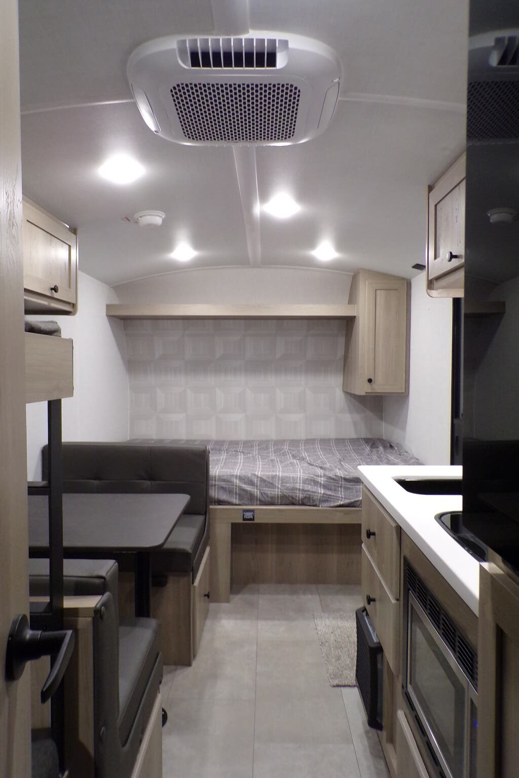Booth Dinette, Bunk Beds, Dinette Bed, Kitchen Sink, Overhead Cabinetry, Roof Vents, Shower, Toilet