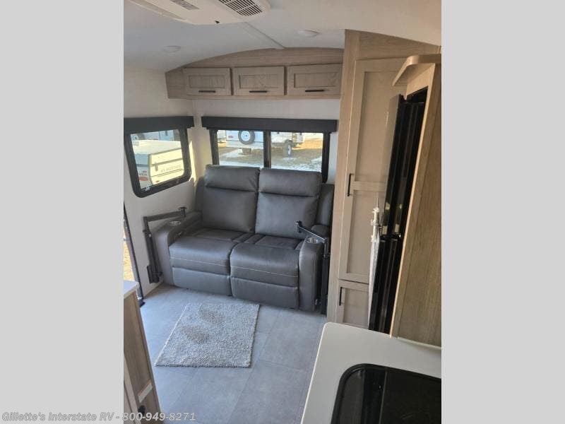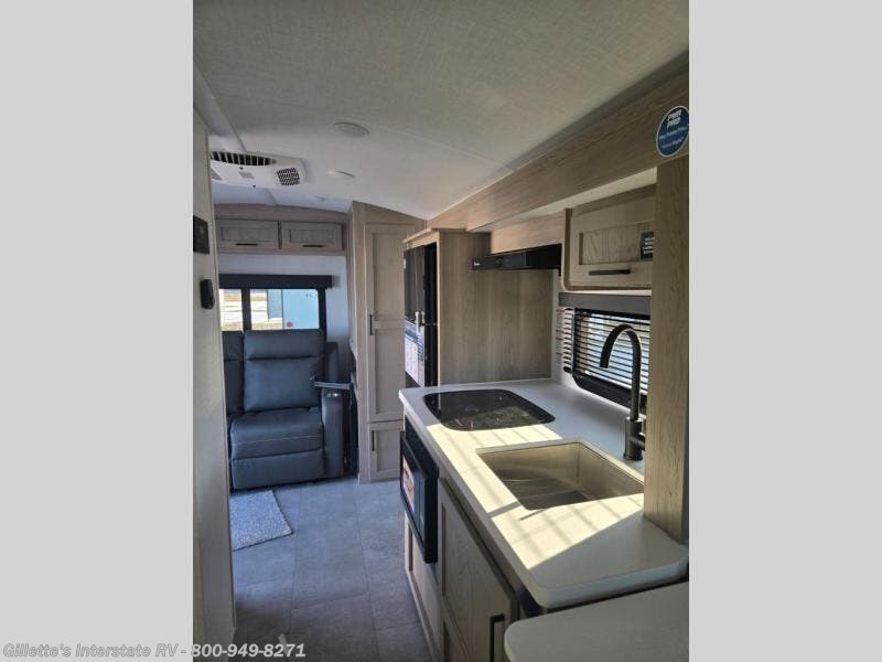 Start having unforgettable adventures with this amazing travel trailer! The queen-sized bed is the perfect spot to unwind and recharge after a day of exploring, offering a restful sleeping space that's sure to leave you feeling refreshed. The full bathroom has everything you need to refresh and rejuvenate in private. In the kitchen-living room combined area, you will find a three-burner cooktop for gourmet meals, a convection microwave for quick and easy cooking, and a spacious fridge to keep your ingredients fresh, plus overhead cabinets and a pantry/closet provide ample storage for cookware, dishes, and food. In addition, you can have endless evenings of amusement in the theater seat, which is the perfect spot to relax and enjoy your favorite shows or movies on the TV. On the outside, the exterior awning provides a shaded spot to enjoy the outdoors, while the pass-through storage offers plenty of room for gear, luggage, and equipment.