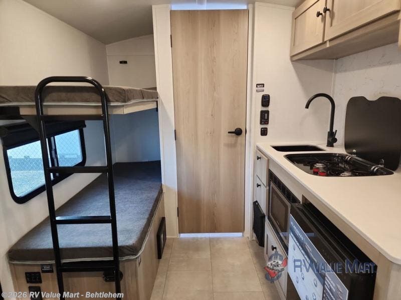 Perfect for couples, families, or friends, this trailer offers a comfortable and functional space to relax, recharge, and explore. The full bathroom is a serene retreat, equipped with everything you need to refresh and rejuvenate after a day of adventure. The two bunk beds give a snug and inviting sleeping spot, perfect for kids or adults looking for a cozy spot to rest. The kitchen is equipped with a microwave for quick and easy meal prep, and a fridge to keep your favorite snacks and drinks fresh. Overhead cabinets provide plenty of storage for your gear, cookware, and essentials, keeping your trailer tidy and organized. The bed offers a restful sleeping space, perfect for unwinding after a long day of exploring.