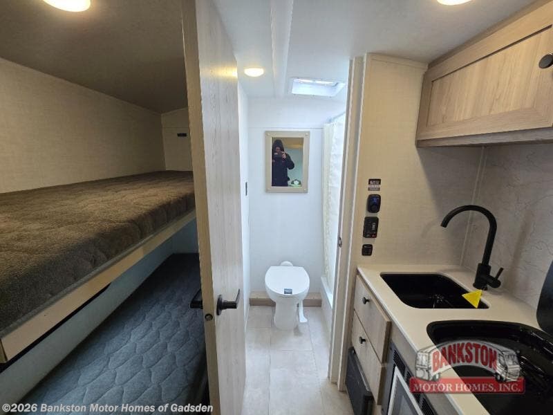 Perfect for couples, families, or friends, this trailer offers a comfortable and functional space to relax, recharge, and explore. The full bathroom is a serene retreat, equipped with everything you need to refresh and rejuvenate after a day of adventure. The two bunk beds give a snug and inviting sleeping spot, perfect for kids or adults looking for a cozy spot to rest. The kitchen is equipped with a microwave for quick and easy meal prep, and a fridge to keep your favorite snacks and drinks fresh. Overhead cabinets provide plenty of storage for your gear, cookware, and essentials, keeping your trailer tidy and organized. The bed offers a restful sleeping space, perfect for unwinding after a long day of exploring.