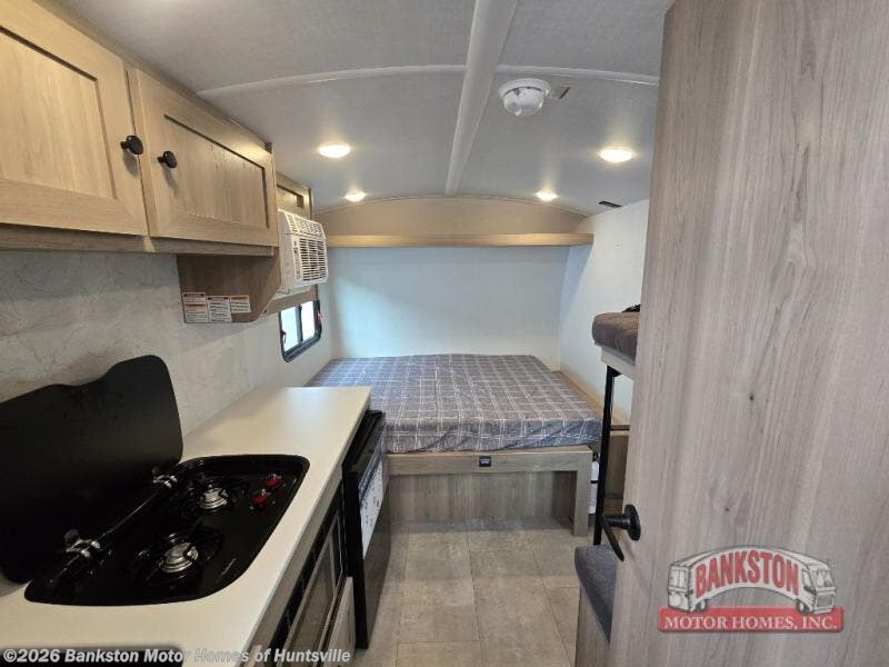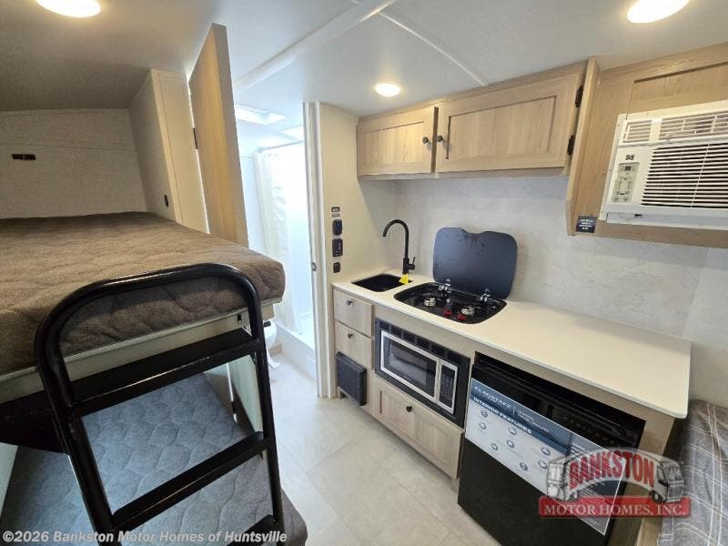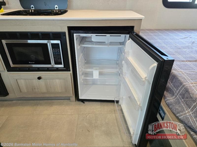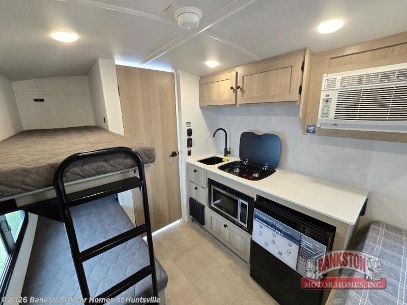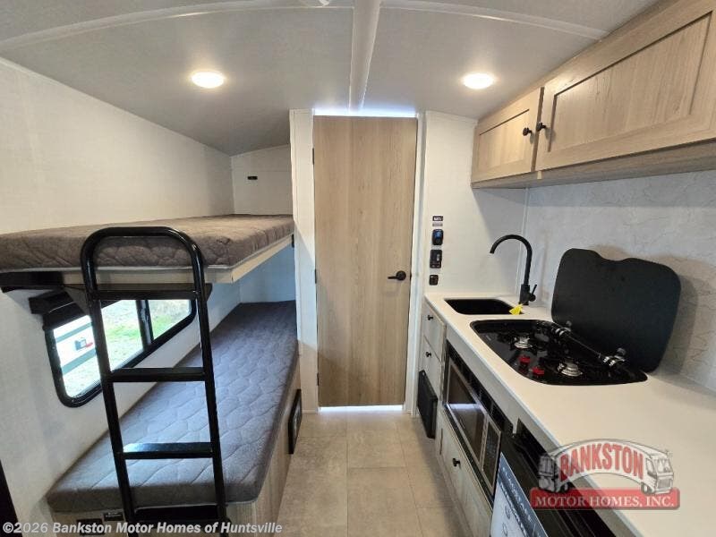 Perfect for couples, families, or friends, this trailer offers a comfortable and functional space to relax, recharge, and explore. The full bathroom is a serene retreat, equipped with everything you need to refresh and rejuvenate after a day of adventure. The two bunk beds give a snug and inviting sleeping spot, perfect for kids or adults looking for a cozy spot to rest. The kitchen is equipped with a microwave for quick and easy meal prep, and a fridge to keep your favorite snacks and drinks fresh. Overhead cabinets provide plenty of storage for your gear, cookware, and essentials, keeping your trailer tidy and organized. The bed offers a restful sleeping space, perfect for unwinding after a long day of exploring.
