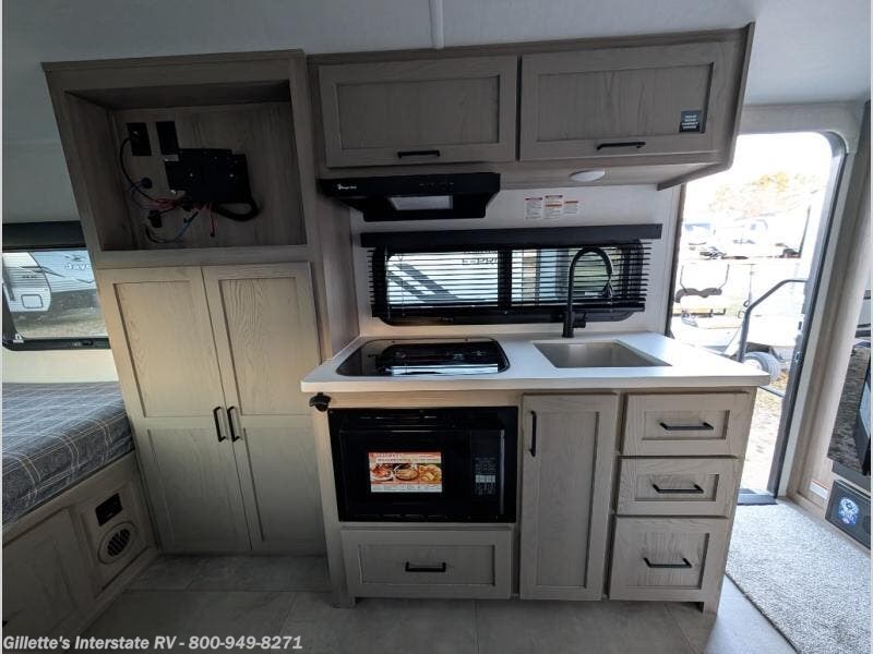 This can be the perfect couples trailer for you or your own RV with more floor space to move around thanks to the slide out sofa with a 30" x 15" table which offers sleeping space for friends. You will have a queen bed to lay your head up front, and everyone can watch the 12V TV. The wardrobe and overhead cabinets give you clothing storage, and the kitchen cooktop and microwave allow the cook to make warm meals. And the 12V refrigerator is conveniently next to the entry so you can grab a drink on your way out to relax under the 11' power awning.