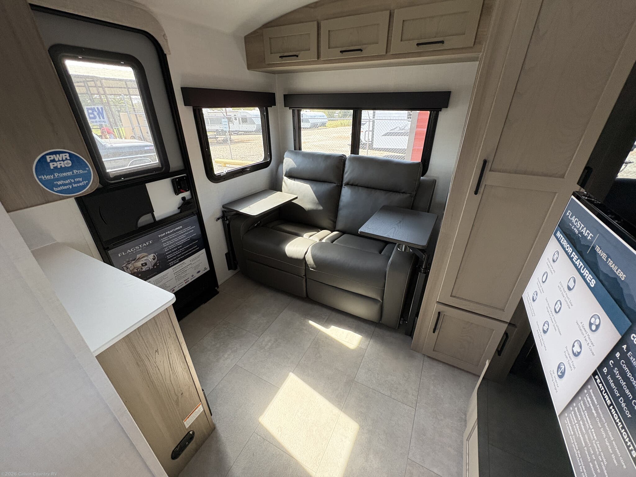 The campground will feel like home in this 2026 Forest River Flagstaff E-Pro E19RL. Be a part of the Forest River family with this 2026 Forest River Flagstaff E-Pro E19RL. If you’re looking for a couples RV, you’ve found it: this rig sleeps 2. Setup is a breeze thanks to one roomy slide. The theater seating and , or TV make it easy to spend time together . Use the dinette for dinner time, homeschooling or remote work days. You’ll never get too hot or too cold inside your rig thanks to the A/C option. Go longer without filling up thanks to the 31 gallon fresh water tanks. The exterior features make camping a breeze, such as detachable power cord, external shower, fiberglass sidewalls, griddle, power awning, skylight, slideout, spare tire kit and tinted windows. Wash up from your adventures with the outside shower.