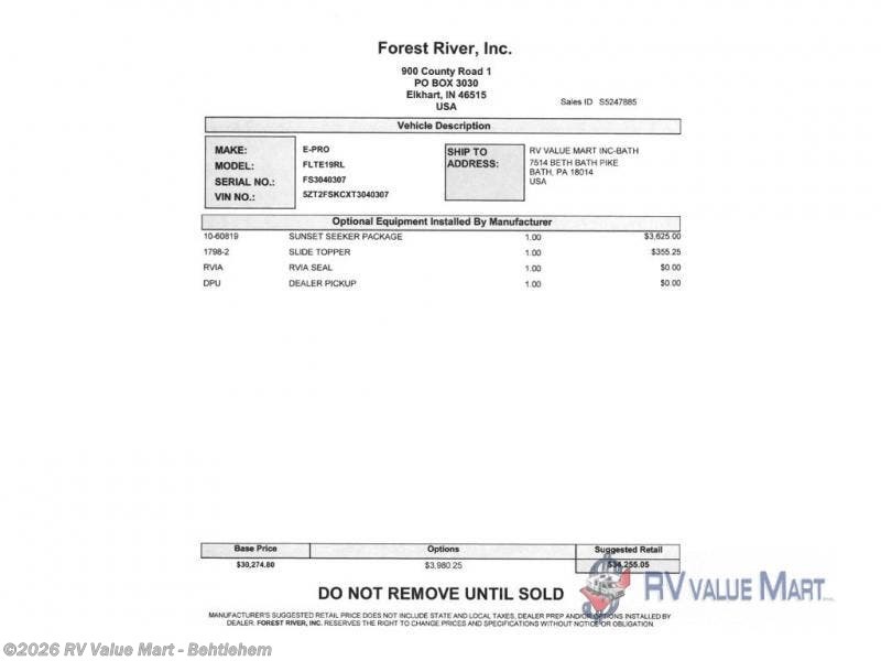 Request More Info on this 2026 Forest River Flagstaff E-Pro E19RL Offered for sale by RV Value Mart - Behtlehem