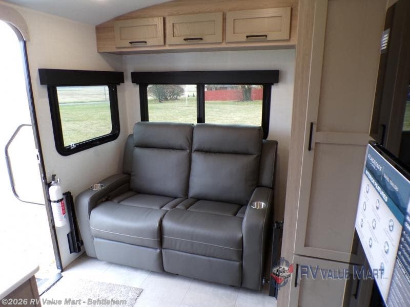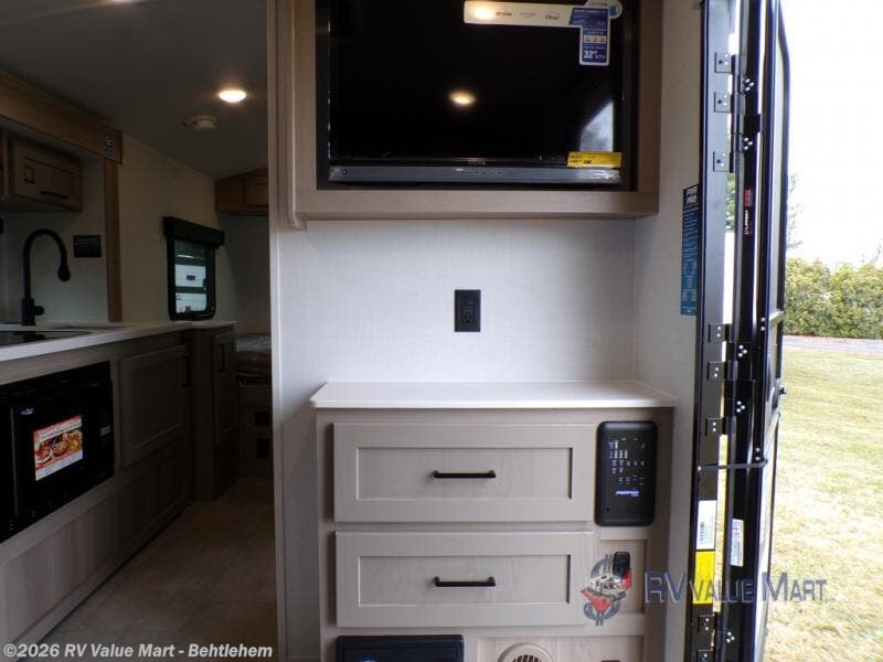 Start having unforgettable adventures with this amazing travel trailer! The queen-sized bed is the perfect spot to unwind and recharge after a day of exploring, offering a restful sleeping space that's sure to leave you feeling refreshed. The full bathroom has everything you need to refresh and rejuvenate in private. In the kitchen-living room combined area, you will find a three-burner cooktop for gourmet meals, a convection microwave for quick and easy cooking, and a spacious fridge to keep your ingredients fresh, plus overhead cabinets and a pantry/closet provide ample storage for cookware, dishes, and food. In addition, you can have endless evenings of amusement in the theater seat, which is the perfect spot to relax and enjoy your favorite shows or movies on the TV. On the outside, the exterior awning provides a shaded spot to enjoy the outdoors, while the pass-through storage offers plenty of room for gear, luggage, and equipment.