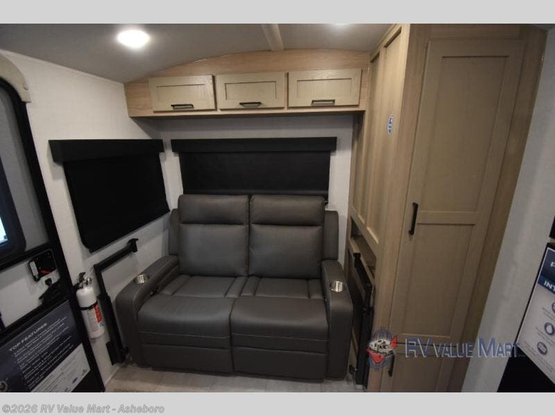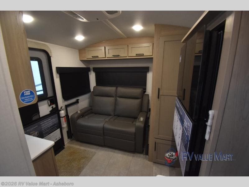 Start having unforgettable adventures with this amazing travel trailer! The queen-sized bed is the perfect spot to unwind and recharge after a day of exploring, offering a restful sleeping space that's sure to leave you feeling refreshed. The full bathroom has everything you need to refresh and rejuvenate in private. In the kitchen-living room combined area, you will find a three-burner cooktop for gourmet meals, a convection microwave for quick and easy cooking, and a spacious fridge to keep your ingredients fresh, plus overhead cabinets and a pantry/closet provide ample storage for cookware, dishes, and food. In addition, you can have endless evenings of amusement in the theater seat, which is the perfect spot to relax and enjoy your favorite shows or movies on the TV. On the outside, the exterior awning provides a shaded spot to enjoy the outdoors, while the pass-through storage offers plenty of room for gear, luggage, and equipment.