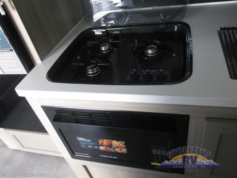 Start having unforgettable adventures with this amazing travel trailer! The queen-sized bed is the perfect spot to unwind and recharge after a day of exploring, offering a restful sleeping space that's sure to leave you feeling refreshed. The full bathroom has everything you need to refresh and rejuvenate in private. In the kitchen-living room combined area, you will find a three-burner cooktop for gourmet meals, a convection microwave for quick and easy cooking, and a spacious fridge to keep your ingredients fresh, plus overhead cabinets and a pantry/closet provide ample storage for cookware, dishes, and food. In addition, you can have endless evenings of amusement in the theater seat, which is the perfect spot to relax and enjoy your favorite shows or movies on the TV. On the outside, the exterior awning provides a shaded spot to enjoy the outdoors, while the pass-through storage offers plenty of room for gear, luggage, and equipment.