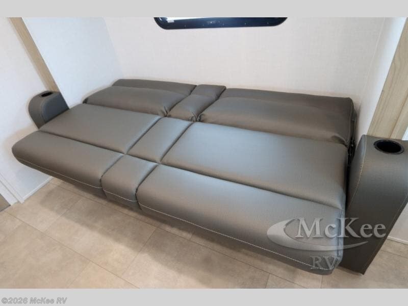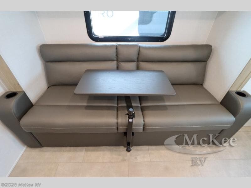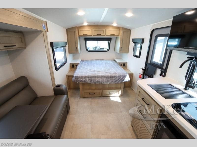 Get ready for a spacious and comfortable trip in this trailer, plus you will have a convenient rear full bathroom with an oversized shower and linen storage to utilize instead of using the campground's facilities. The walk-around full bed gives you two sides with wardrobes to claim as your own. And the kitchen offers full amenities to make meals, and the outside griddle gives you even more choices when cooking. You can relax, dine, or even work from the slide out sofa with a 30" x 15" table and watch the 32" TV. You will find storage along the exterior for your outdoor gear, plus a 14' power awning.