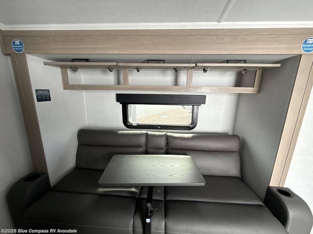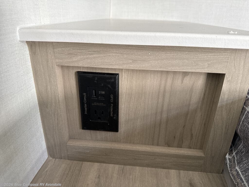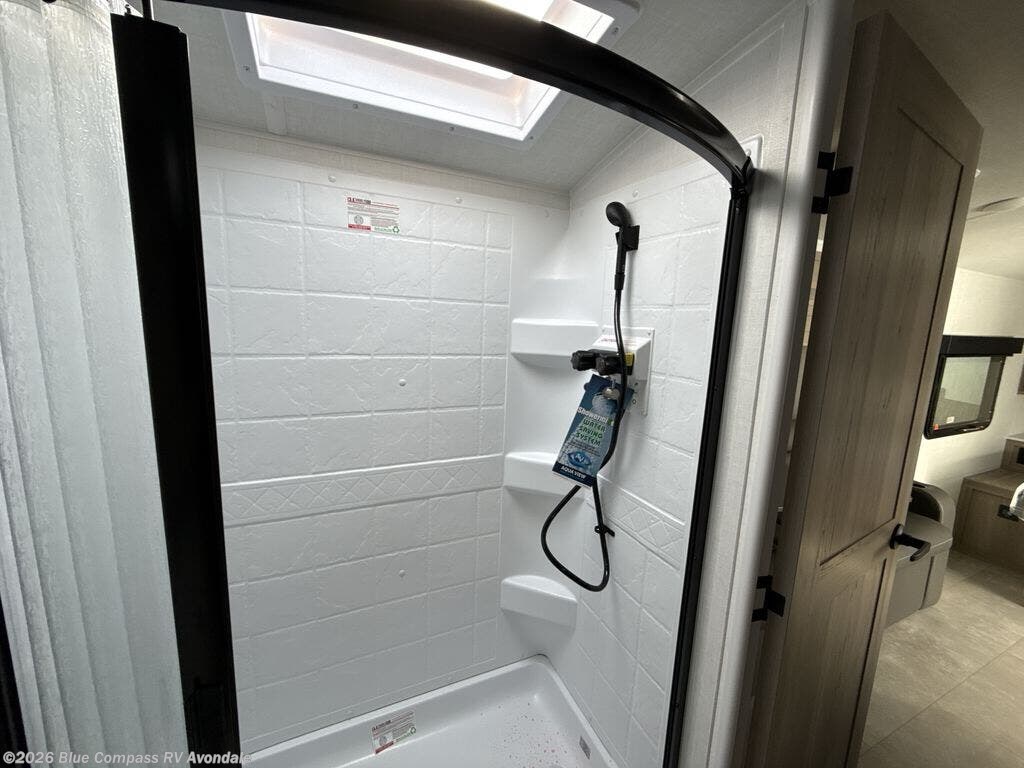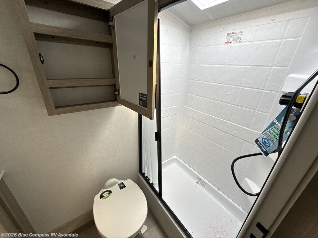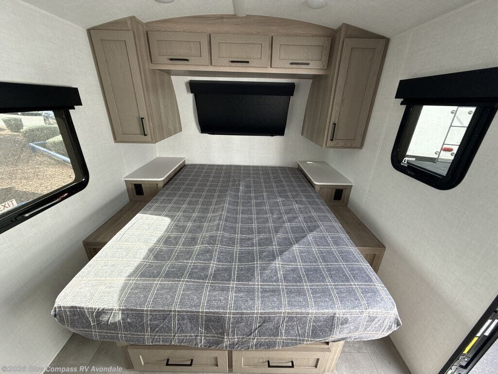 Get ready for a spacious and comfortable trip in this trailer, plus you will have a convenient rear full bathroom with an oversized shower and linen storage to utilize instead of using the campground's facilities. The walk-around full bed gives you two sides with wardrobes to claim as your own. And the kitchen offers full amenities to make meals. You can relax, dine, or even work from the slide out sofa with a 30" x 15" table and watch the TV. You will find storage along the exterior for your outdoor gear, plus a 14' power awning.