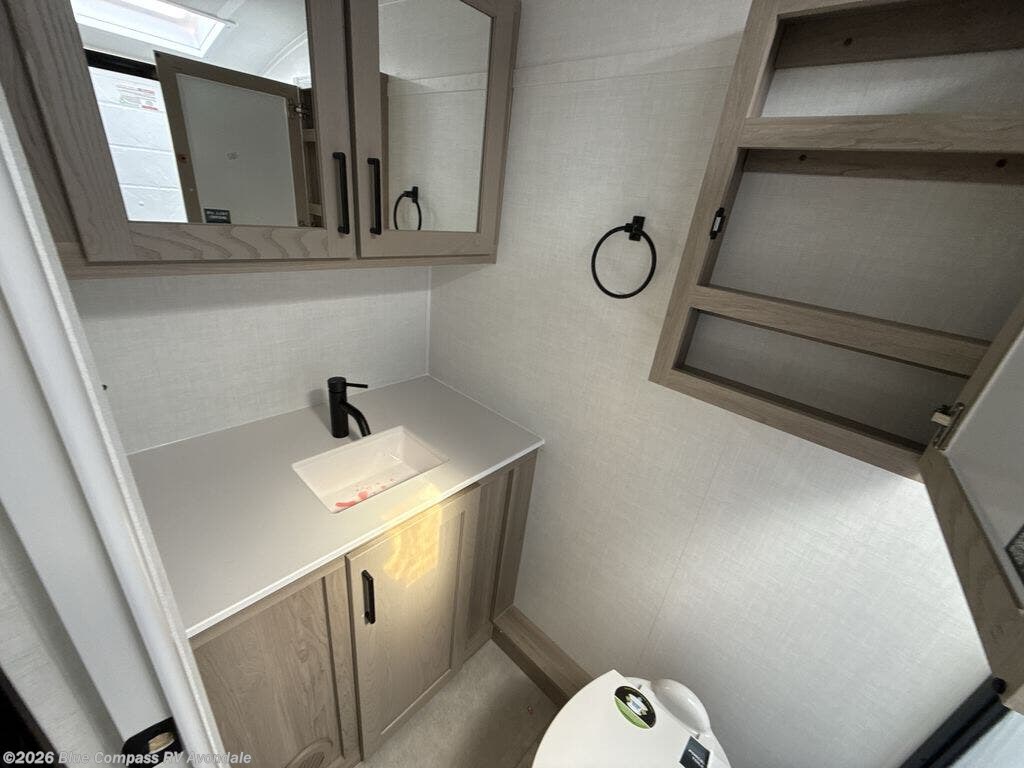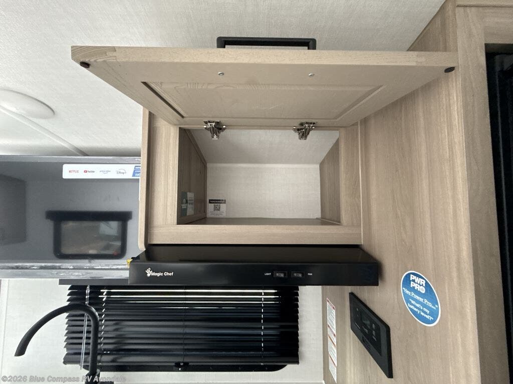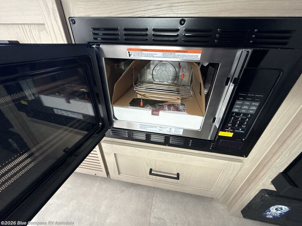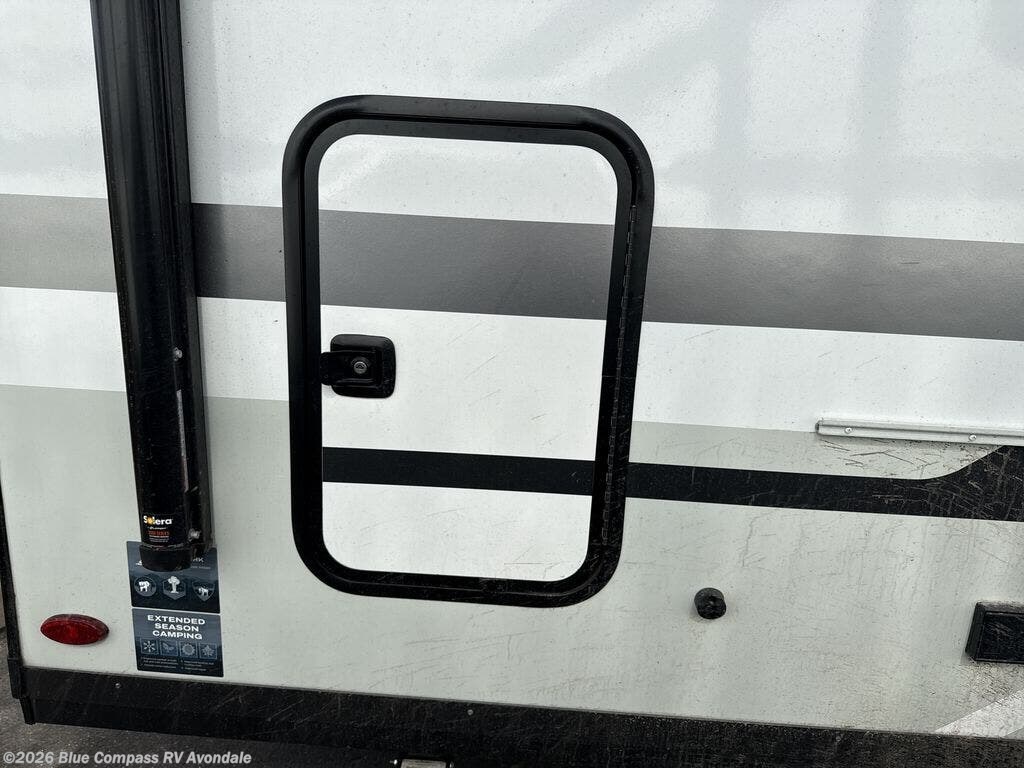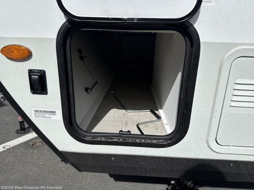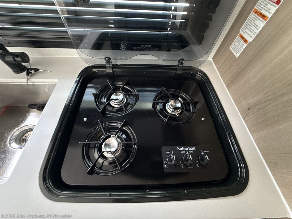 Get ready for a spacious and comfortable trip in this trailer, plus you will have a convenient rear full bathroom with an oversized shower and linen storage to utilize instead of using the campground's facilities. The walk-around full bed gives you two sides with wardrobes to claim as your own. And the kitchen offers full amenities to make meals. You can relax, dine, or even work from the slide out sofa with a 30" x 15" table and watch the TV. You will find storage along the exterior for your outdoor gear, plus a 14' power awning.