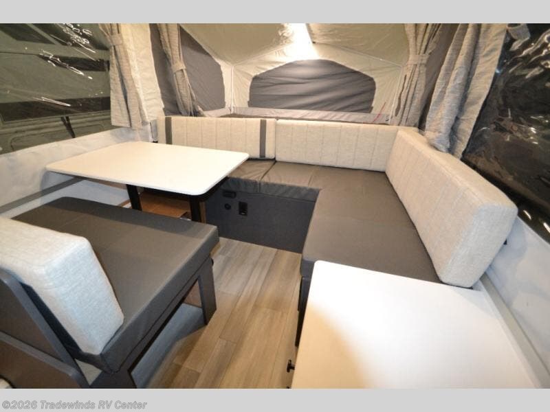 You'll be pleasantly surprised by the amount of comfort in these Flagstaff MAC Series folding pop-up campers by Forest River. Each one is built with a fiberglass laminated roof for added durability and a power roof lift for easy set up. There is also a clay exterior with an alloy band, solar panel prep on the frame, and four stabilizer jacks with sand pads to keep your camper secure. The interior features wood plank flooring, USB charging ports, and stylish Andover Sable wood.