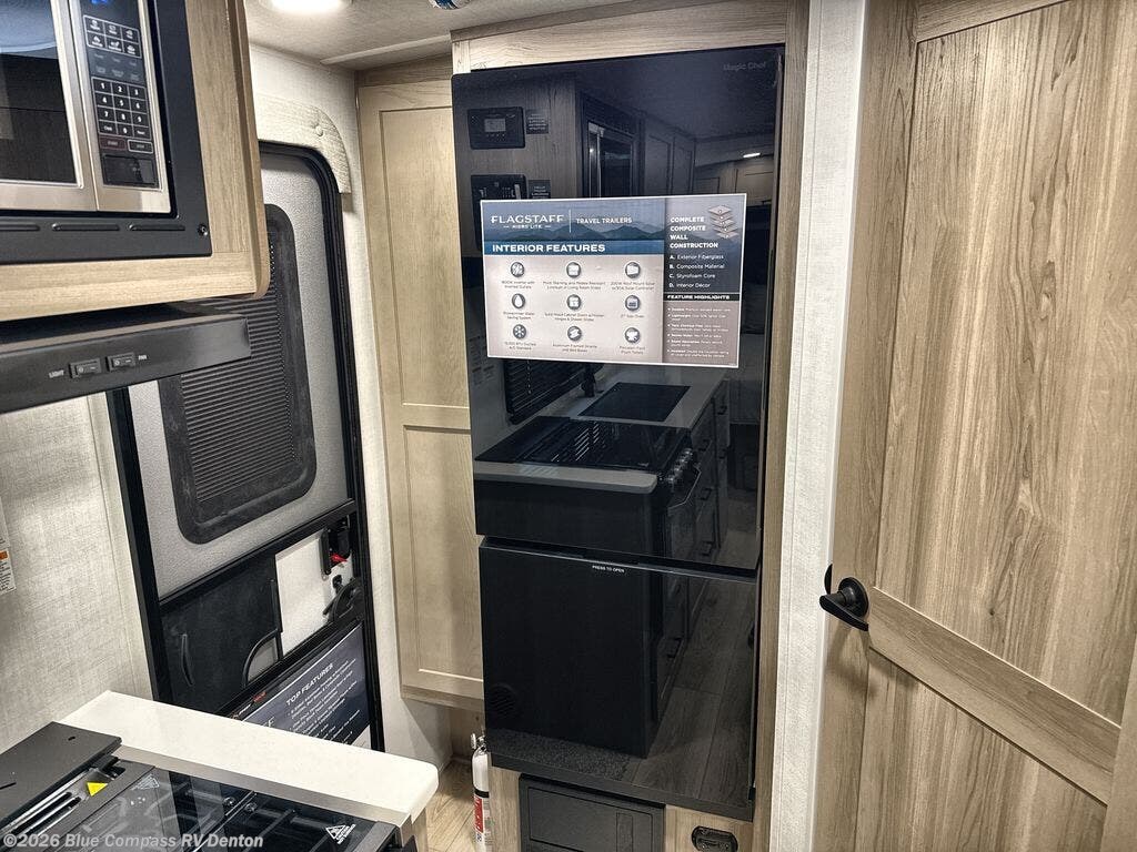 With any Flagstaff Micro Lite travel trailer by Forest River you will enjoy lightweight towing, durable construction, and added interior comforts to make each trip memorable! Each model features RoadTech tire pressure monitoring, Dexter Torflex axles, and nitrogen-filled Goodyear endurance tires for smooth towing from home to campground. The 6-sided aluminum framed construction provides a strong foundation so you can enjoy your RV for years to come, plus the radiant foil in the front cap, underbelly and slides help insulate your trailer. Additional exterior features include a 200W solar panel, back-up camera prep, frameless windows, and slam baggage doors. Each model includes the Great Expectations Package with roller shades, solid surface kitchen countertops, and hidden hinge cabinet doors. There is also an exterior hot/cold water port, outside speakers, a power tongue jack and stabilizer jacks, plus many more conveniences.