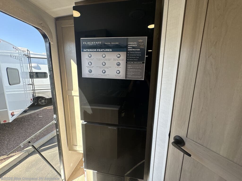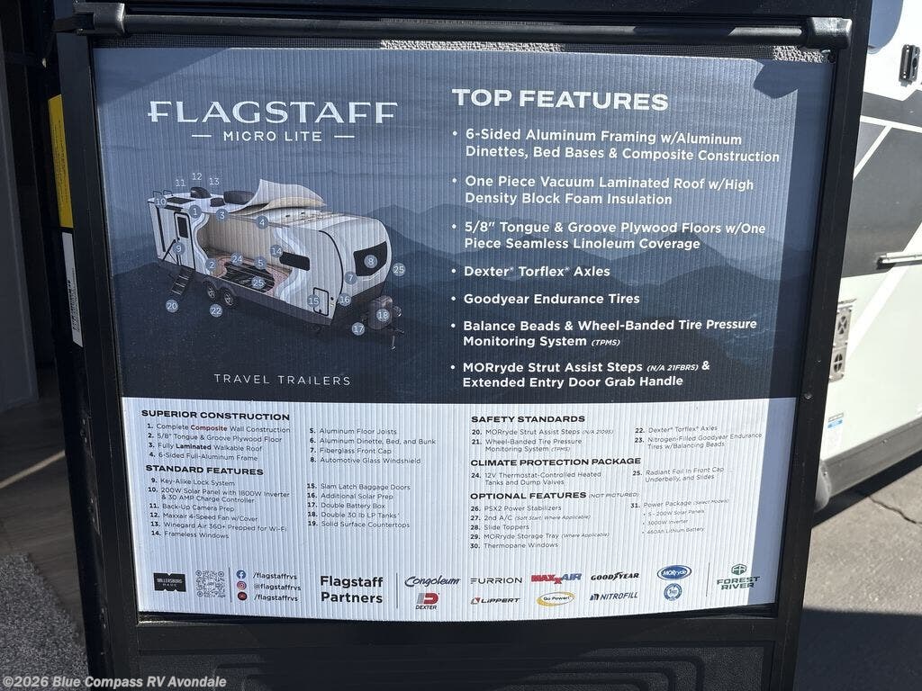 With any Flagstaff Micro Lite travel trailer by Forest River you will enjoy lightweight towing, durable construction, and added interior comforts to make each trip memorable! Each model features RoadTech tire pressure monitoring, Dexter Torflex axles, and nitrogen-filled Goodyear endurance tires for smooth towing from home to campground. The 6-sided aluminum framed construction provides a strong foundation so you can enjoy your RV for years to come, plus the radiant foil in the front cap, underbelly and slides help insulate your trailer. Additional exterior features include a 200W solar panel, back-up camera prep, frameless windows, and slam baggage doors. Each model includes the Great Expectations Package with roller shades, solid surface kitchen countertops, and hidden hinge cabinet doors. There is also an exterior hot/cold water port, outside speakers, a power tongue jack and stabilizer jacks, plus many more conveniences.