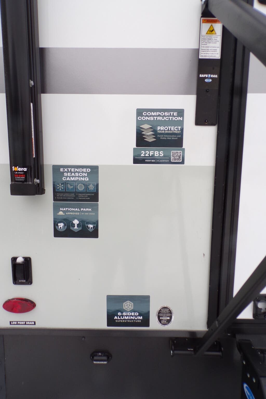 - Awnings, power awning, and slam latch baggage doors for easy outdoor living