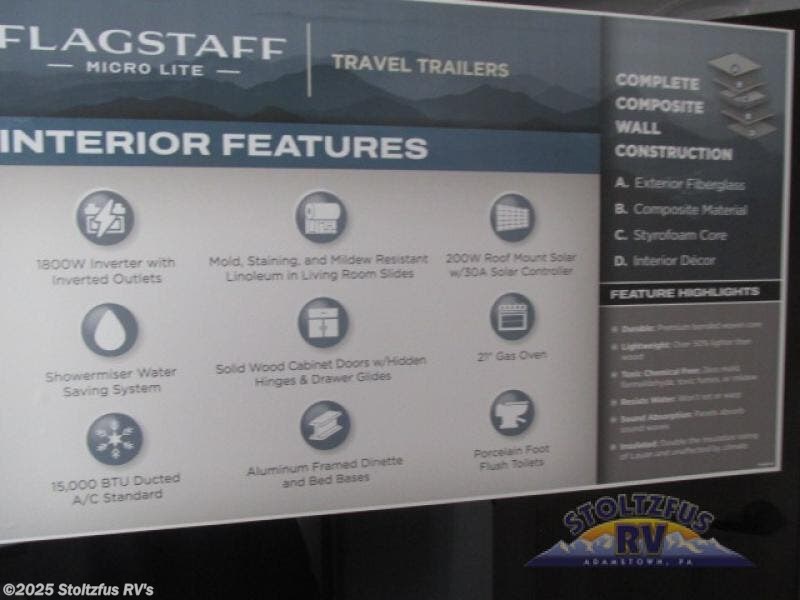With any Flagstaff Micro Lite travel trailer by Forest River you will enjoy lightweight towing, durable construction, and added interior comforts to make each trip memorable! Each model features RoadTech tire pressure monitoring, Dexter Torflex axles, and nitrogen-filled Goodyear endurance tires for smooth towing from home to campground. The 6-sided aluminum framed construction provides a strong foundation so you can enjoy your RV for years to come, plus the radiant foil in the front cap, underbelly and slides help insulate your trailer. Additional exterior features include a 200W solar panel, back-up camera prep, frameless windows, and slam baggage doors. Each model includes the Great Expectations Package with roller shades, solid surface kitchen countertops, and hidden hinge cabinet doors. There is also an exterior hot/cold water port, outside speakers, a power tongue jack and stabilizer jacks, plus many more conveniences.