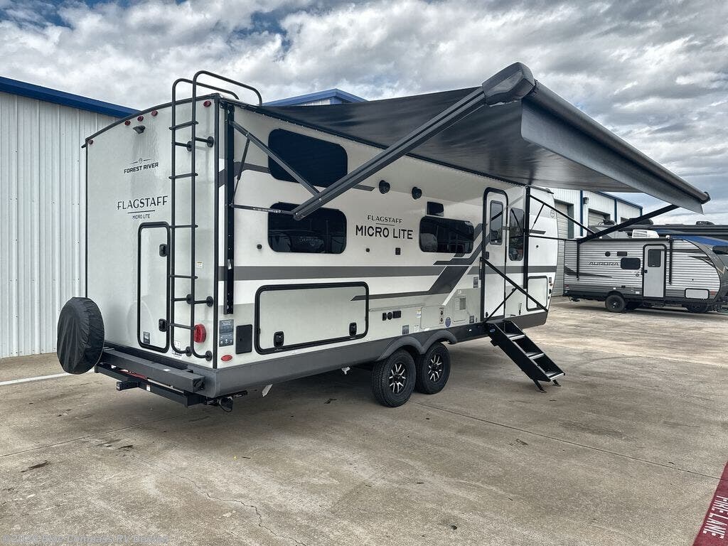 With any Flagstaff Micro Lite travel trailer by Forest River you will enjoy lightweight towing, durable construction, and added interior comforts to make each trip memorable! Each model features RoadTech tire pressure monitoring, Dexter Torflex axles, and nitrogen-filled Goodyear endurance tires for smooth towing from home to campground. The 6-sided aluminum framed construction provides a strong foundation so you can enjoy your RV for years to come, plus the radiant foil in the front cap, underbelly and slides help insulate your trailer. Additional exterior features include a 200W solar panel, back-up camera prep, frameless windows, and slam baggage doors. Each model includes the Great Expectations Package with roller shades, solid surface kitchen countertops, and hidden hinge cabinet doors. There is also an exterior hot/cold water port, outside speakers, a power tongue jack and stabilizer jacks, plus many more conveniences.