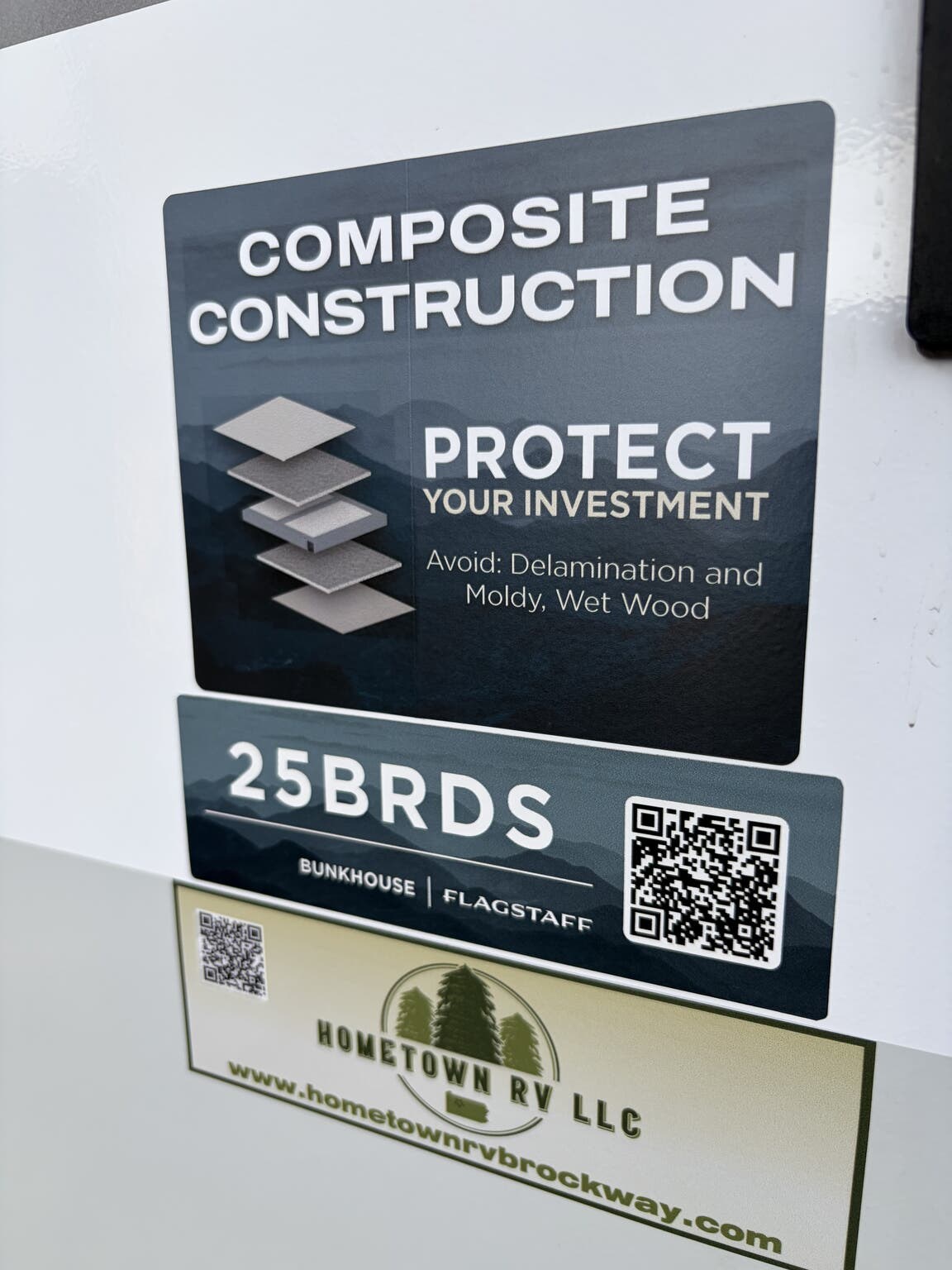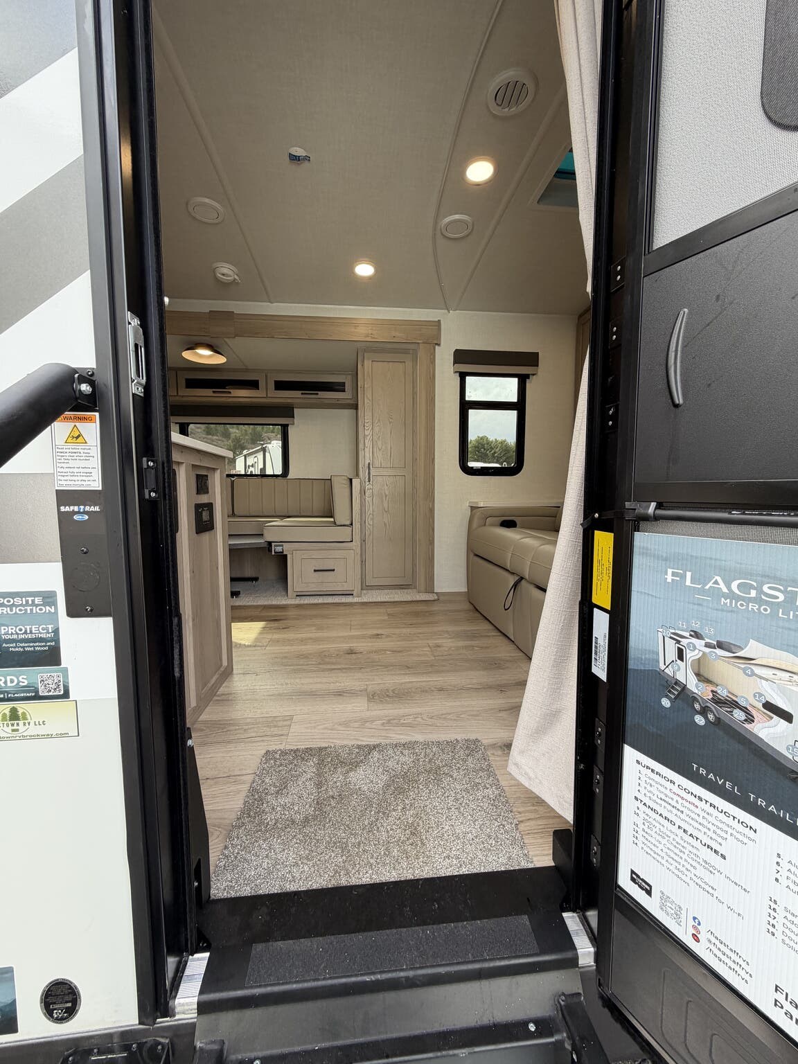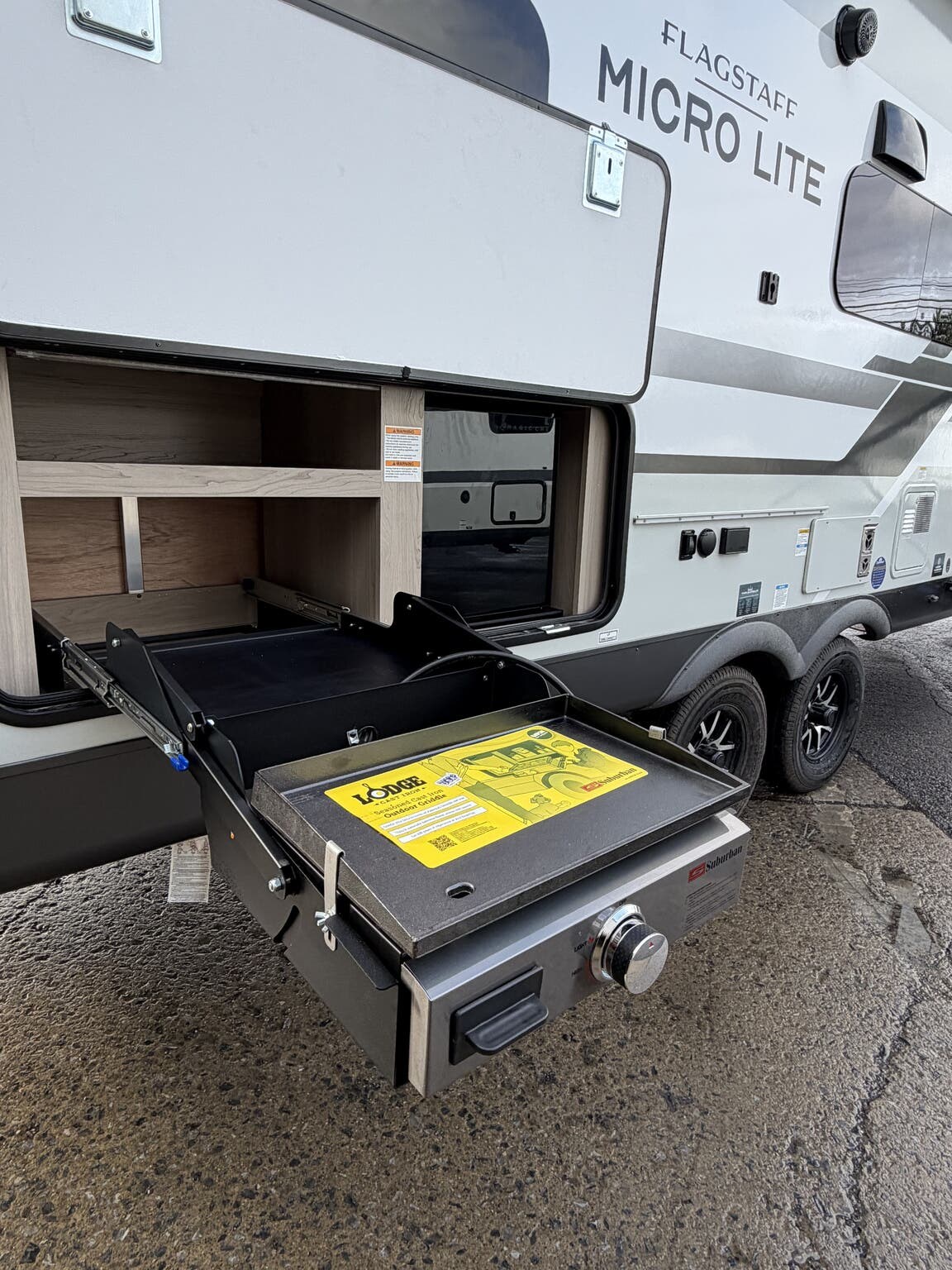 Everything you need for the perfect RV trip is packed into this 2026 Forest River Flagstaff Micro Lite 25BRDS. This 2026 Forest River Flagstaff Micro Lite 25BRDS welcomes you into the Forest River family! This rig sleeps 8, so it makes the perfect family RV. Setup is a breeze thanks to one roomy slide. Entertain or cook up a cozy meal just for you in this RV kitchen equipped with the fridge, oven. The TV make it easy to spend time together as a family. Use the dinette bed for dinner time, homeschooling or remote work days. The dinette bed makes it a perfect camper for couples. You’ll never get too hot or too cold inside your rig thanks to the heating option. Go longer without filling up thanks to the 54 gallon fresh water tanks. The exterior features make camping a breeze, such as alloy wheels, aluminum entrance steps, awning, black tank flush, detachable power cord, enclosed underbelly, external shower, fiberglass sidewalls, hitch, ladder, pass thru storage, power awning, power hitch jack, power stabilizer jacks, screen door, skylight, slam latch baggage doors, slideout, stabilizer jacks and tinted windows. Wash up from your adventures with the outside shower. Never run out of room for your belongings thanks to the pass-through storage underneath.