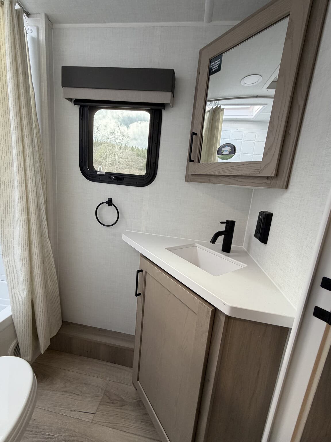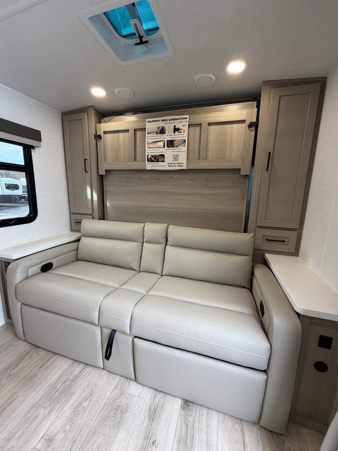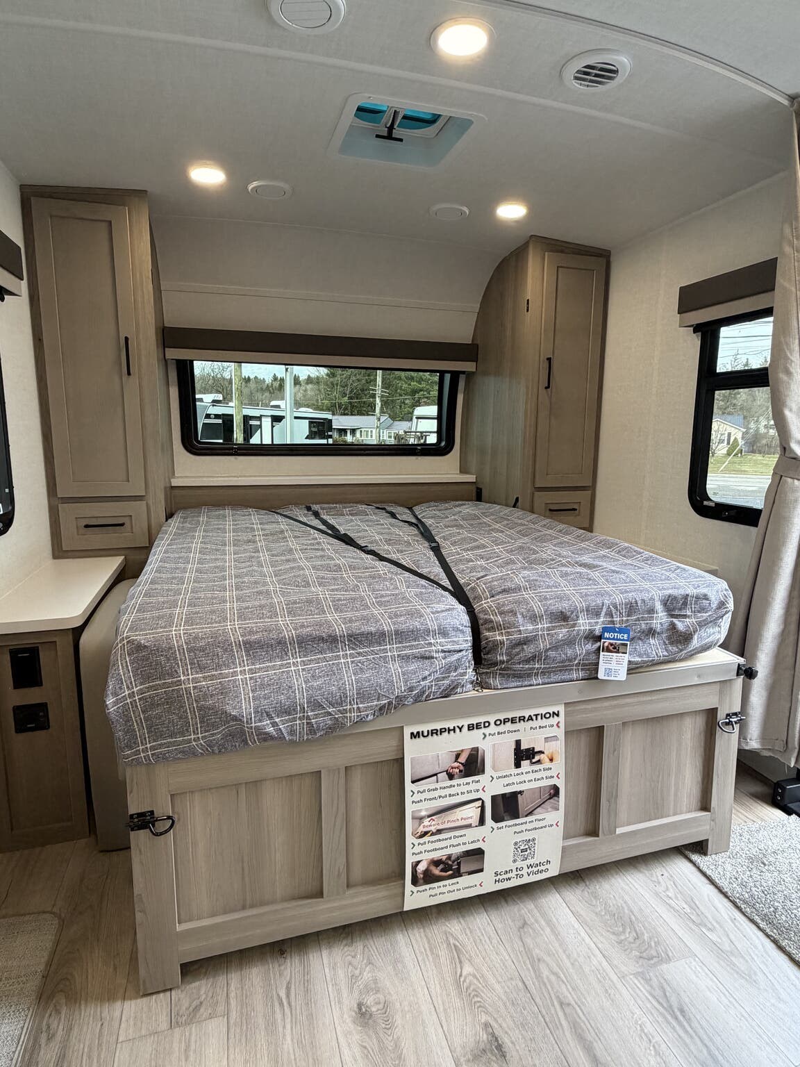 Bunk Beds, Dinette Bed, Kitchen Sink, Medicine Cabinet, Murphy Bed, Queen Bed, Queen Mattress, Shower, Solid Surface Countertops, Toilet, U-Shaped Dinette