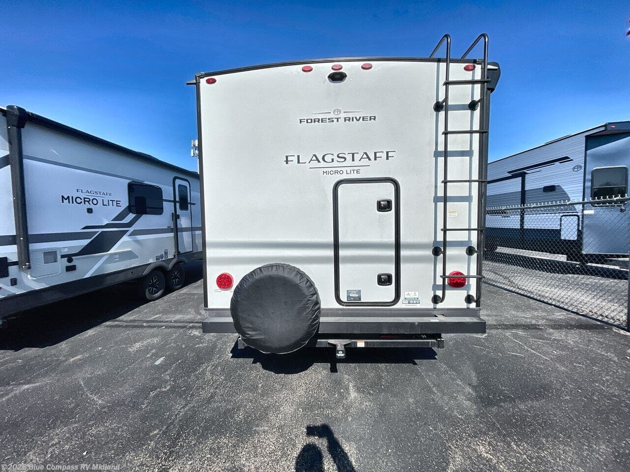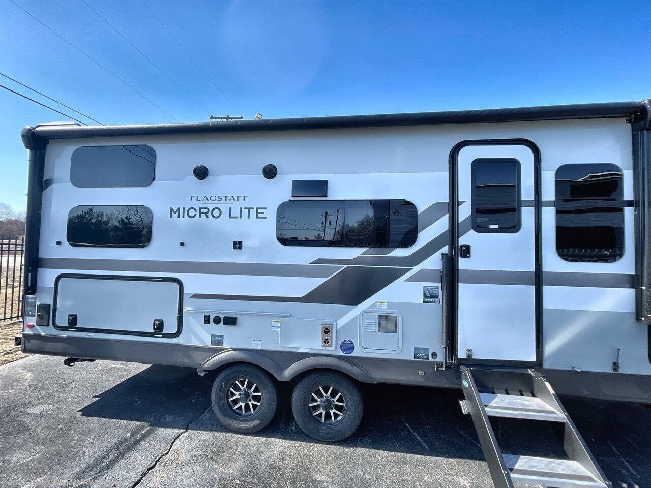 With any Flagstaff Micro Lite travel trailer by Forest River you will enjoy lightweight towing, durable construction, and added interior comforts to make each trip memorable! Each model features RoadTech tire pressure monitoring, Dexter Torflex axles, and nitrogen-filled Goodyear endurance tires for smooth towing from home to campground. The 6-sided aluminum framed construction provides a strong foundation so you can enjoy your RV for years to come, plus the radiant foil in the front cap, underbelly and slides help insulate your trailer. Additional exterior features include a 200W solar panel, back-up camera prep, frameless windows, and slam baggage doors. Each model includes the Great Expectations Package with roller shades, solid surface kitchen countertops, and hidden hinge cabinet doors. There is also an exterior hot/cold water port, outside speakers, a power tongue jack and stabilizer jacks, plus many more conveniences.