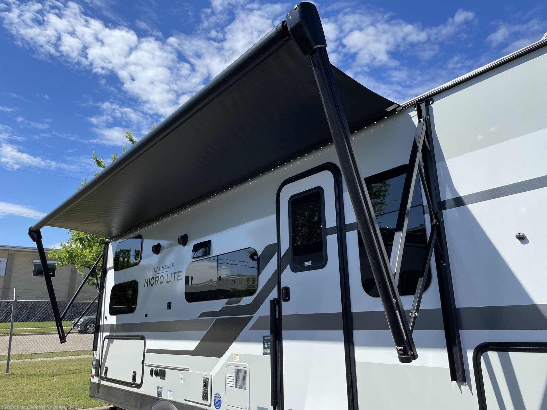 With any Flagstaff Micro Lite travel trailer by Forest River you will enjoy lightweight towing, durable construction, and added interior comforts to make each trip memorable! Each model features RoadTech tire pressure monitoring, Dexter Torflex axles, and nitrogen-filled Goodyear endurance tires for smooth towing from home to campground. The 6-sided aluminum framed construction provides a strong foundation so you can enjoy your RV for years to come, plus the radiant foil in the front cap, underbelly and slides help insulate your trailer. Additional exterior features include a 200W solar panel, back-up camera prep, frameless windows, and slam baggage doors. Each model includes the Great Expectations Package with roller shades, solid surface kitchen countertops, and hidden hinge cabinet doors. There is also an exterior hot/cold water port, outside speakers, a power tongue jack and stabilizer jacks, plus many more conveniences.