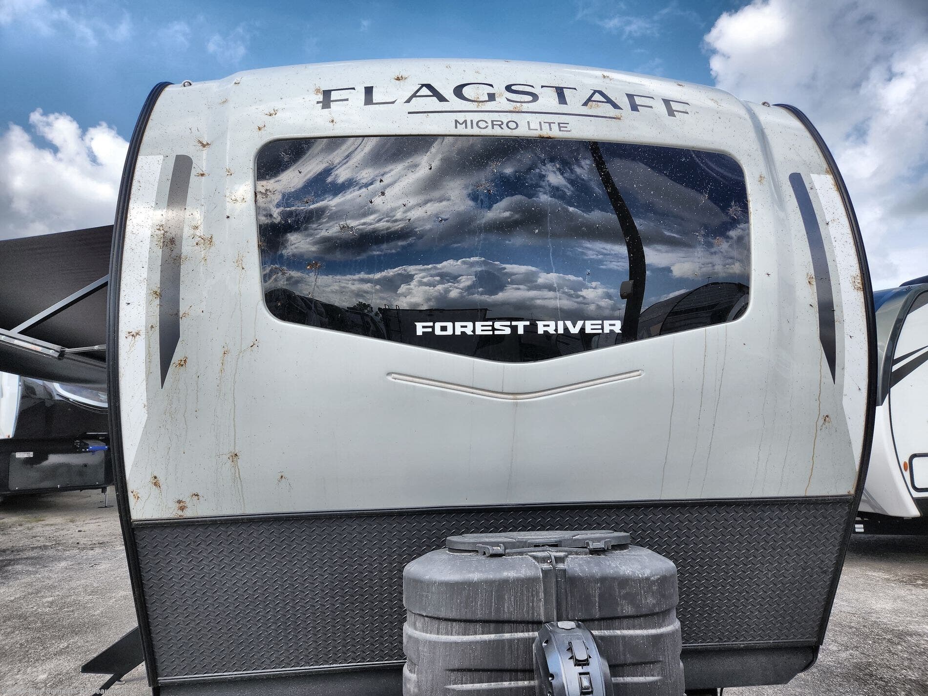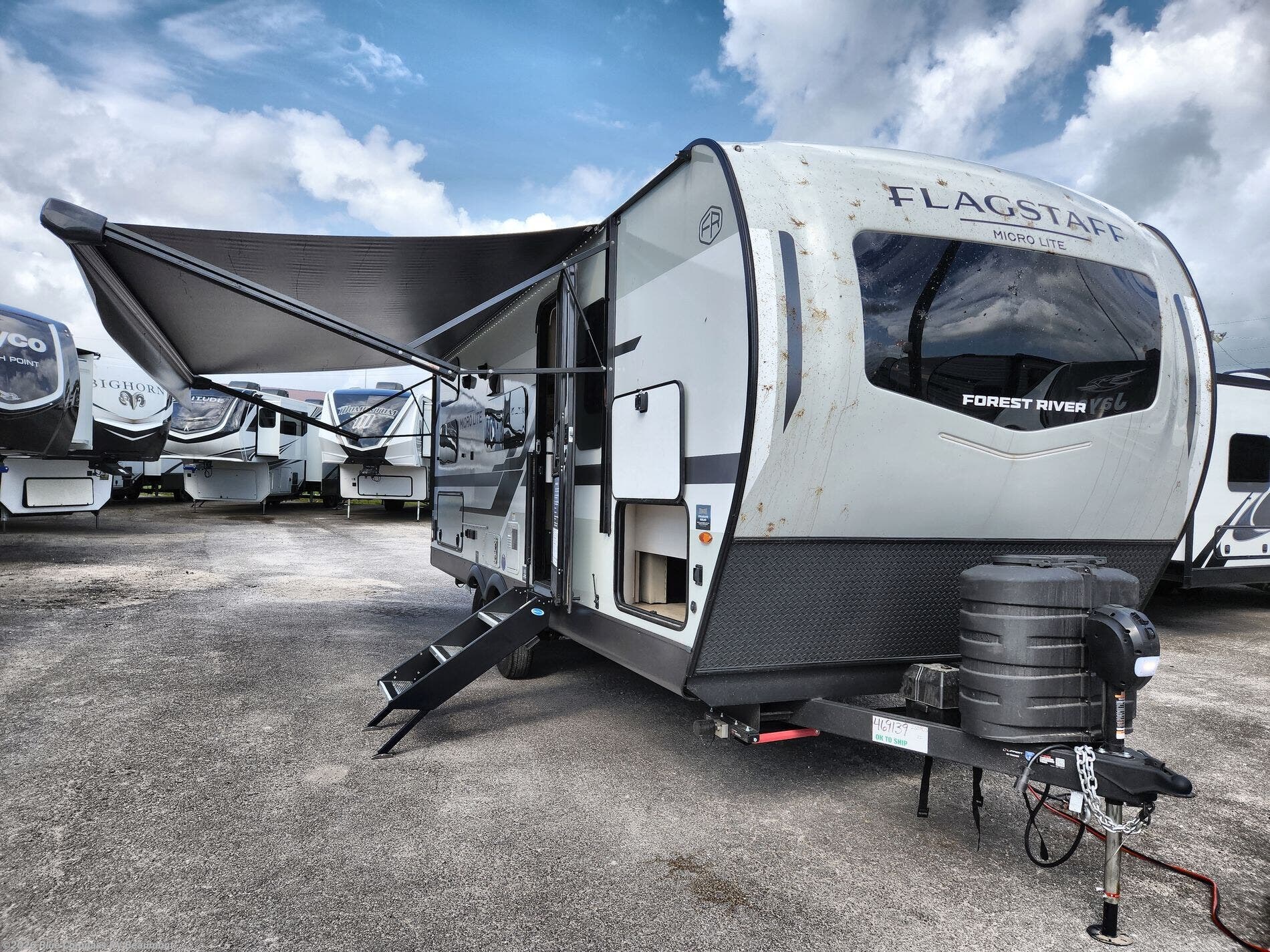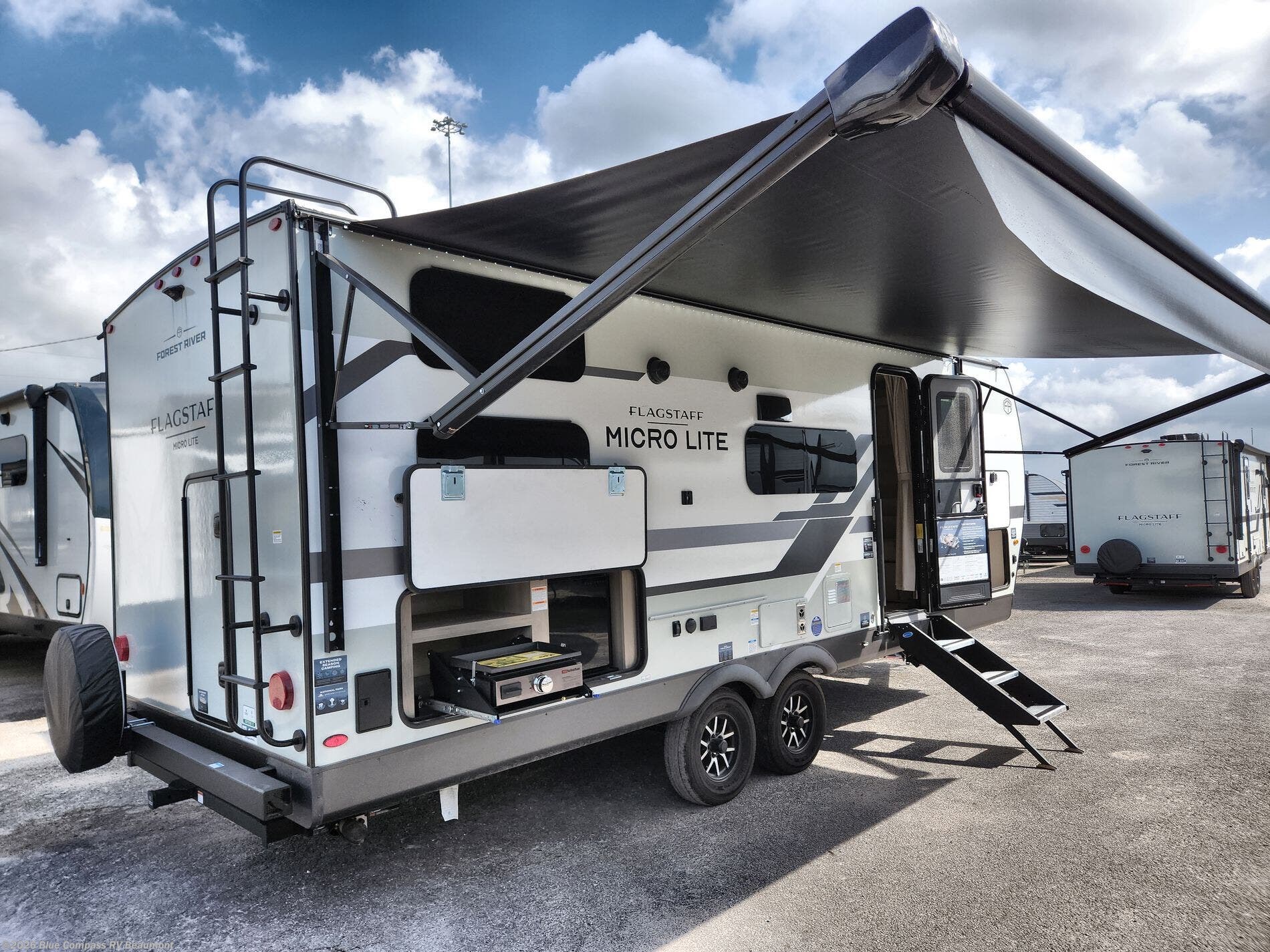 With any Flagstaff Micro Lite travel trailer by Forest River you will enjoy lightweight towing, durable construction, and added interior comforts to make each trip memorable! Each model features RoadTech tire pressure monitoring, Dexter Torflex axles, and nitrogen-filled Goodyear endurance tires for smooth towing from home to campground. The 6-sided aluminum framed construction provides a strong foundation so you can enjoy your RV for years to come, plus the radiant foil in the front cap, underbelly and slides help insulate your trailer. Additional exterior features include a 200W solar panel, back-up camera prep, frameless windows, and slam baggage doors. Each model includes the Great Expectations Package with roller shades, solid surface kitchen countertops, and hidden hinge cabinet doors. There is also an exterior hot/cold water port, outside speakers, a power tongue jack and stabilizer jacks, plus many more conveniences.