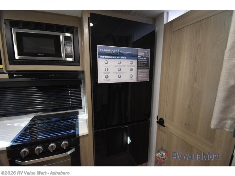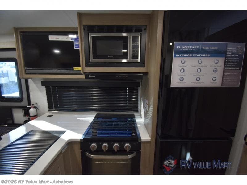 With any Flagstaff Micro Lite travel trailer by Forest River you will enjoy lightweight towing, durable construction, and added interior comforts to make each trip memorable! Each model features RoadTech tire pressure monitoring, Dexter Torflex axles, and nitrogen-filled Goodyear endurance tires for smooth towing from home to campground. The 6-sided aluminum framed construction provides a strong foundation so you can enjoy your RV for years to come, plus the radiant foil in the front cap, underbelly and slides help insulate your trailer. Additional exterior features include a 200W solar panel, back-up camera prep, frameless windows, and slam baggage doors. Each model includes the Great Expectations Package with roller shades, solid surface kitchen countertops, and hidden hinge cabinet doors. There is also an exterior hot/cold water port, outside speakers, a power tongue jack and stabilizer jacks, plus many more conveniences.