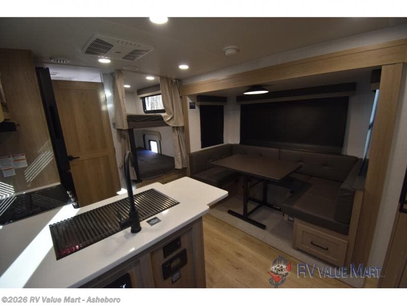 Camping in this single slide out travel trailer will make weekends at the campground comfy and hassle-free! Once you arrive, you can unload the pass-through storage, put out the 18' power awning, then relax in your camp chairs. And there is a full interior kitchen to make meals when you get hungry. Everyone can gather around the U-shaped dinette slide for meal times or game night, and there is a spacious pantry where you can store snacks! The bunk beds include a flip-up bottom bunk and an exterior bike door so you can easily pack camp gear away, and the full bath is right next to the bunks for easy nighttime use. Head up front to enjoy your own private bedroom with an RV queen bed, dual wardrobes, and flip-up storage!