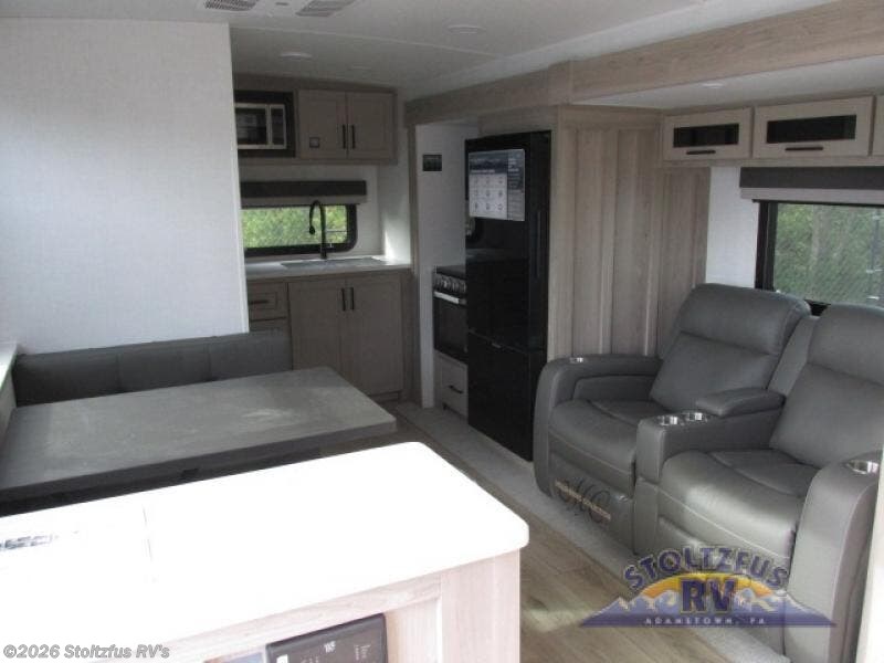 You'll be met with comfort at every turn in this spacious travel trailer. There is a large slide out which houses the theater seat, cooktop and refrigerator, plus a second slide out with a pantry/wardrobe for extra storage. You can sleep great each night on the front 60" x 74" queen bed, and there is flip-up storage underneath for extra blankets, boards games, and more. Once dinner has been made, you can dine at the booth dinette, or take your plate outdoors to relax under the 20' power awning. This unit also includes a full bath so you don't have to use the camp's facilities in the middle of the night!