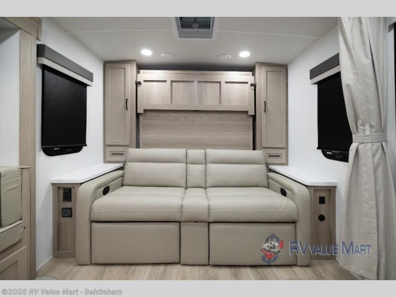 Camping in this double slide out travel trailer will make weekends at the campground comfy and hassle-free! Once you arrive, you can unload the pass-through storage, put out the 18' power awning, then make lunch on the three burner cooktop. Everyone can gather around the U-shaped dinette slide for meal times or game night, and there is a spacious pantry where you can store snacks! Within the bunkhouse you'll find a dream dinette and a flip-up bunk, plus a TV option if you want to add entertainment. And you're sure to appreciate the front 74" sofa with a Murphy bed, dual wardrobes, and a privacy curtain!